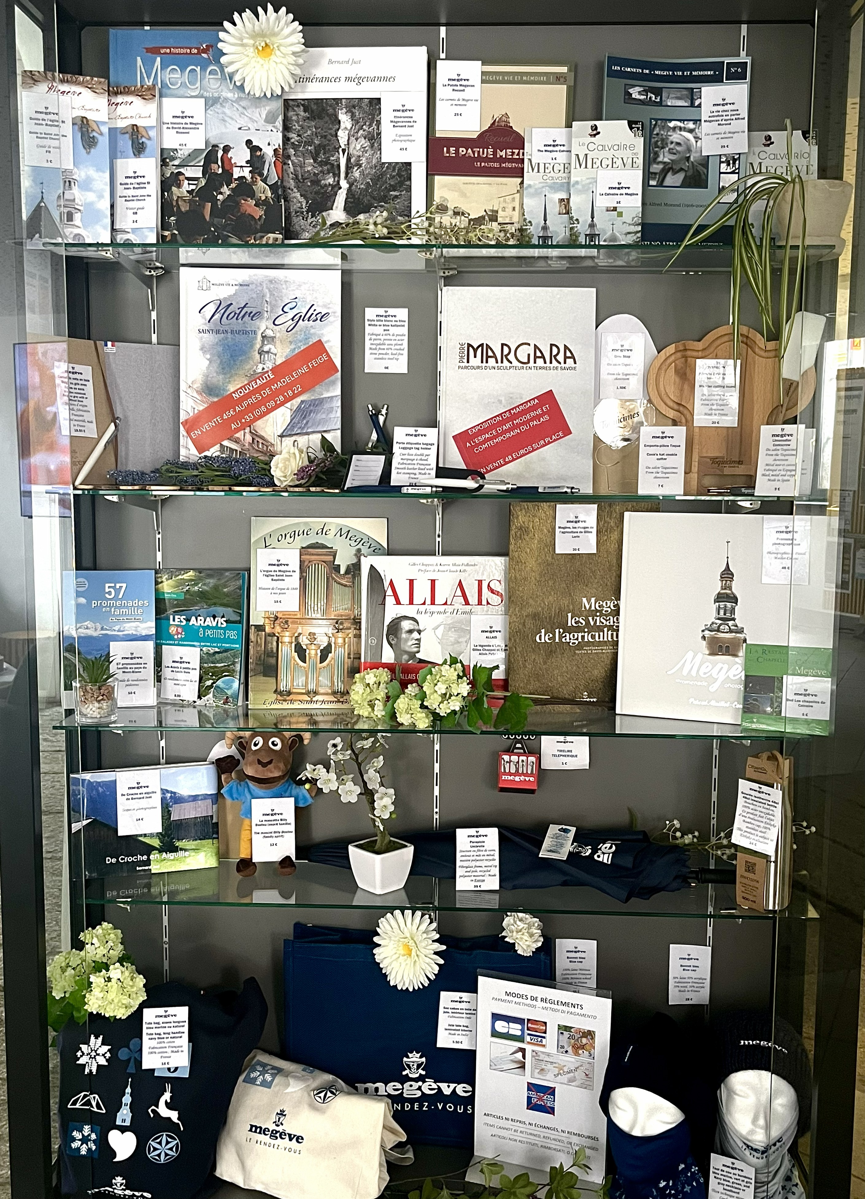 La boutique présente différents produits dont certains logotés Megève qui mettent en valeur la destination, son histoire et ses édifices historiques : cartes de promenades, cartes VTT, bonnets, parapluie, totebag, sac en jute, livres sur le patrimoine : le Calvaire, l’Histoire de Megève (voir photo "La boutique").