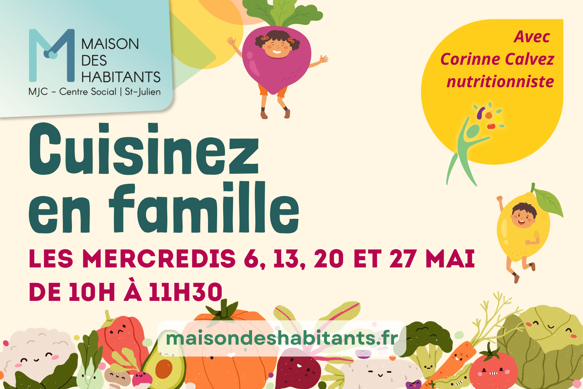 Les mercredis 6, 13, 20 et 27 mai, de 10h à 11h30, à la Maison des Habitants, venez partager un moment convivial en famille autour de la cuisine ! Au cours de ces ateliers, vous préparerez différentes recettes que vous aurez ensuite le plaisir de déguster ensemble à la fin de la séance.
