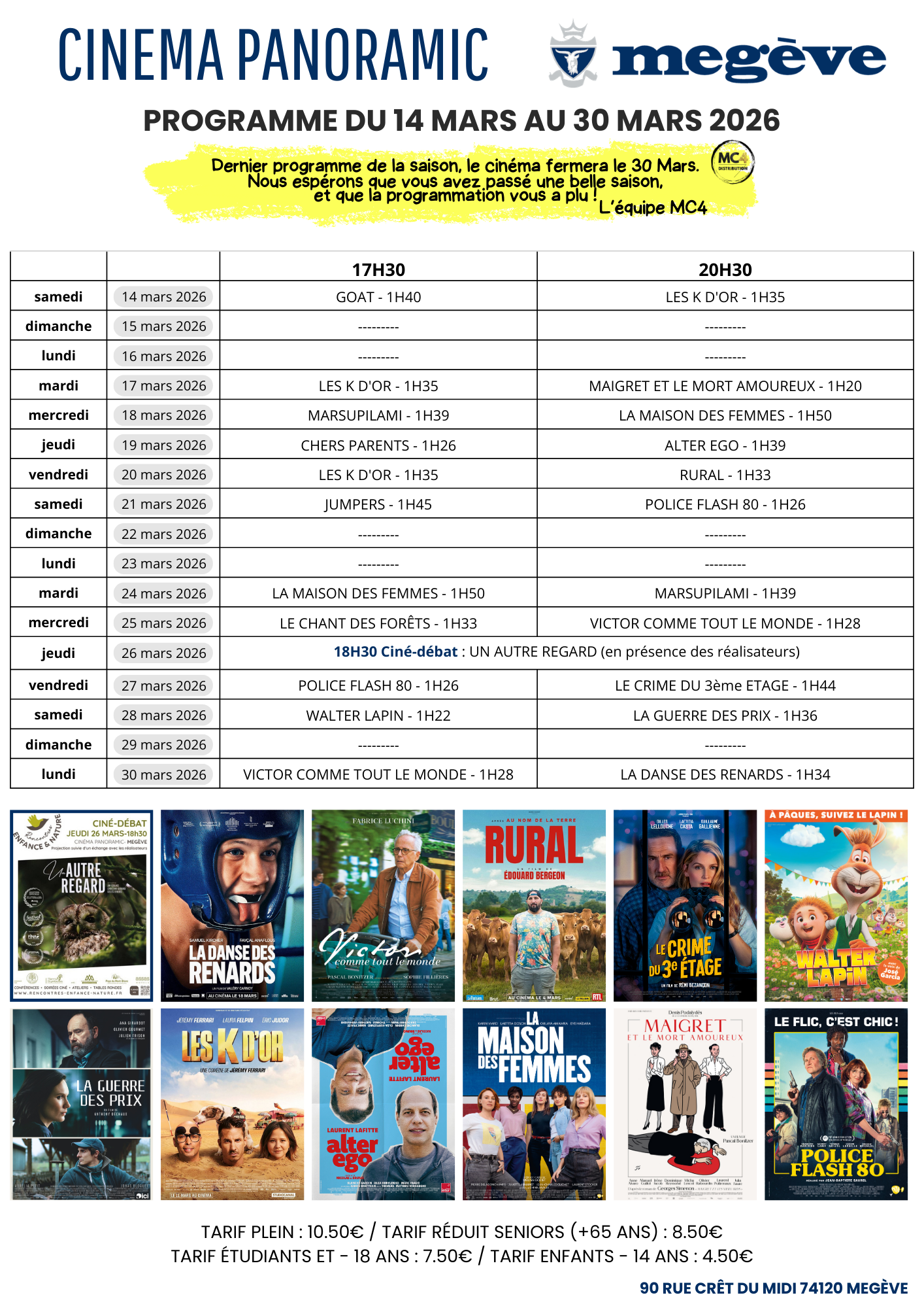 Le cinéma de Megève propose à la fois des films commerciaux, et des films d’auteur. Il y a deux séances par jour, et chaque jour un film différent est projeté !