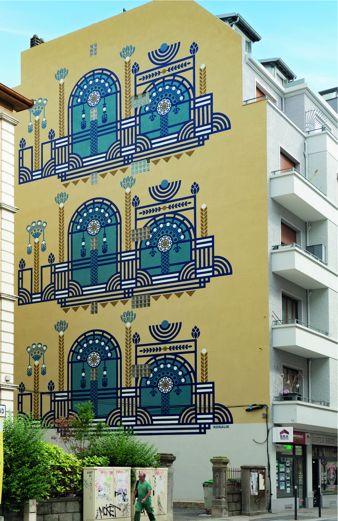 Cette fresque est un hommage aux cheminots, travailleurs de l’ombre à la fois engagés et acteurs du développement de la ville, composée par un personnage onirique principal central habillé en bleu de chauffe, l’habit identitaire des travailleur de voies.