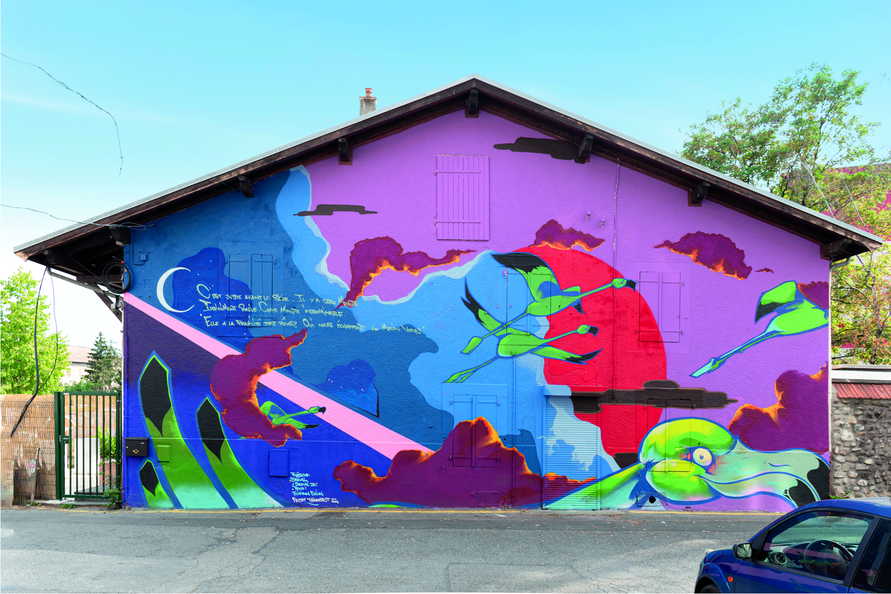 Cette fresque est un hommage aux cheminots, travailleurs de l’ombre à la fois engagés et acteurs du développement de la ville, composée par un personnage onirique principal central habillé en bleu de chauffe, l’habit identitaire des travailleur de voies.