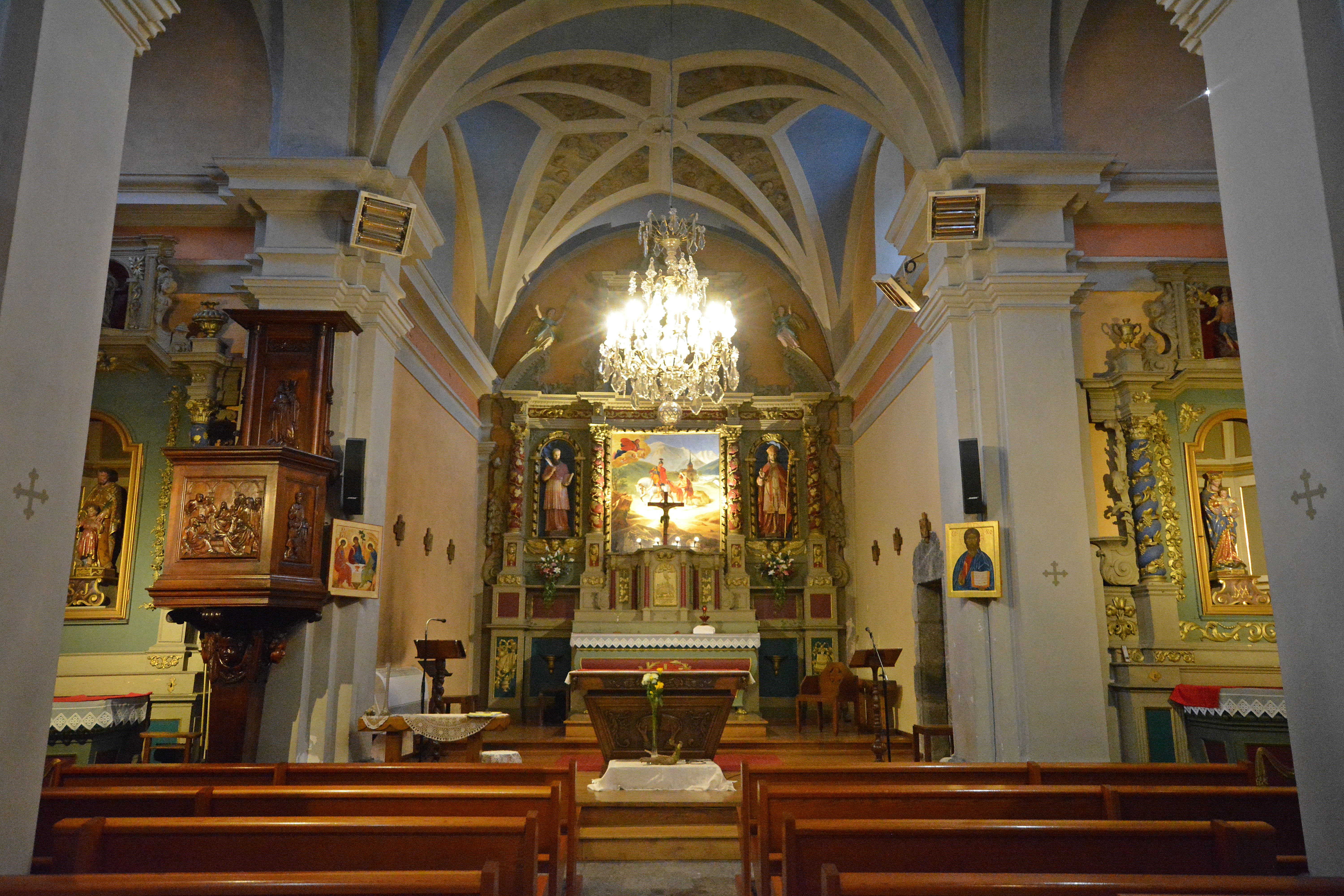 En entrant, vous serez immédiatement frappés par la beauté des fresques colorées qui ornent les voûtes et par les anges sculptés et peints qui veillent sur l’édifice. L’aménagement intérieur, riche en détails, mêle des éléments du baroque populaire régional et des apports plus rigides du XIXe siècle.