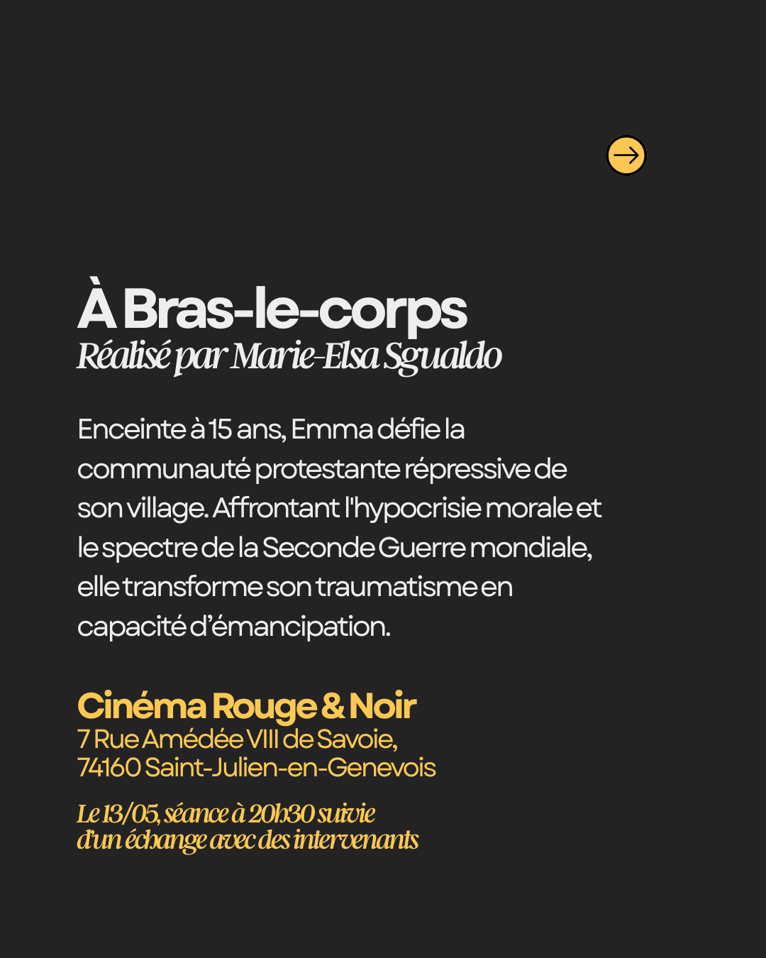 L’Alliance Française de Genève met à l’honneur la collaboration transfrontalière au Cinéma Rouge & Noir de Saint-Julien-en-Genevois. Rejoignez-nous pour une soirée exceptionnelle avec la projection en avant-première française du film "À bras-le-corps". La séance sera suivie d’un temps d'échange privilégié pour explorer ensemble les sujets abordés par l'œuvre.