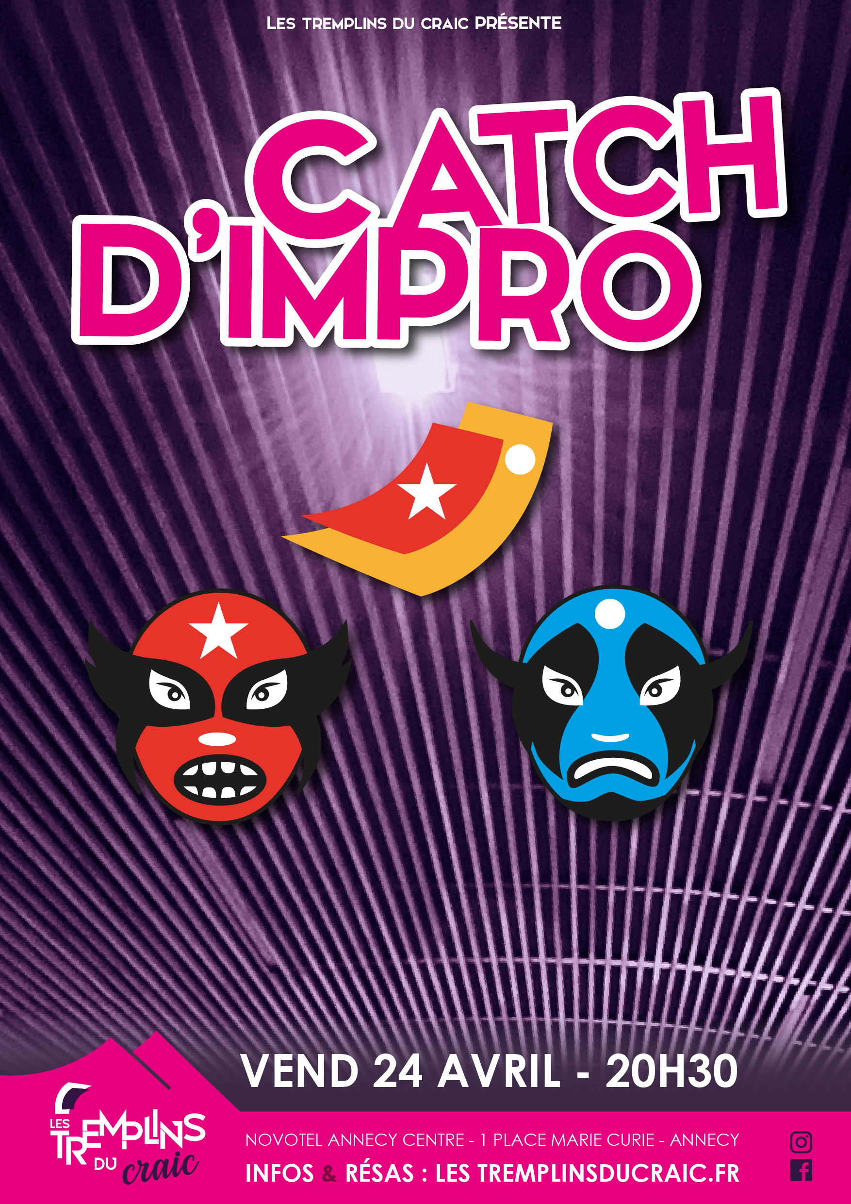 Savez-vous ce qu’est un catch d’impro ? 1 arbitre et 2 équipes de 2 improvisatrices s’affrontent sur la scène. Les spectateurs proposent des thèmes et en quelques secondes de réflexions, les voilà déjà sur les planches ! Au coup de sifflet, c’est toi public qui vote pour le duo que tu juges le meilleur !