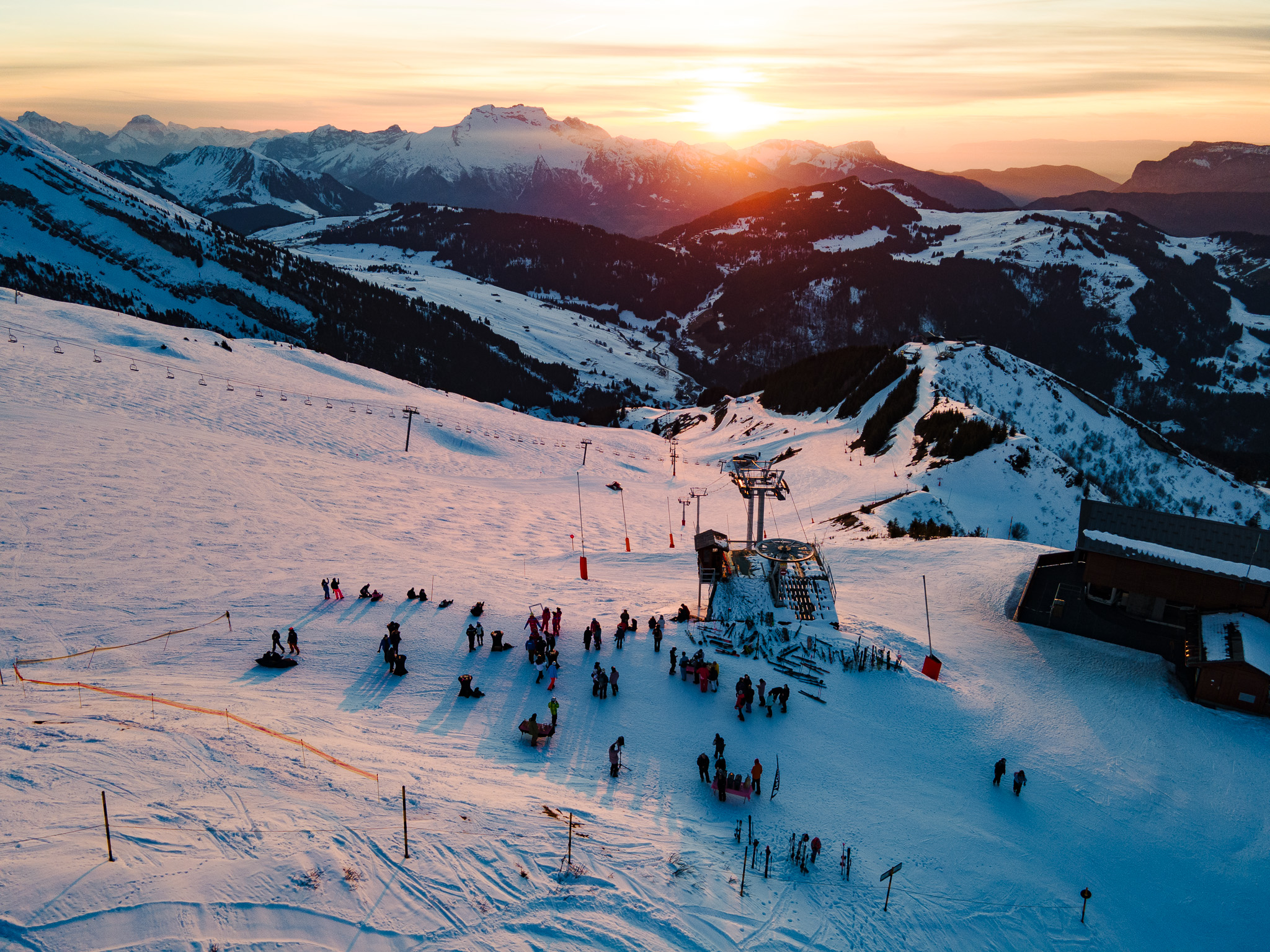 Une fois la nuit tombée, la joyeuse petite équipe chaussera les skis pour la dernière descente, encadrés par nos moniteurs, sur les pistes rosées par le soleil presque couché... avant de regagner l'effervescence du village.