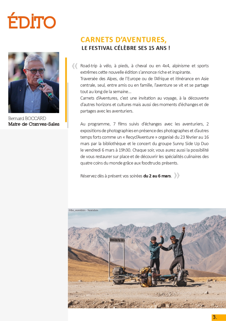 Cette année le festival Carnets d’Aventures célèbre ses 15 ans ! Road-trip à vélo, à pieds, à cheval ou en 4x4, alpinisme et sports extrêmes cette nouvelle édition s’annonce riche et inspirante. Traversée des Alpes, de l’Europe ou de l’Afrique et itinérance en Asie centrale, seul, entre amis ou en famille, l’aventure se vit et se partage tout au long de la semaine…