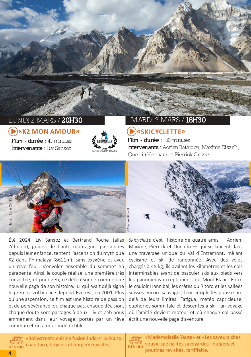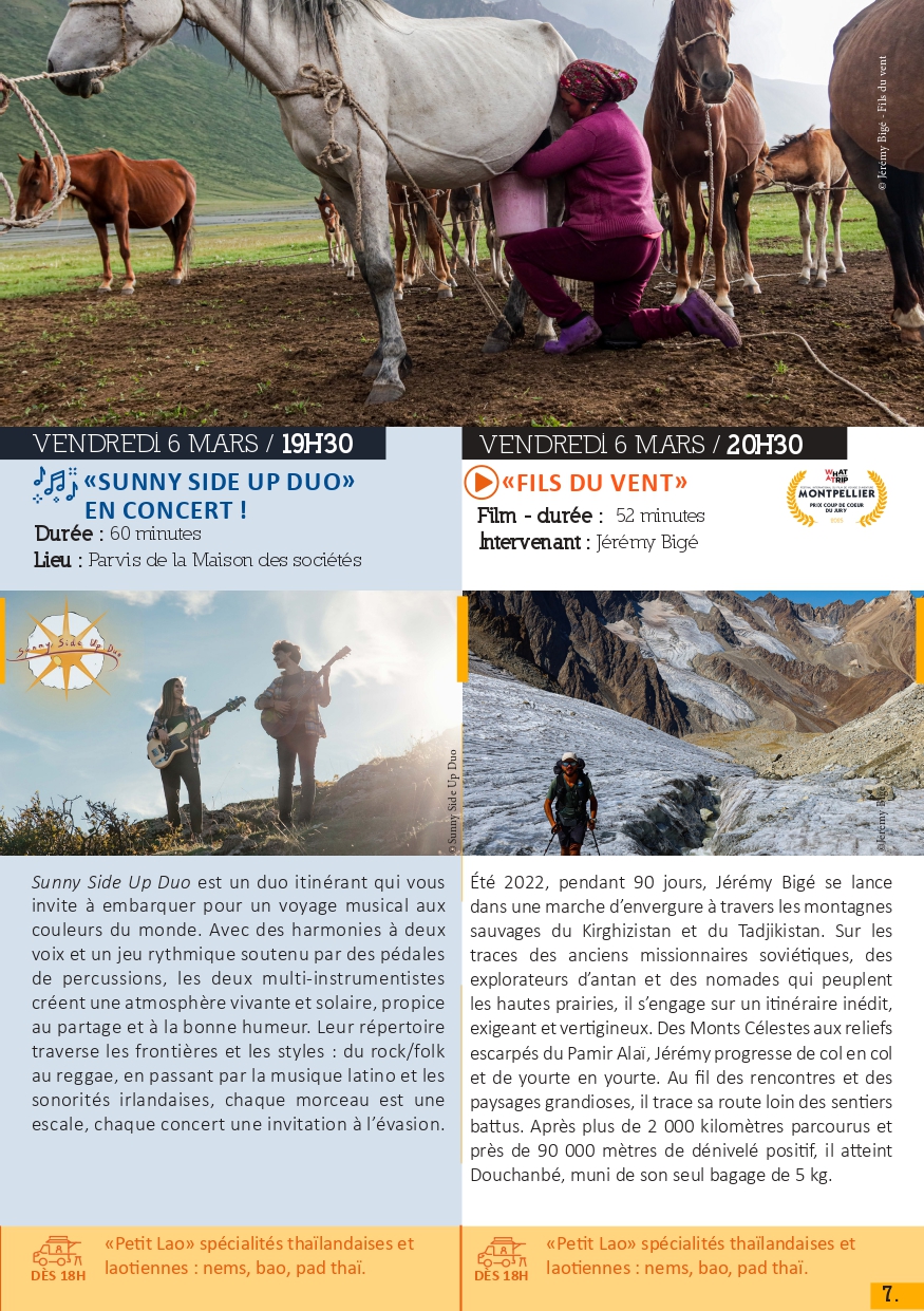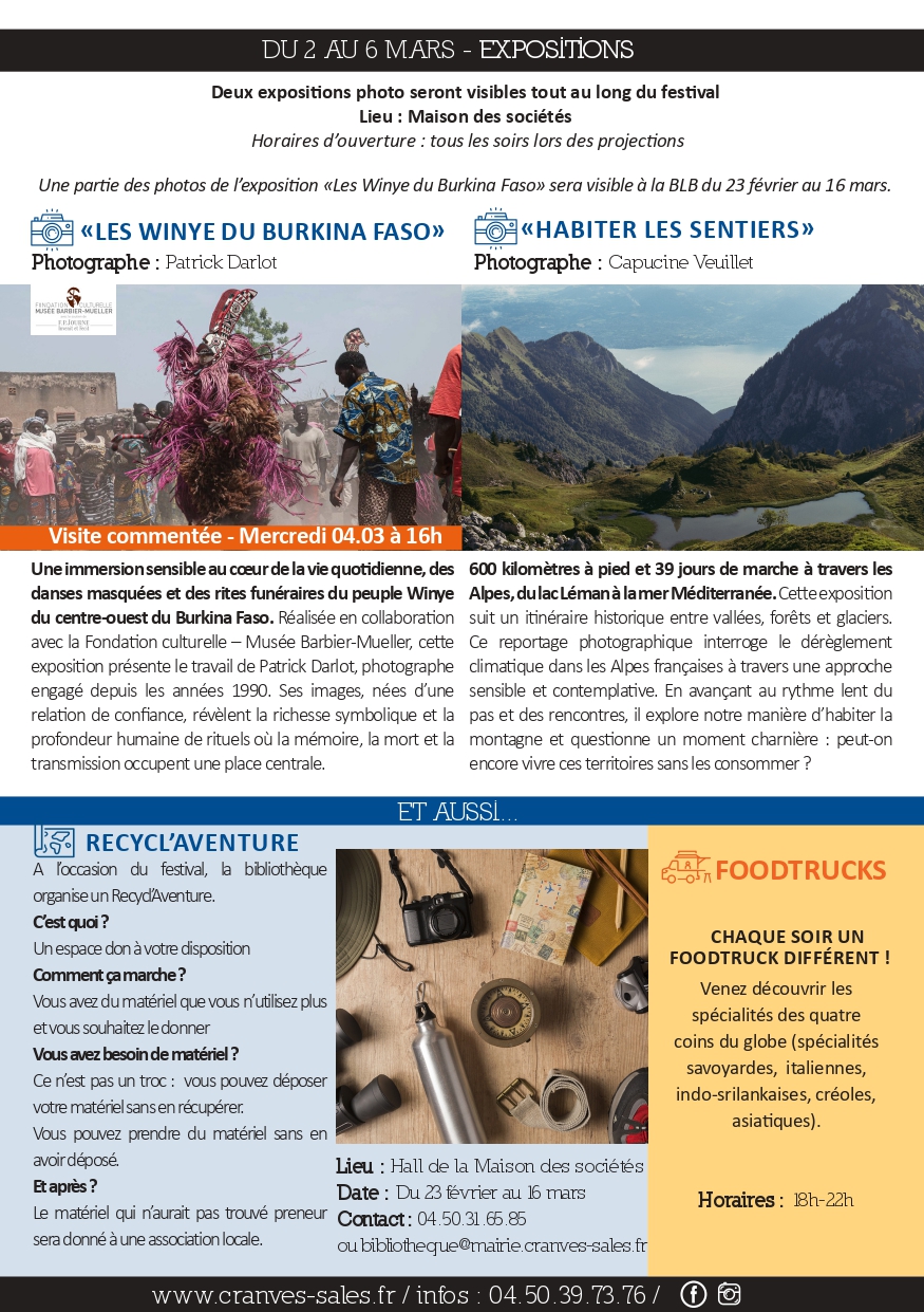 Au programme, 7 films suivis d’échanges avec les aventuriers, 2 expositions de photographies en présence des photographes, séances de dédicaces et d’autres temps forts comme un « Recycl’Aventure » organisé du 23 février au 16 mars par la bibliothèque et le concert du groupe Sunny Side Up Duo le vendredi 6 mars à 19h30. Chaque soir, vous aurez aussi la possibilité de vous restaurer sur place et de découvrir les spécialités culinaires des quatre coins du monde grâce aux foodtrucks présents.