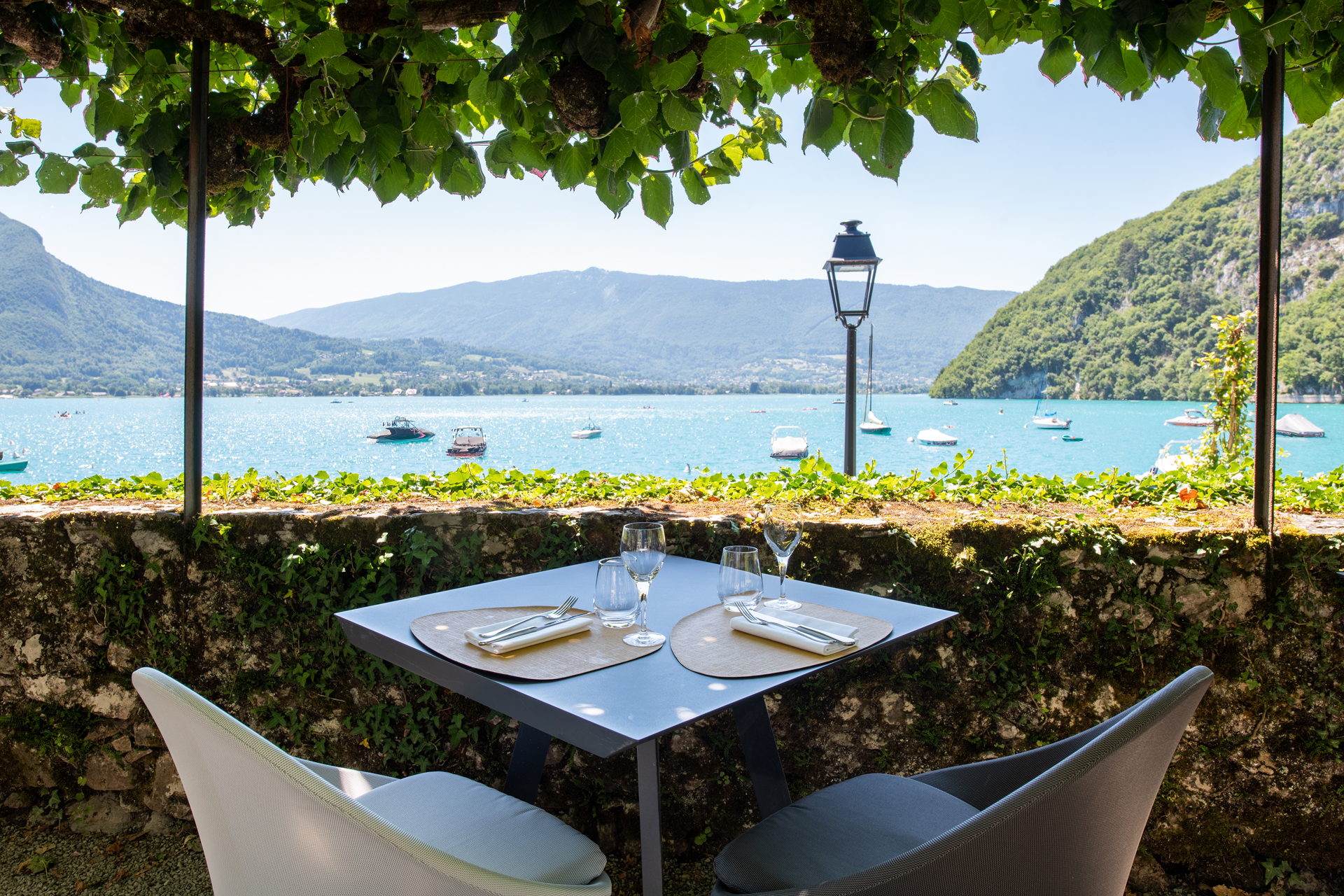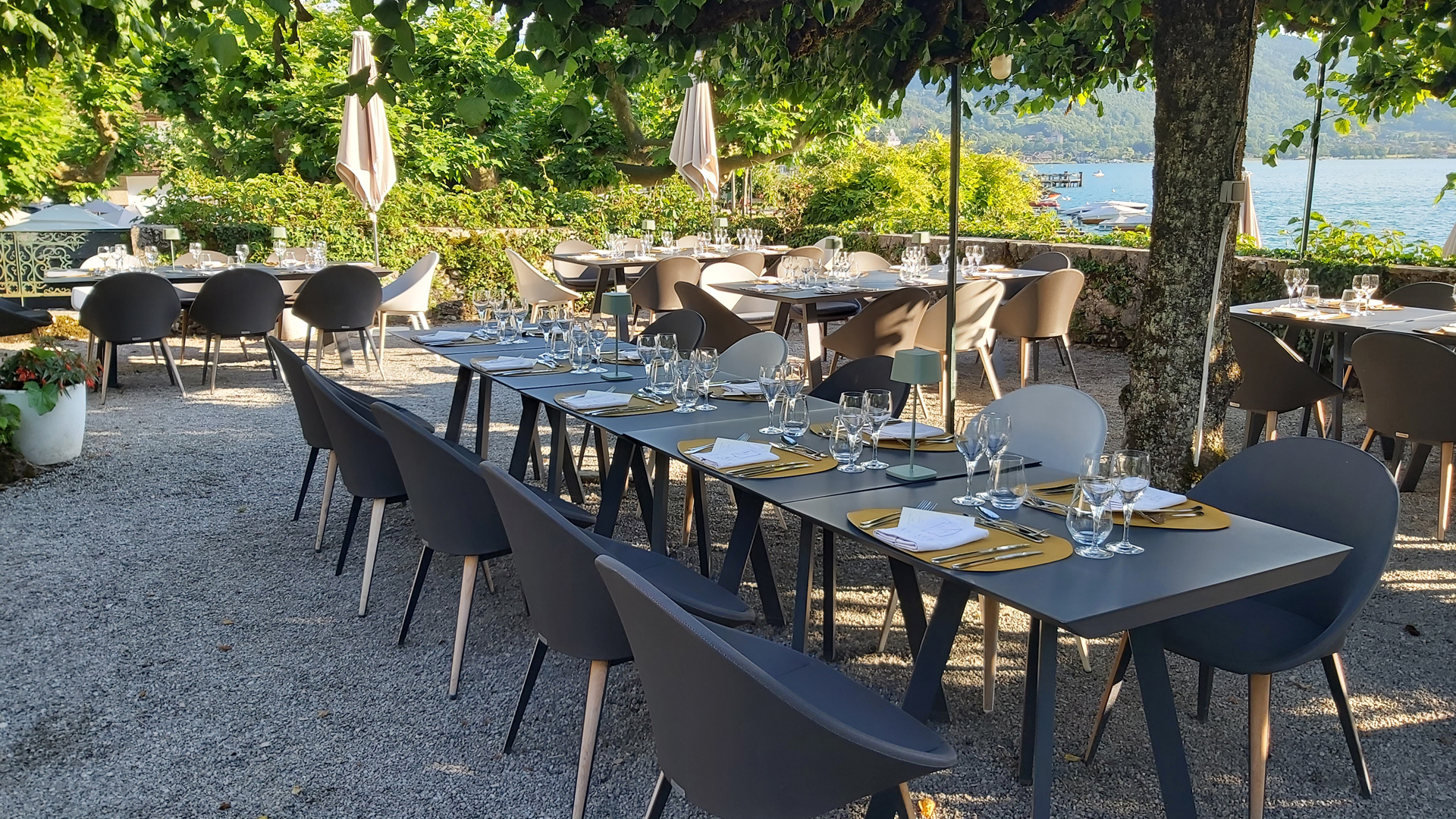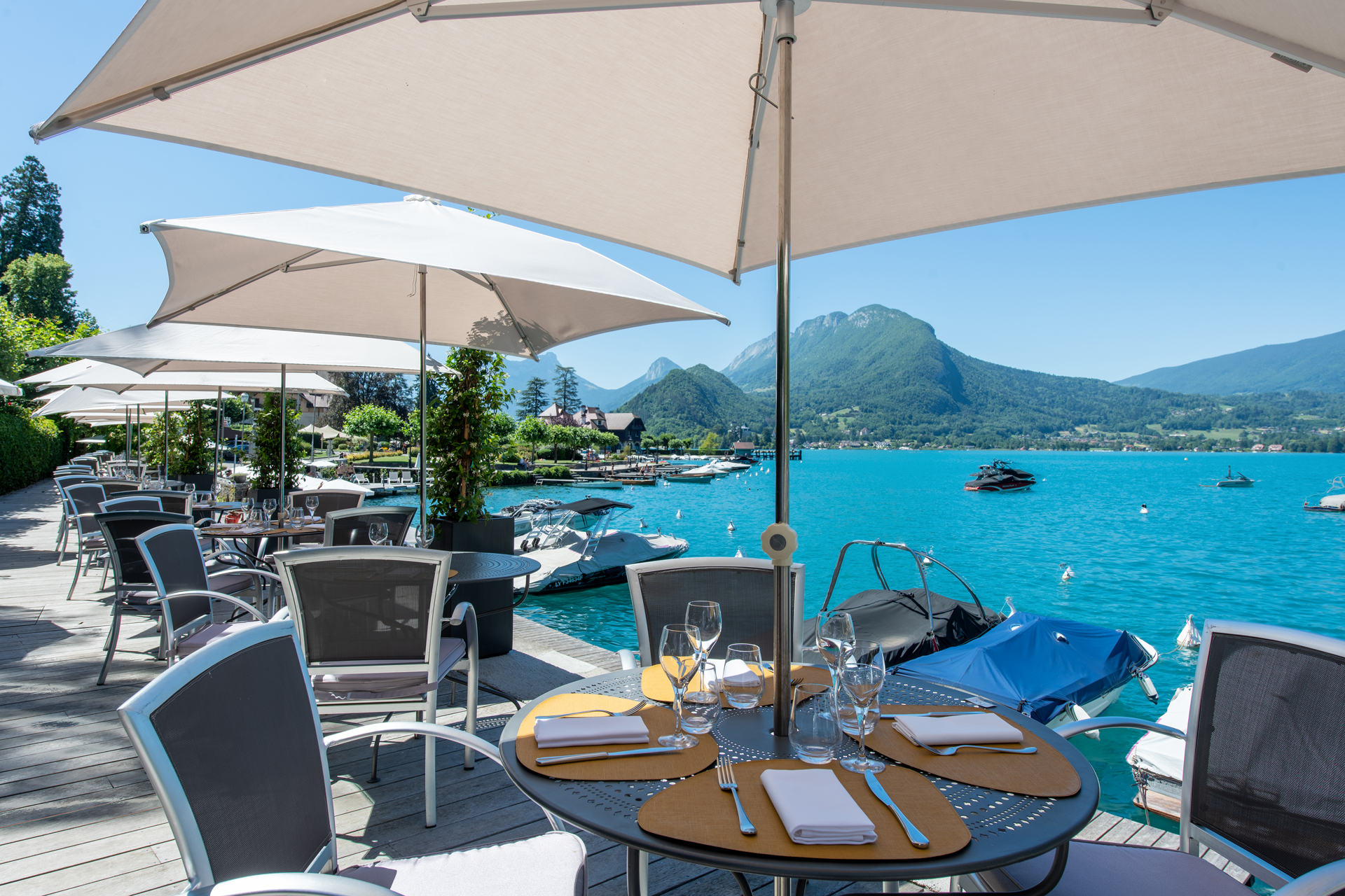 Très belle cuisine servie dans le restaurant re-décoré en 2022 ou sur les terrasses ombragées au plus près du lac d'Annecy.