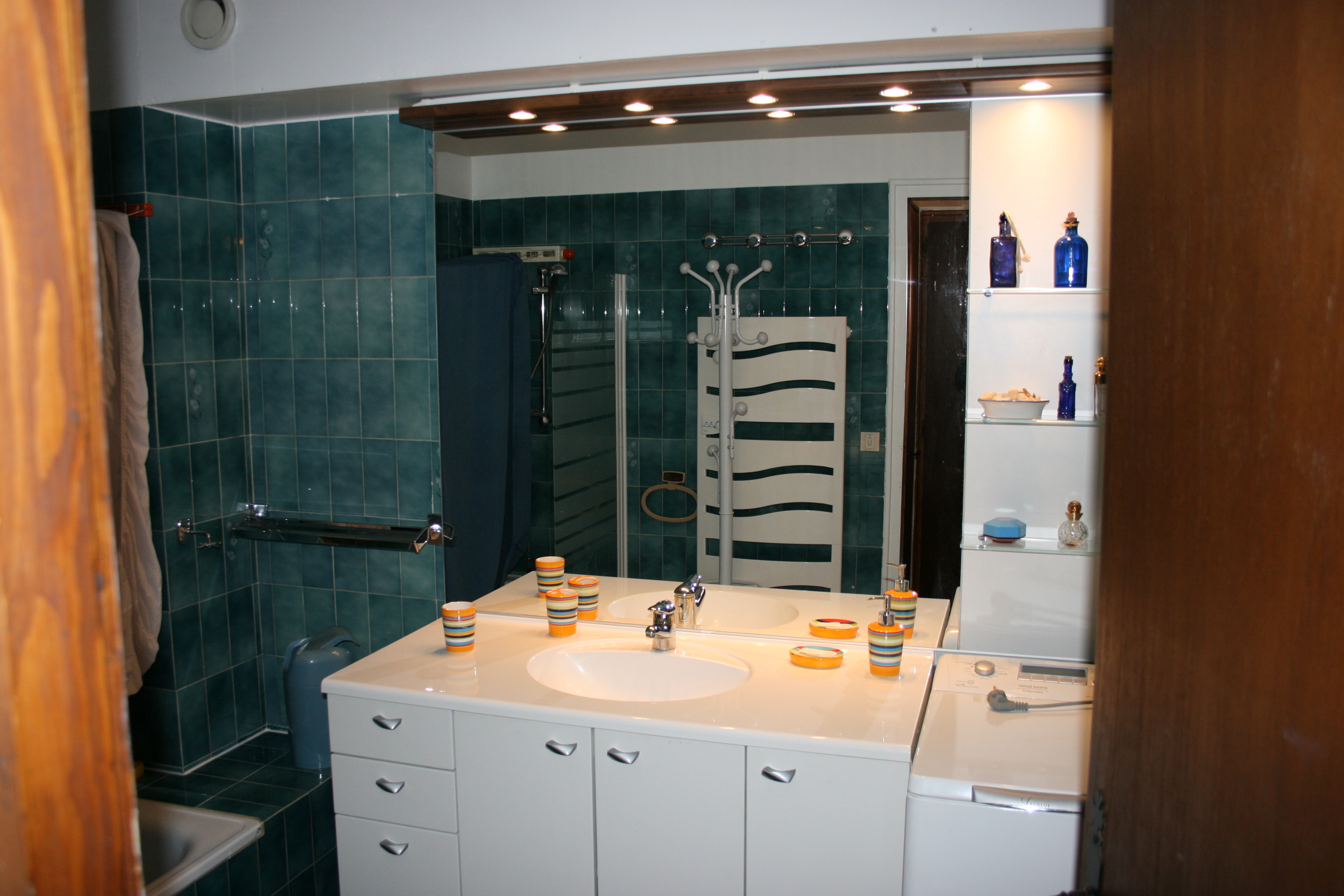 baignoire, lavabo sur meuble, grand miroir, radiateur sèche serviettes,2 patères, fil à linge et portant