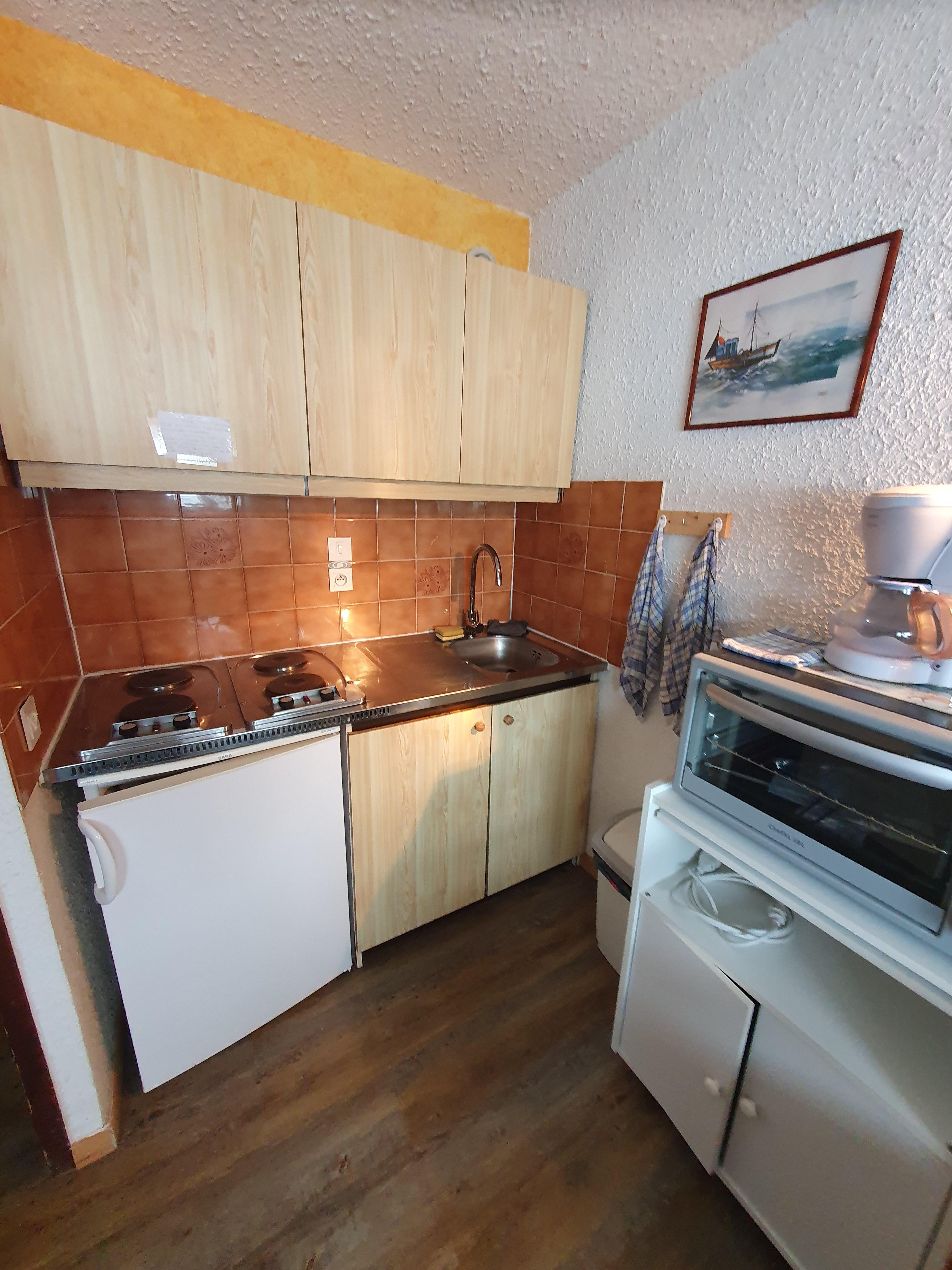 Coin cuisine dans le séjour. 4 feux électriques. Mini four. Réfrigérateur avec bac congélateur.