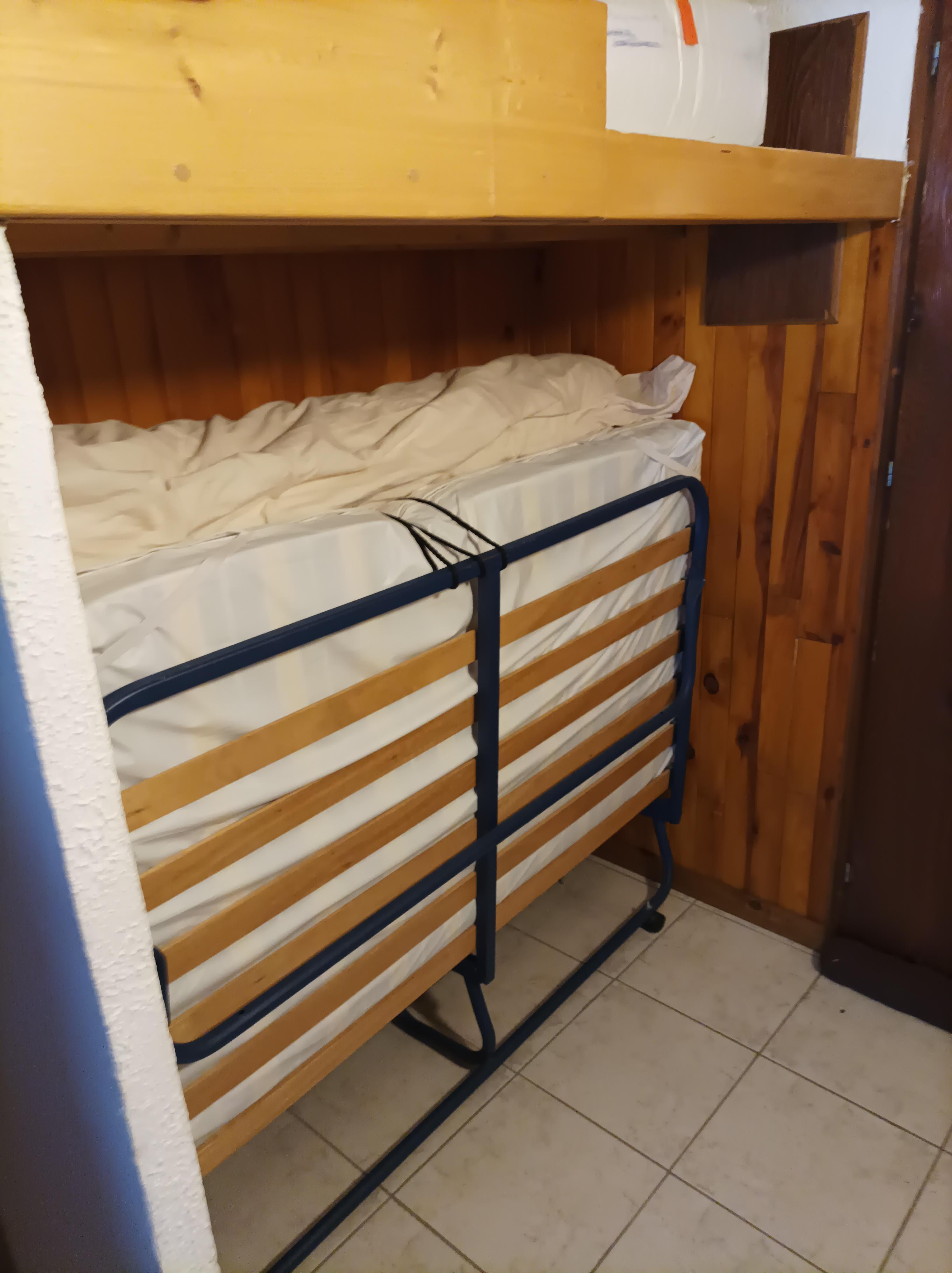Un coin montagne avec 1 lit surélevé 1 personne et 1 lit 2 personnes .