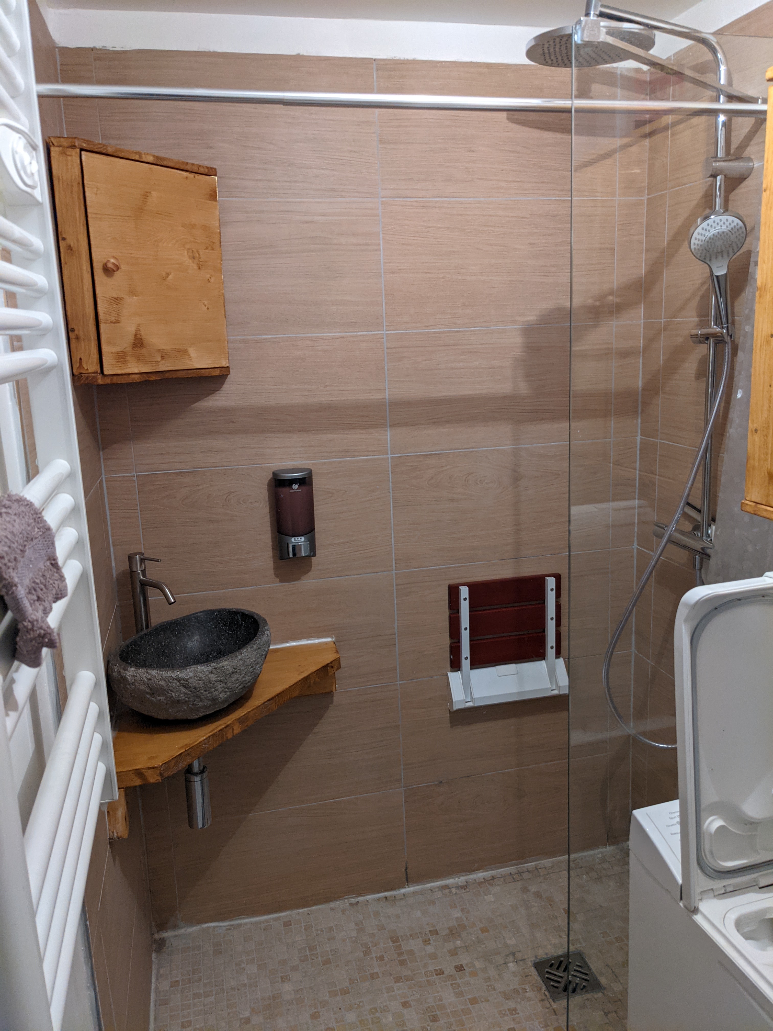 Douche (avec petite rampe d'accès amovible en bois) et WC.
