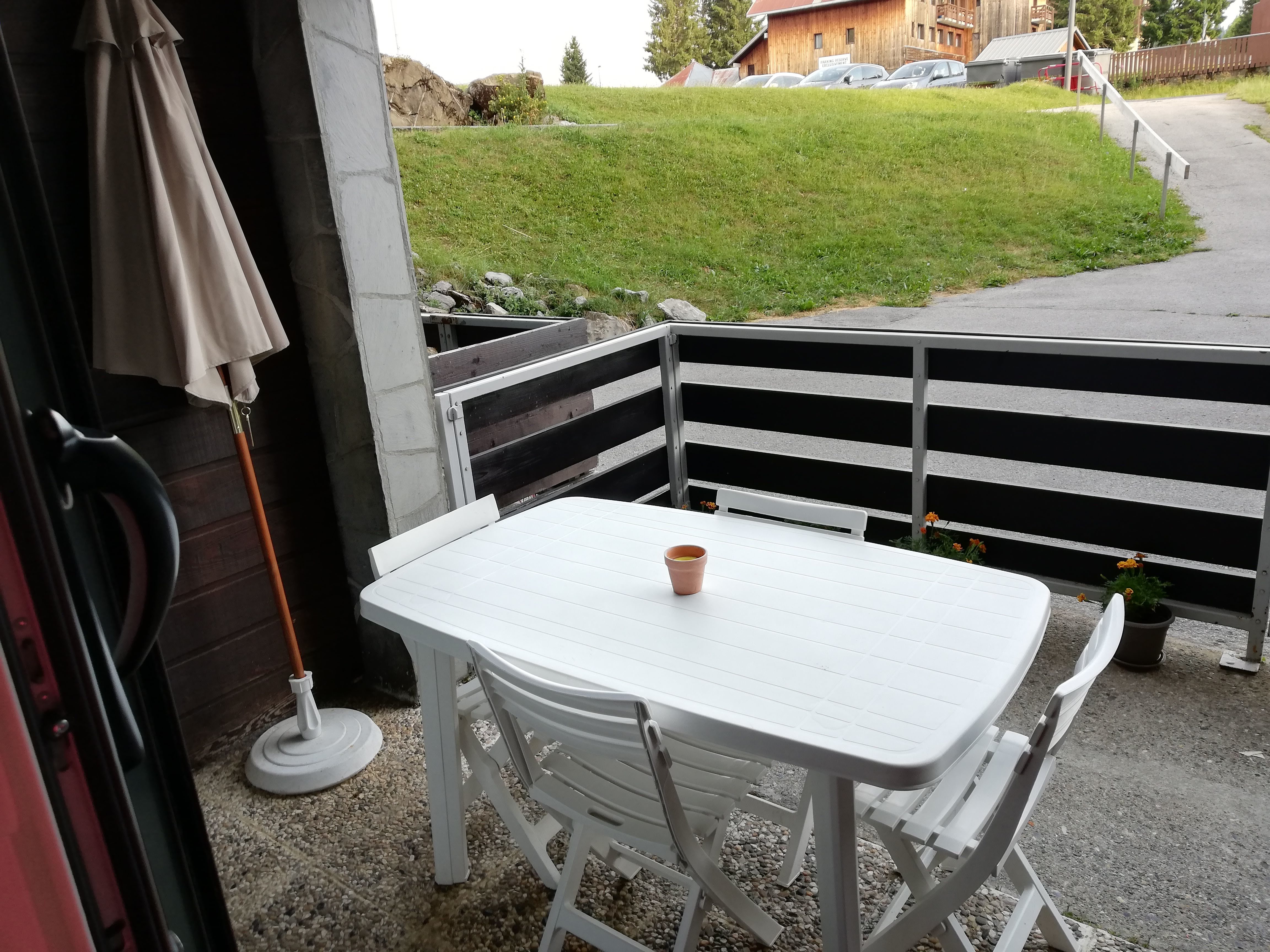 Le locataire a la jouissance d'un casier à skis et d’une terrasse équipée d’un mobilier de jardin avec rampe d'accès amovible en bois.