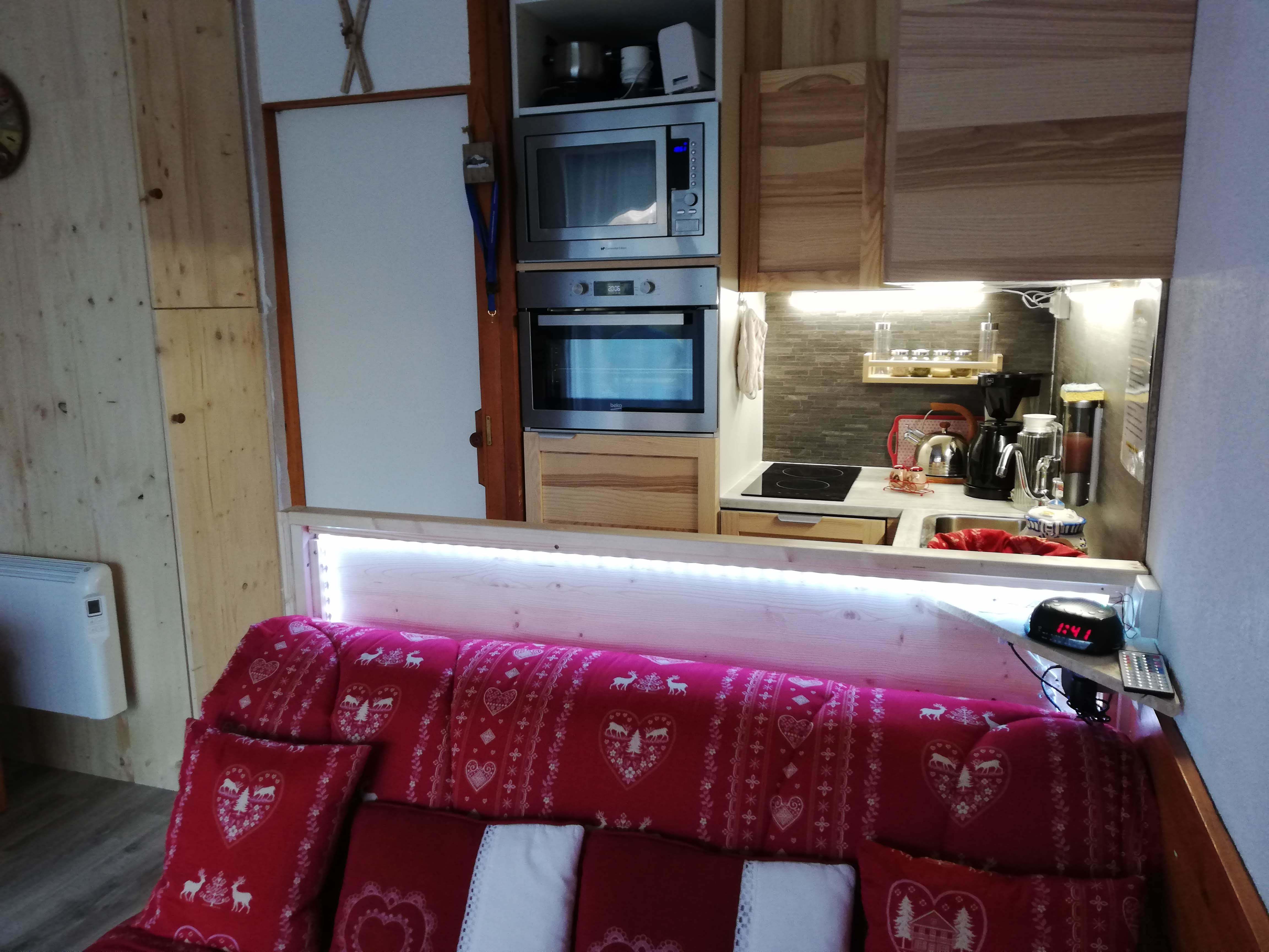 Coin cuisine dans le séjour. 2 feux électriques. Four et micro-onde. Blender chauffant. Réfrigérateur avec bac congélateur, lave-vaisselle.