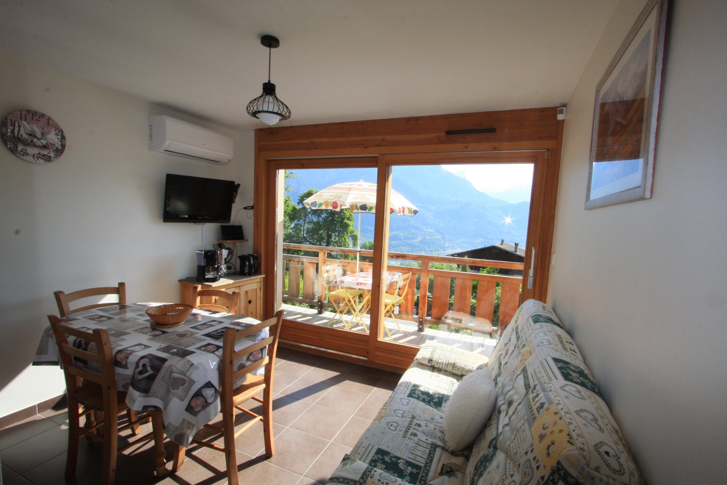 Appartement de 43 m2 dans un chalet au rez-de-chaussée avec parking situé sur le coteau de Sallanches face à la chaine du Mont Blanc, à 2 km du centre ville, et des commerces. L'appartement donne accès à un jardin privatif avec BBQ