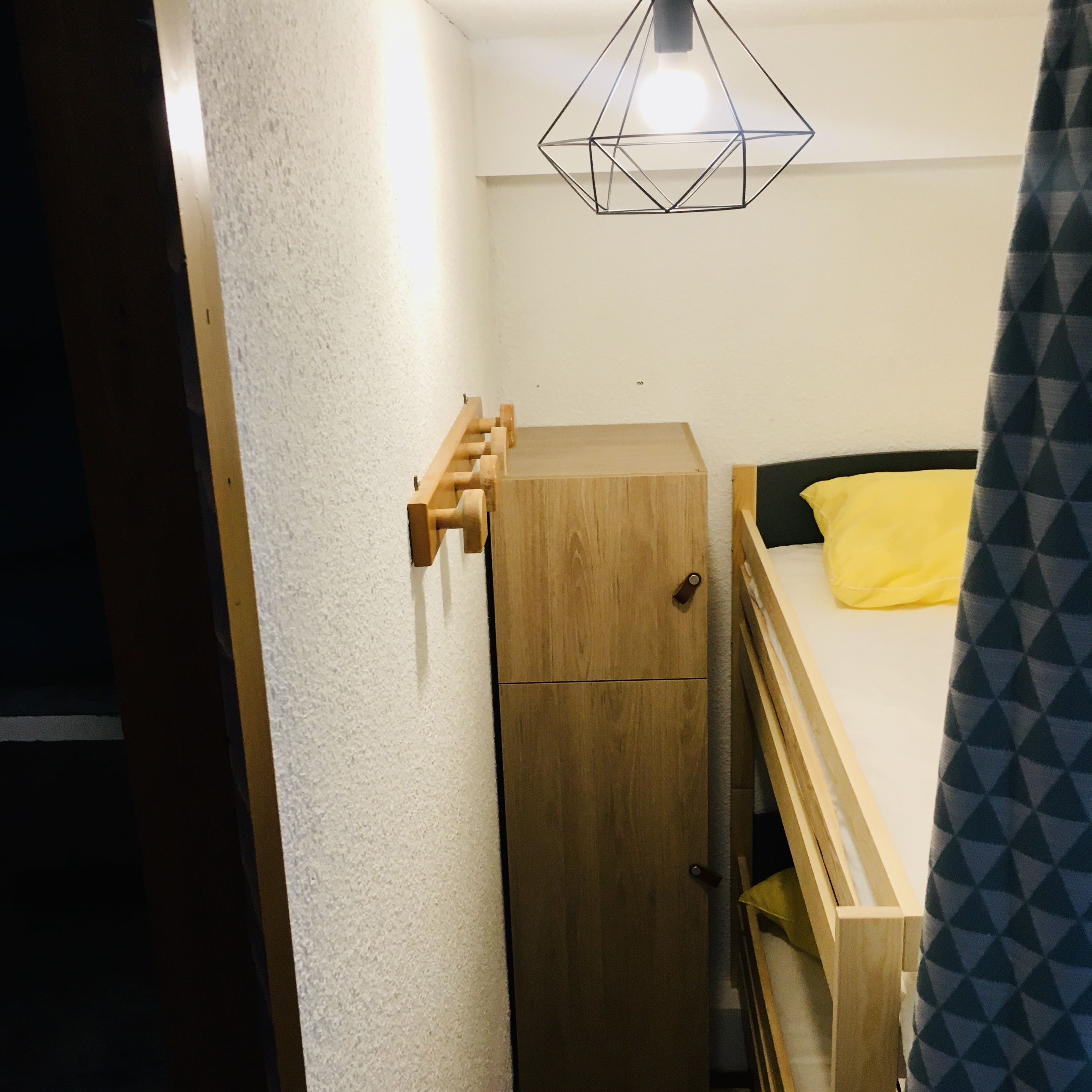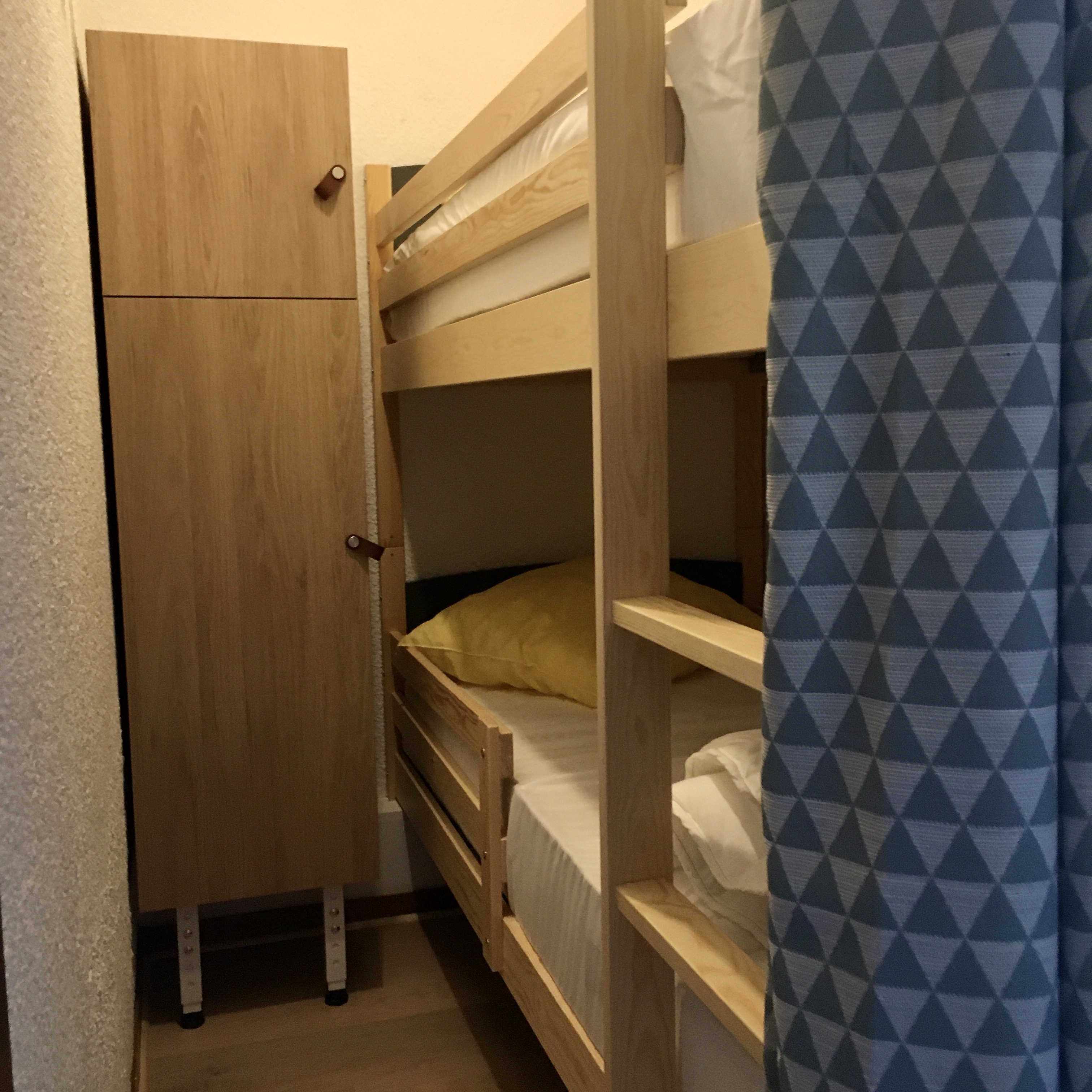 Coin montagne séparé et fermé par un rideau avec 2 lits superposés de 80.