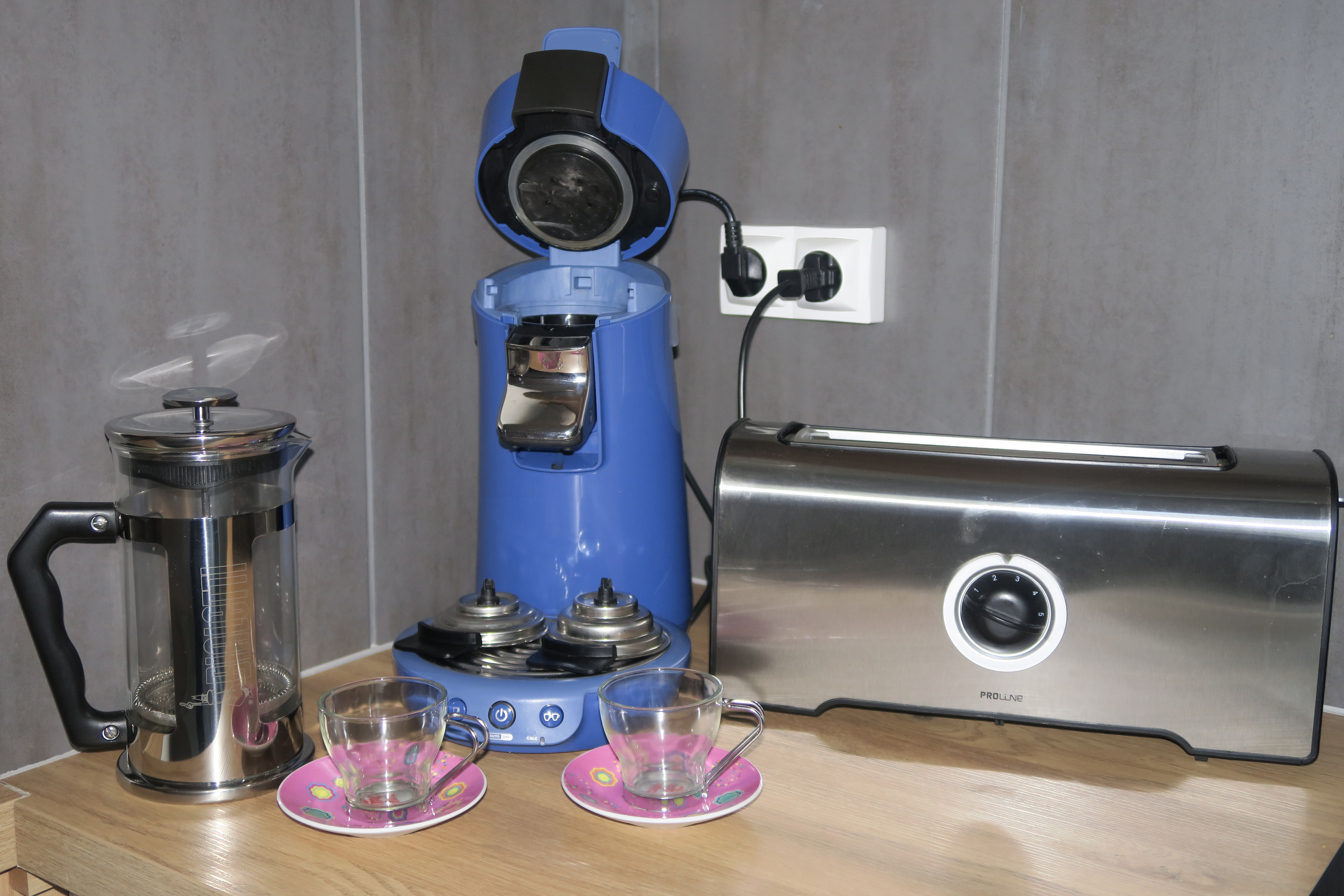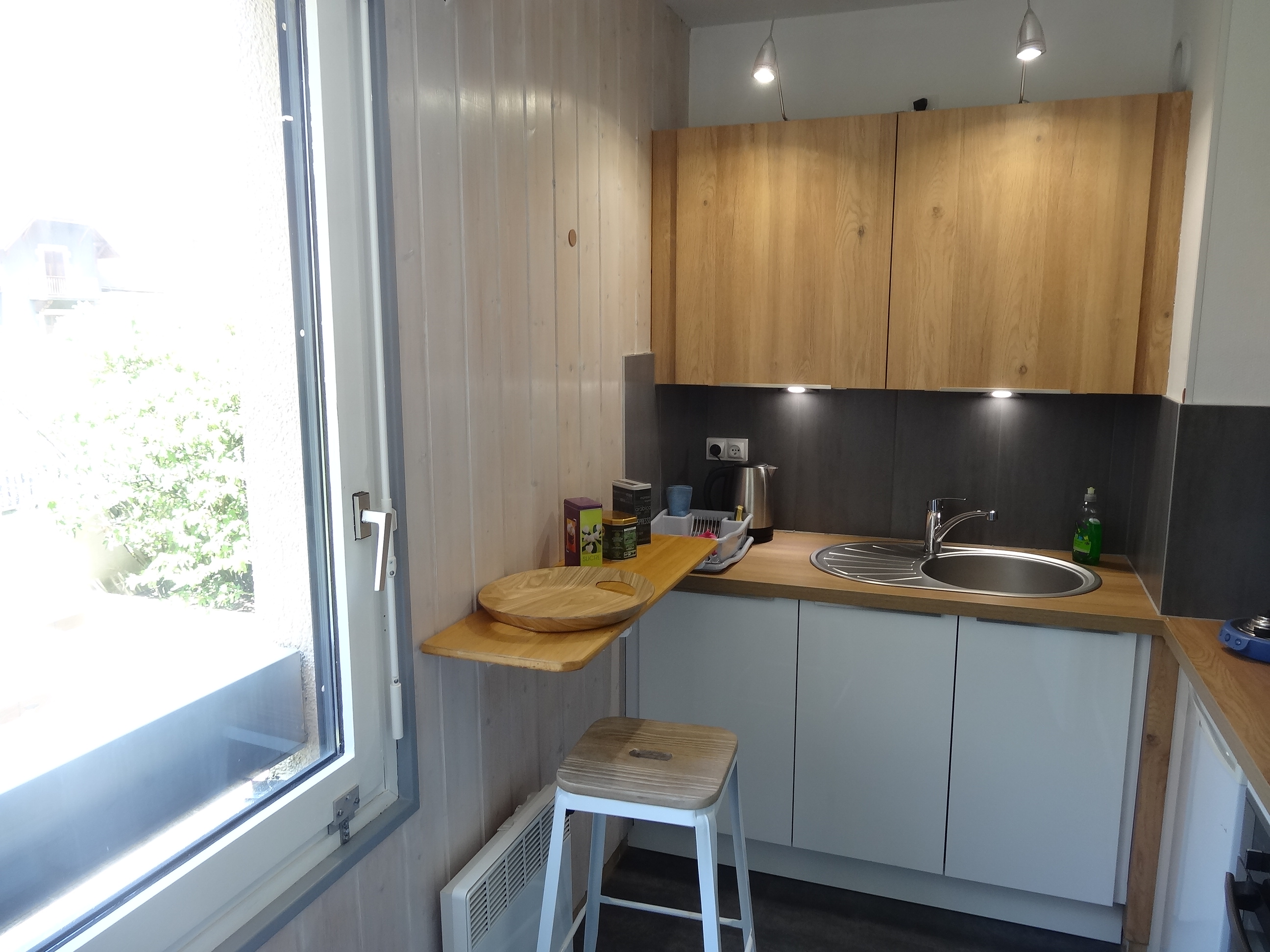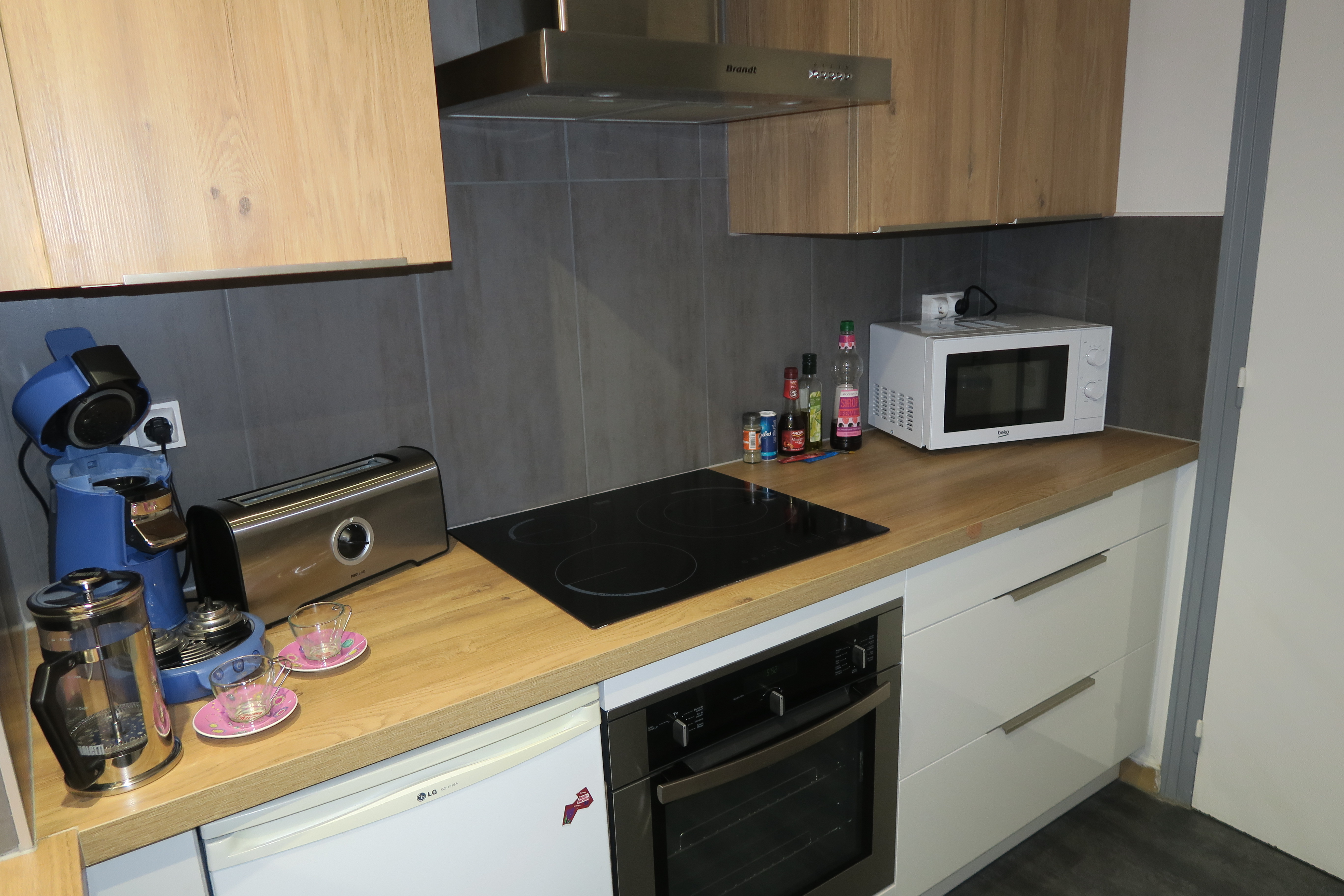- Cuisine neuve avec électro-ménager neuf (four, four à micro-ondes, plaque à induction, hotte, machine à café Senséo, machine à café à piston, grille-pain, bouilloire, vaisselle neuve)