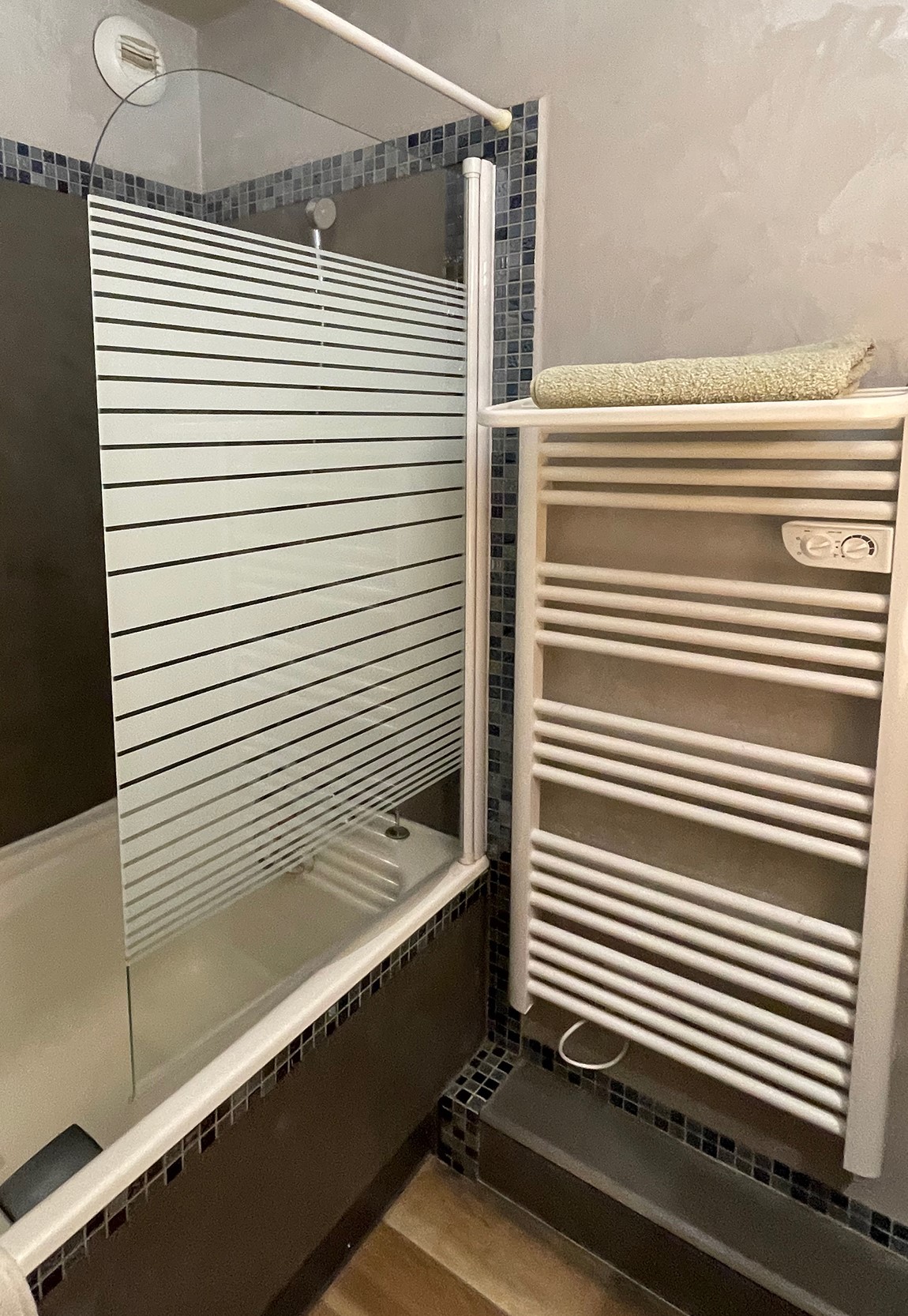 Salle d'eau avec baignoire et sèche serviettes. WC séparé.