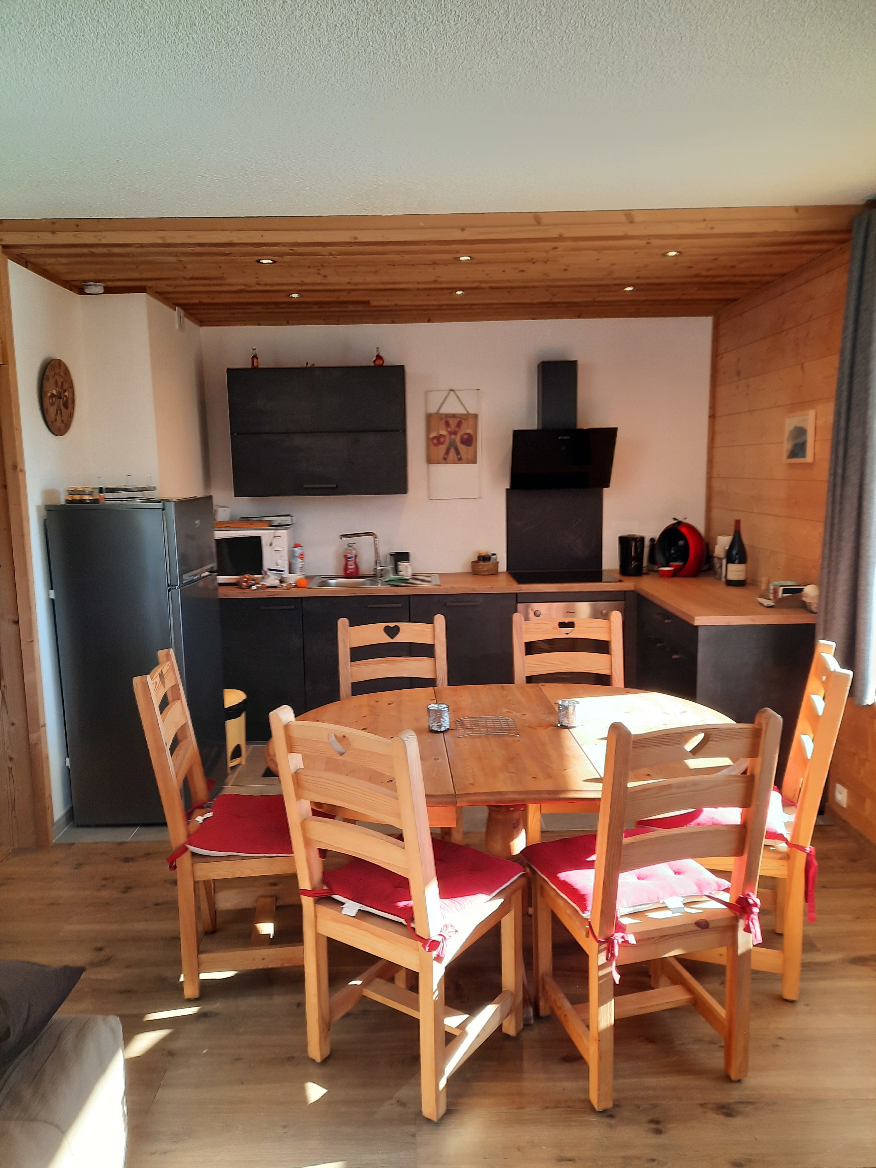 En L ouverte sur séjour, équipée d'une hotte, plaques de cuisson, four encastré, micro onde, lave vaisselle, frigo, dolce gusto, raclette, fondue, etc.