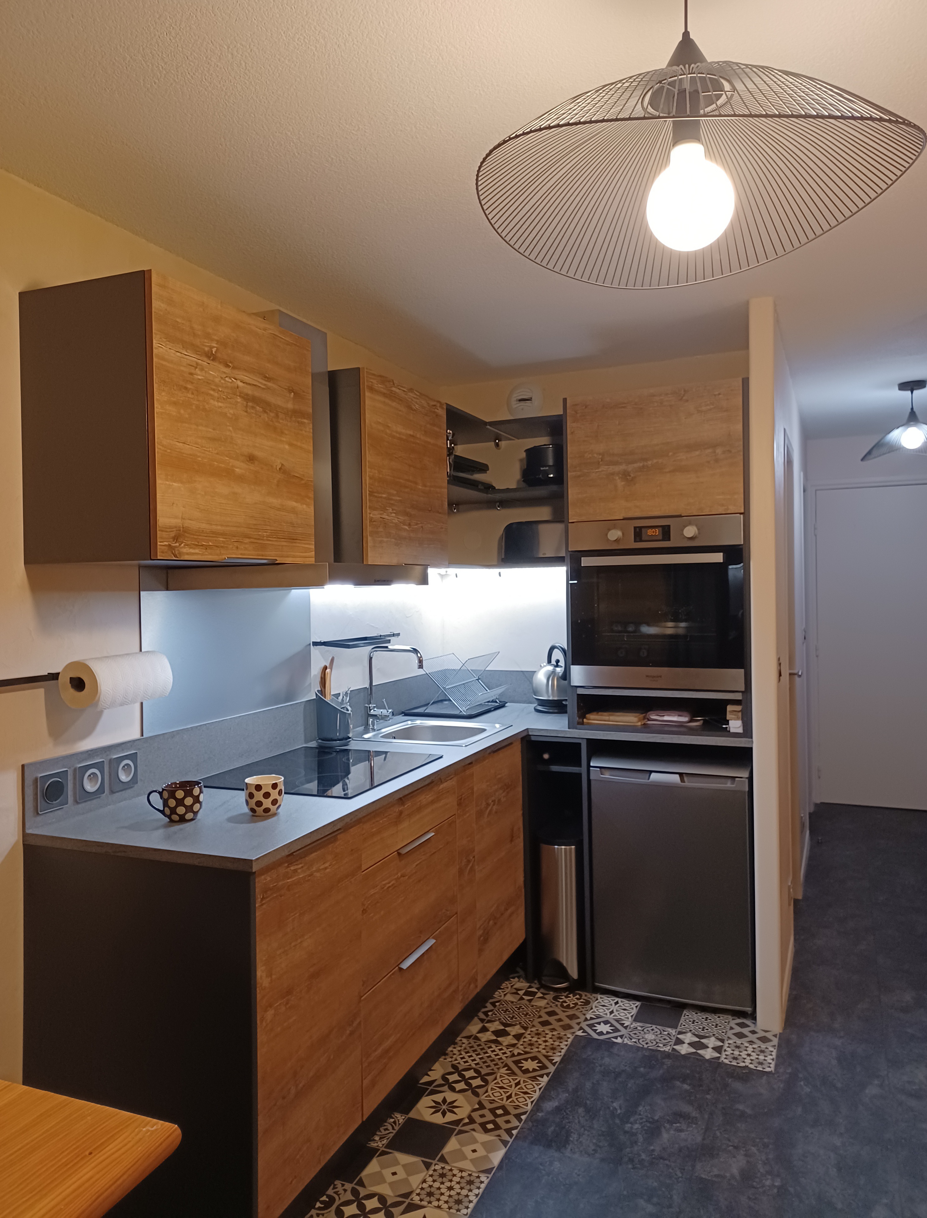 Coin cuisine dans le séjour. Plaque vitrocéramique, four, hotte aspirante, micro-ondes, réfrigérateur et lave-vaiselle.