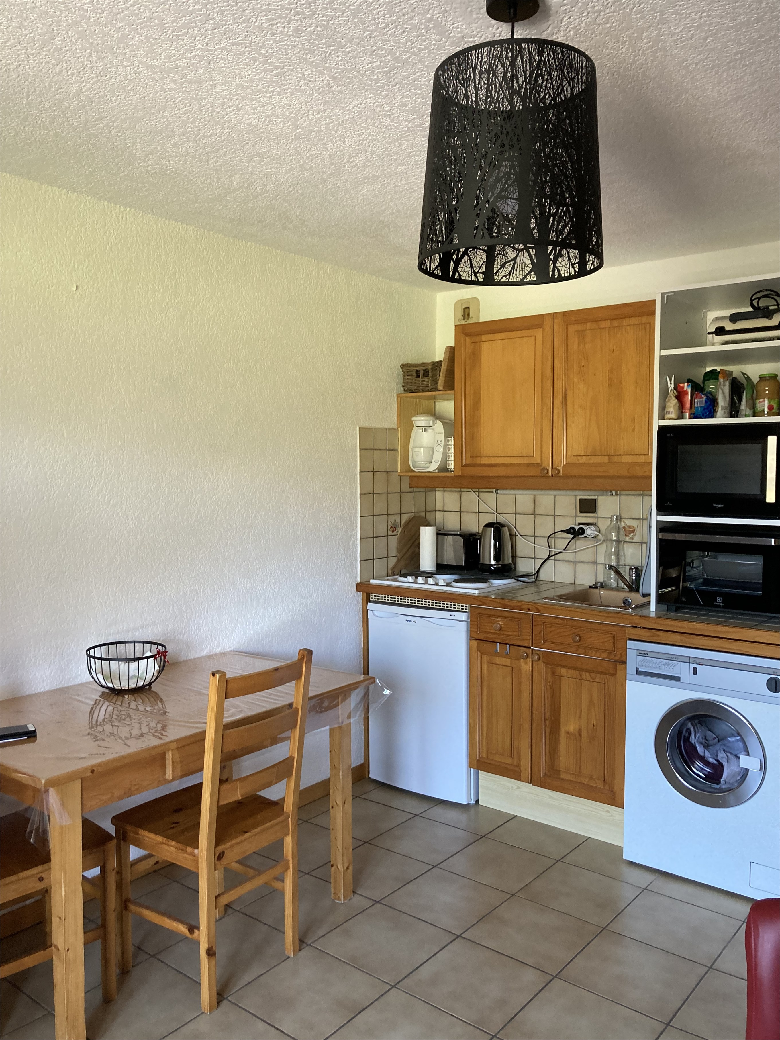 une pièce principale avec couchage 140, télévision, coin cuisine équipée (plaques de cuisson, réfrigérateur, micro-onde, four, machine à laver, cafetière, grille pain, grille viande, raclette, fondue)