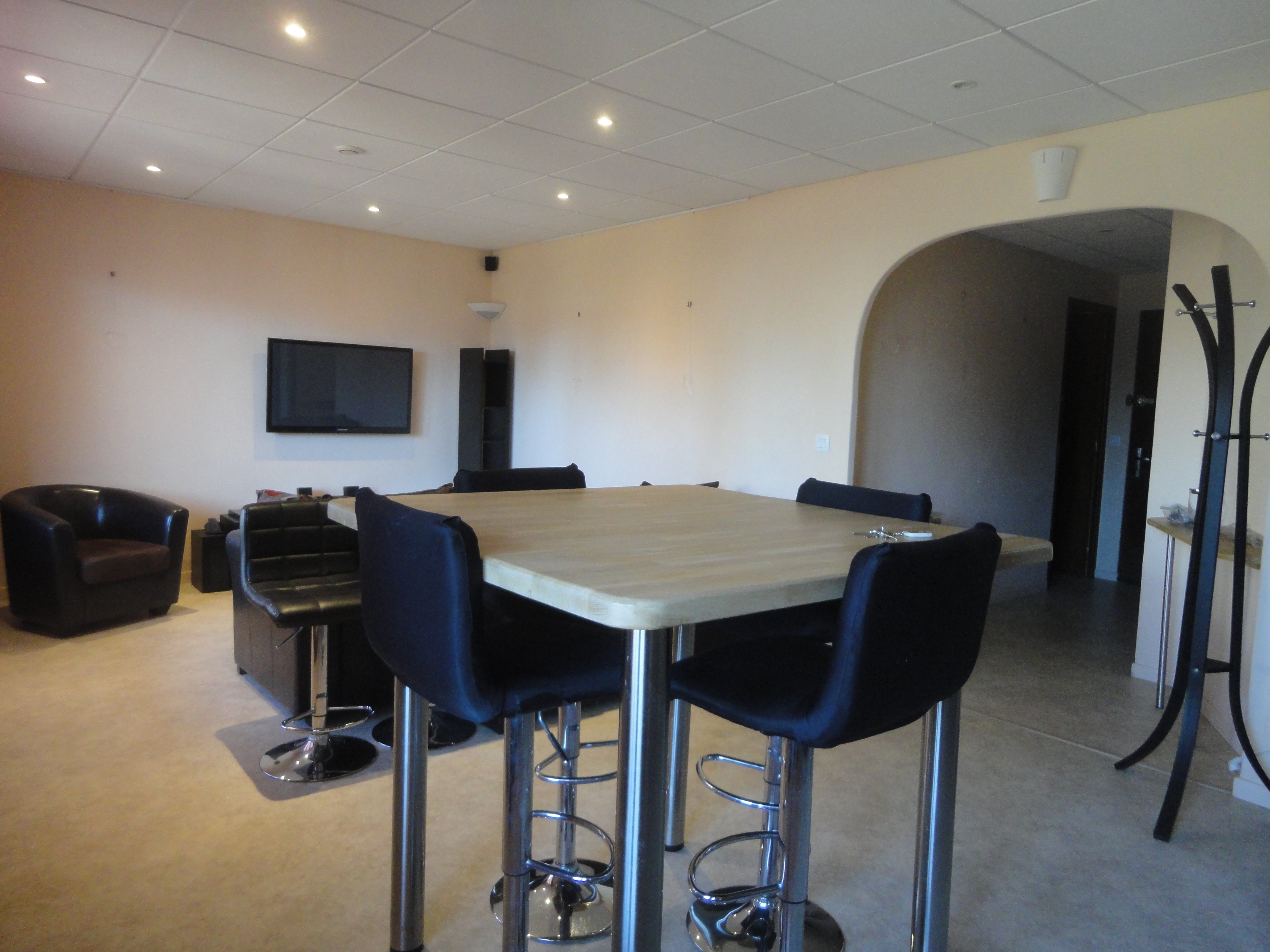 Un séjour avec convertible, fauteuil et TV murale.