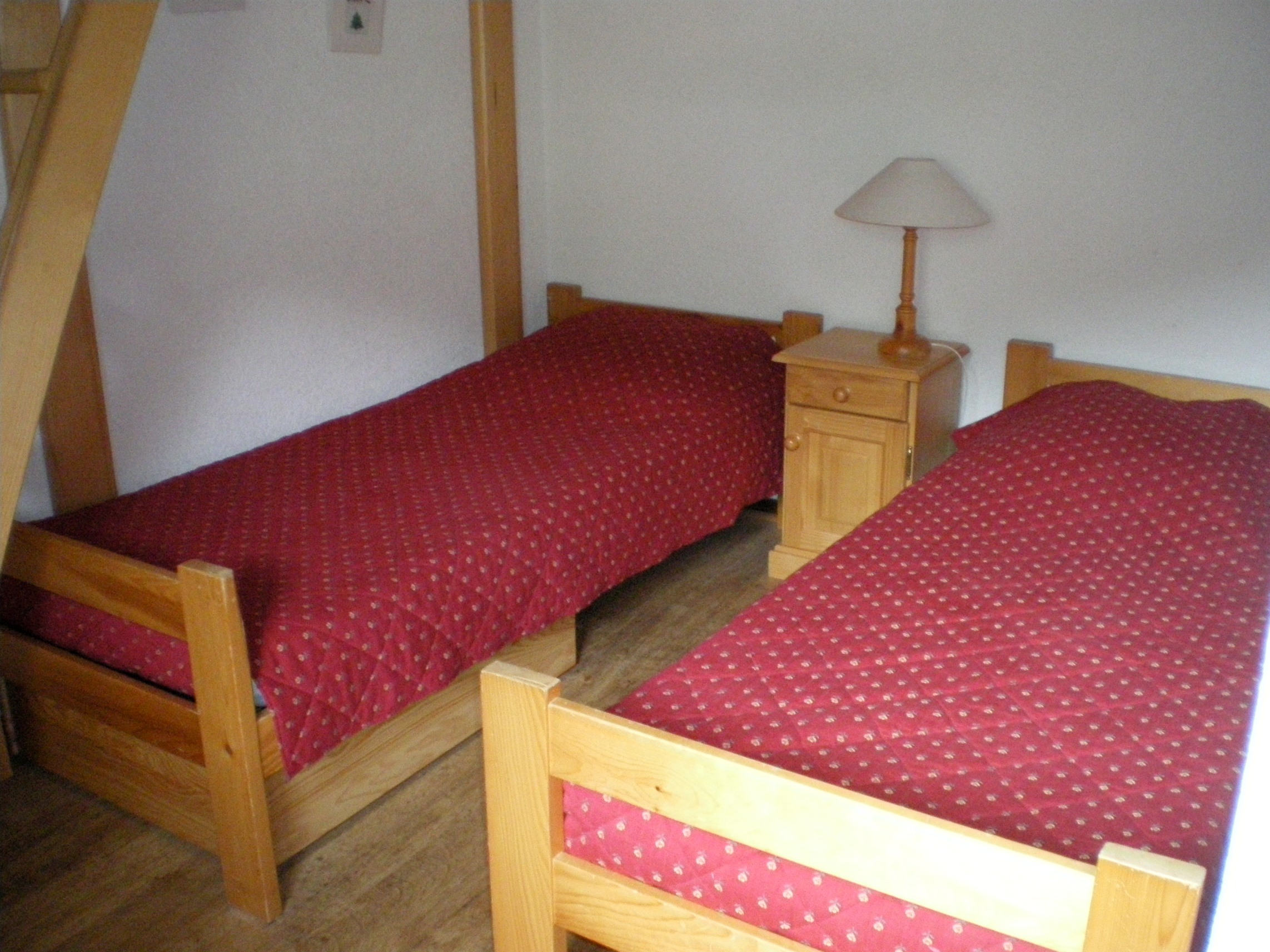 Chambre 1: 9 m² à l'étage, accès depuis la mezzanine, 2 lits 1 personne (80 cm), Fenêtre nord-ouest.