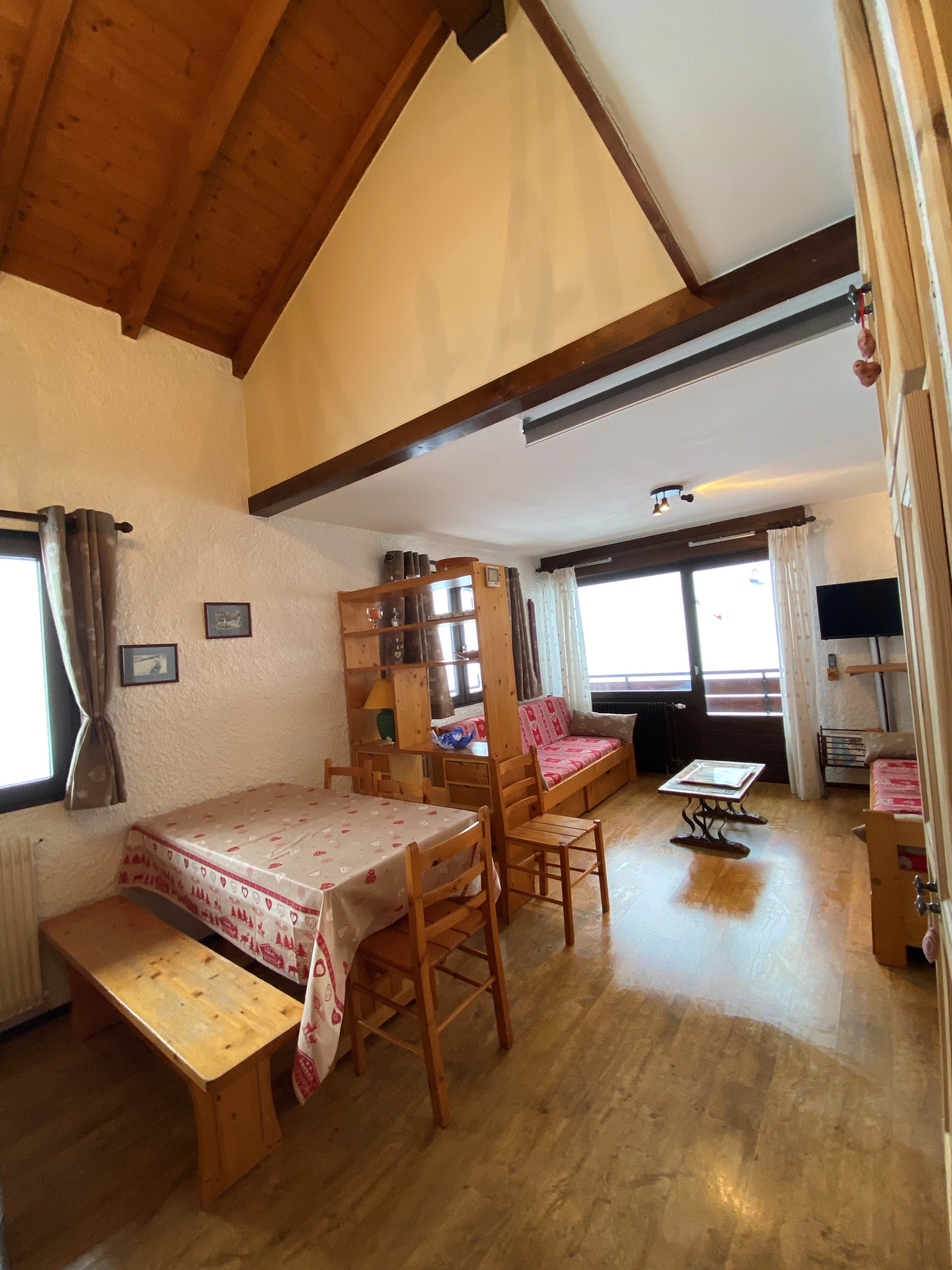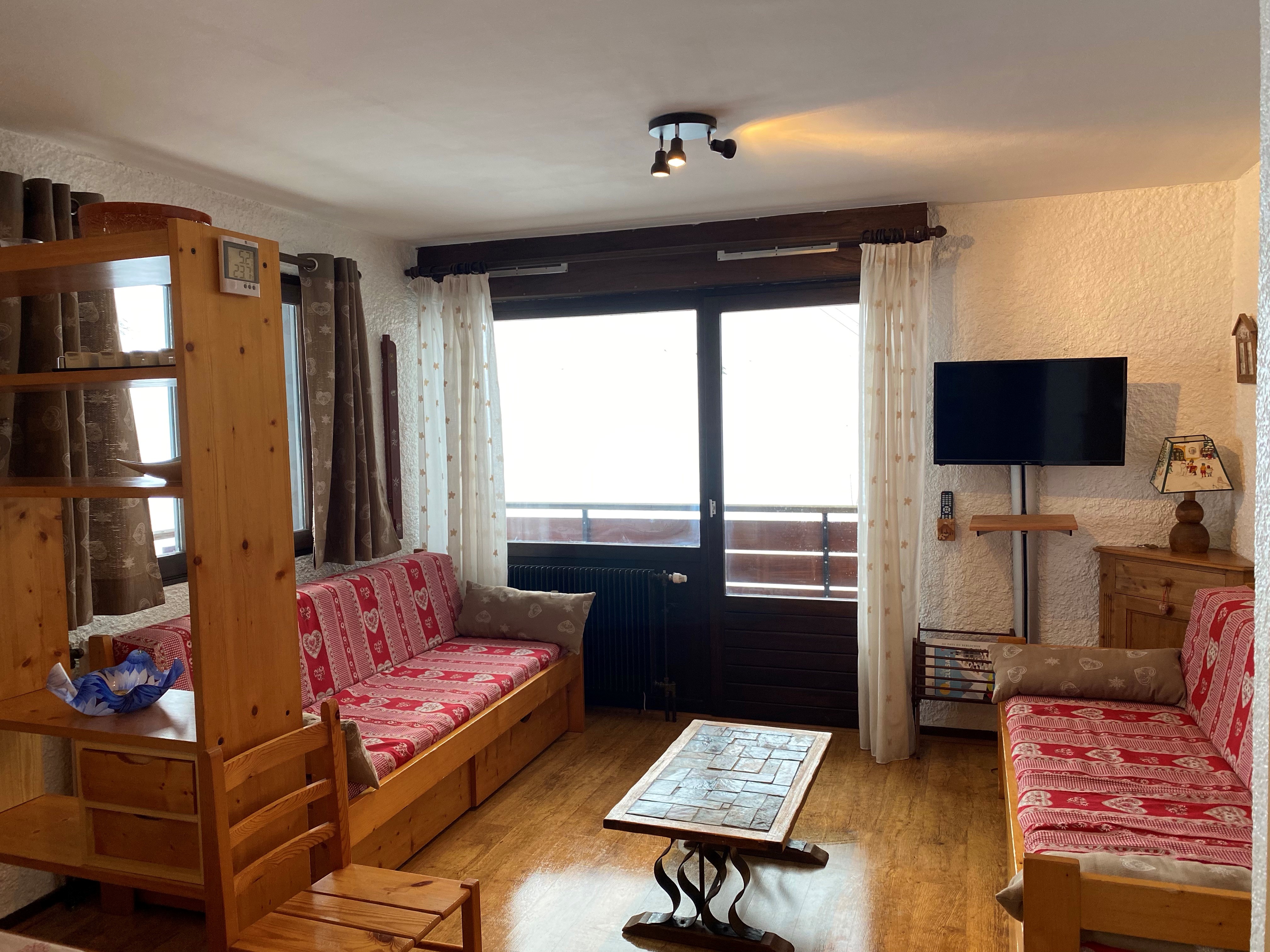 Séjour/Salon: 25 m², canapé-lit gigogne (2 lits de 80 cm) possibilité de faire un grand lit, télévision, Porte-fenêtre donnant sur balcon d'angle SUD EST.