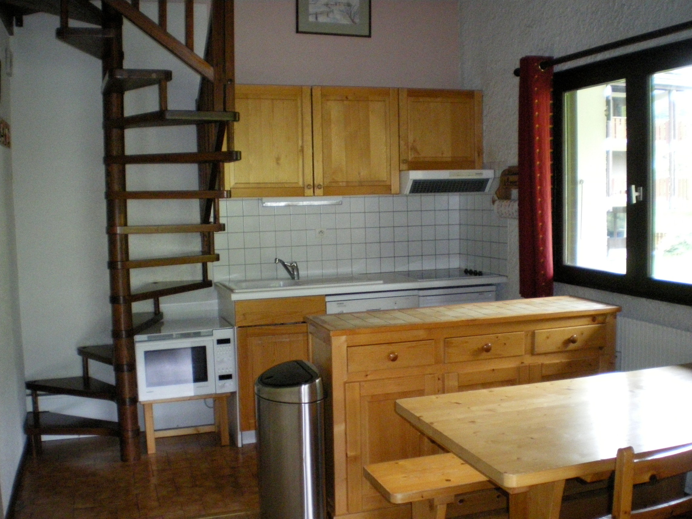 Coin cuisine équipée, 4 plaques vitrocéramiques, réfrigérateur, lave-vaisselle, four + micro ondes (combiné), appareil fondue, appareil raclette, cafetière électrique, Grille-pain, autocuiseur.