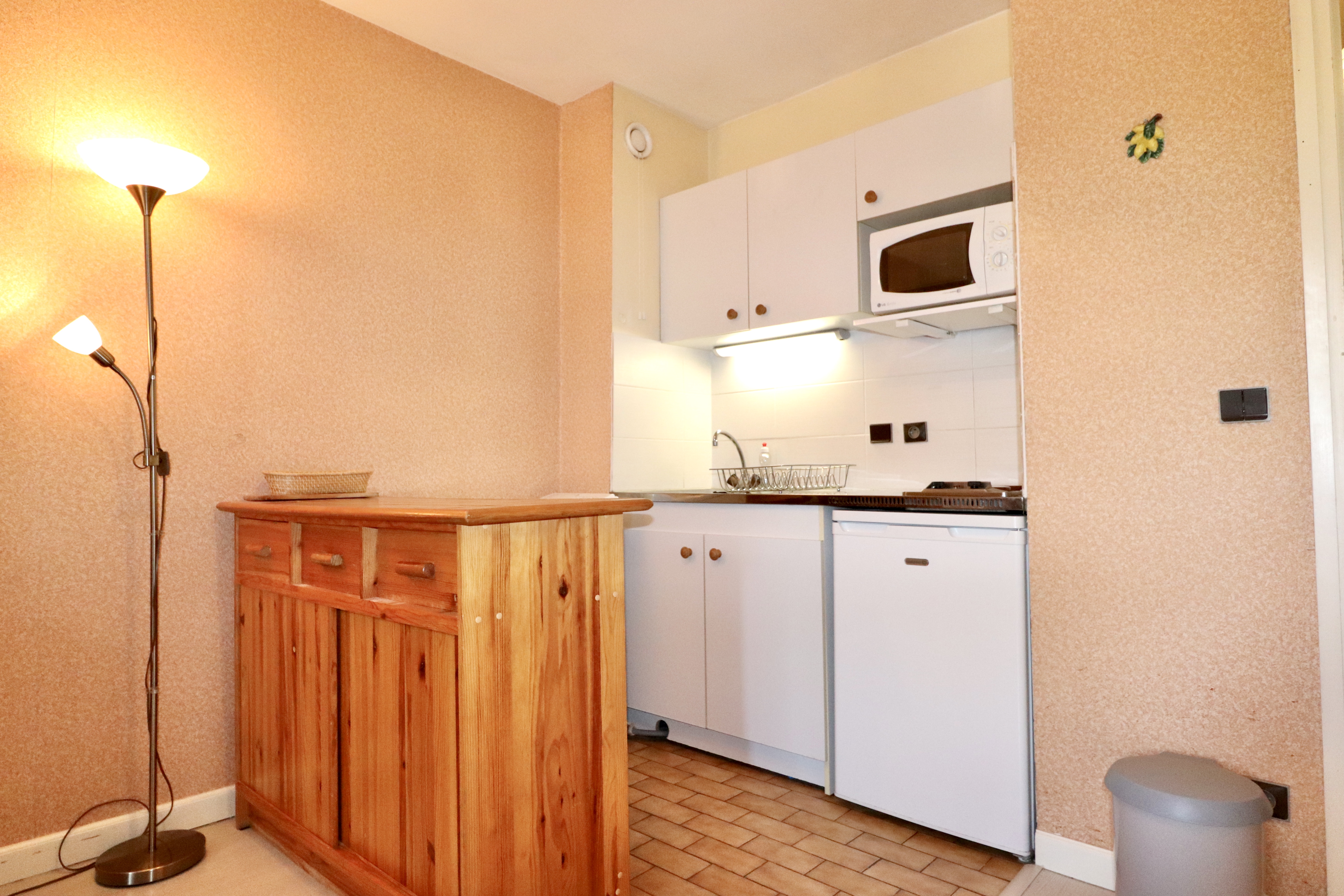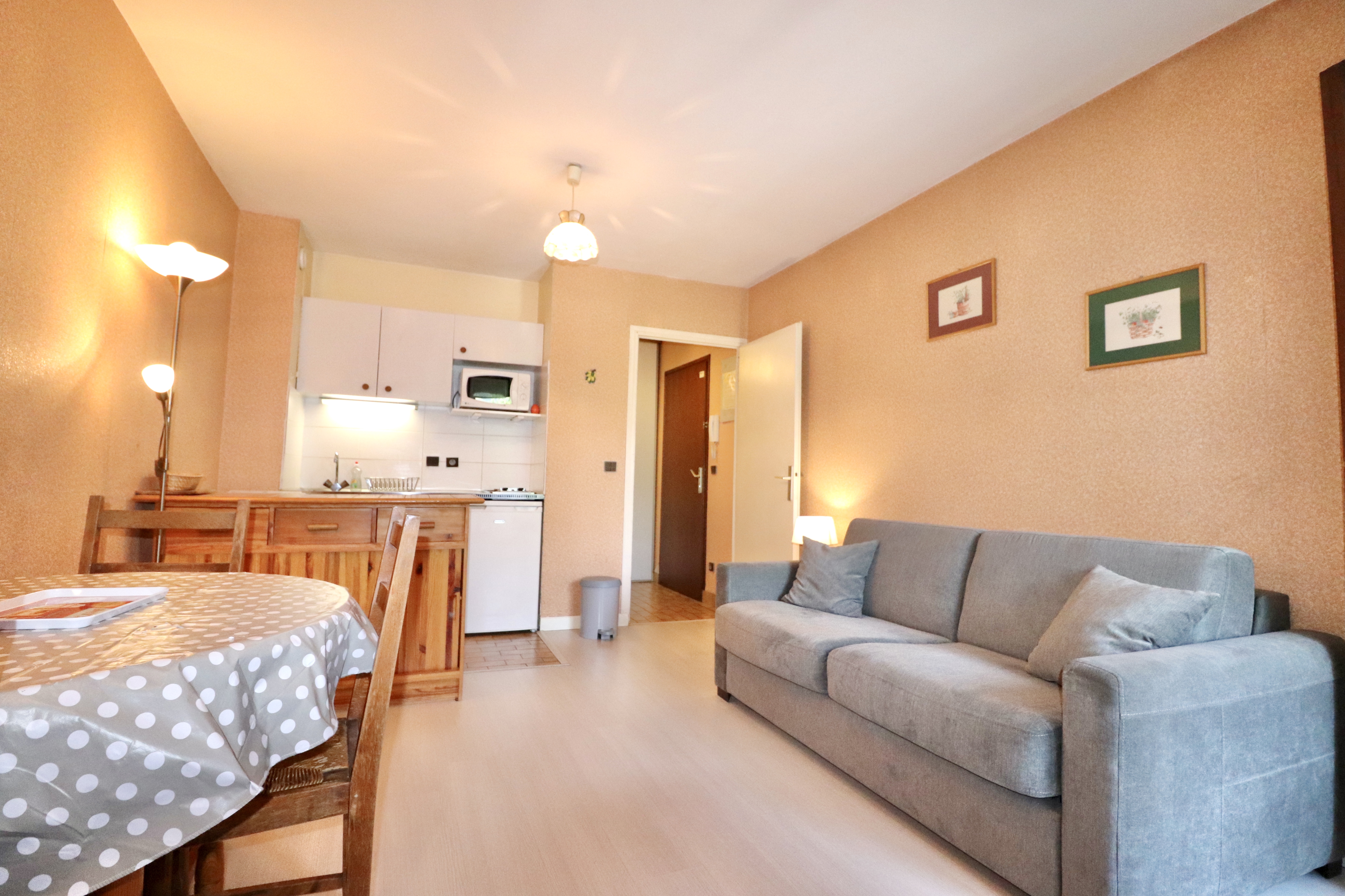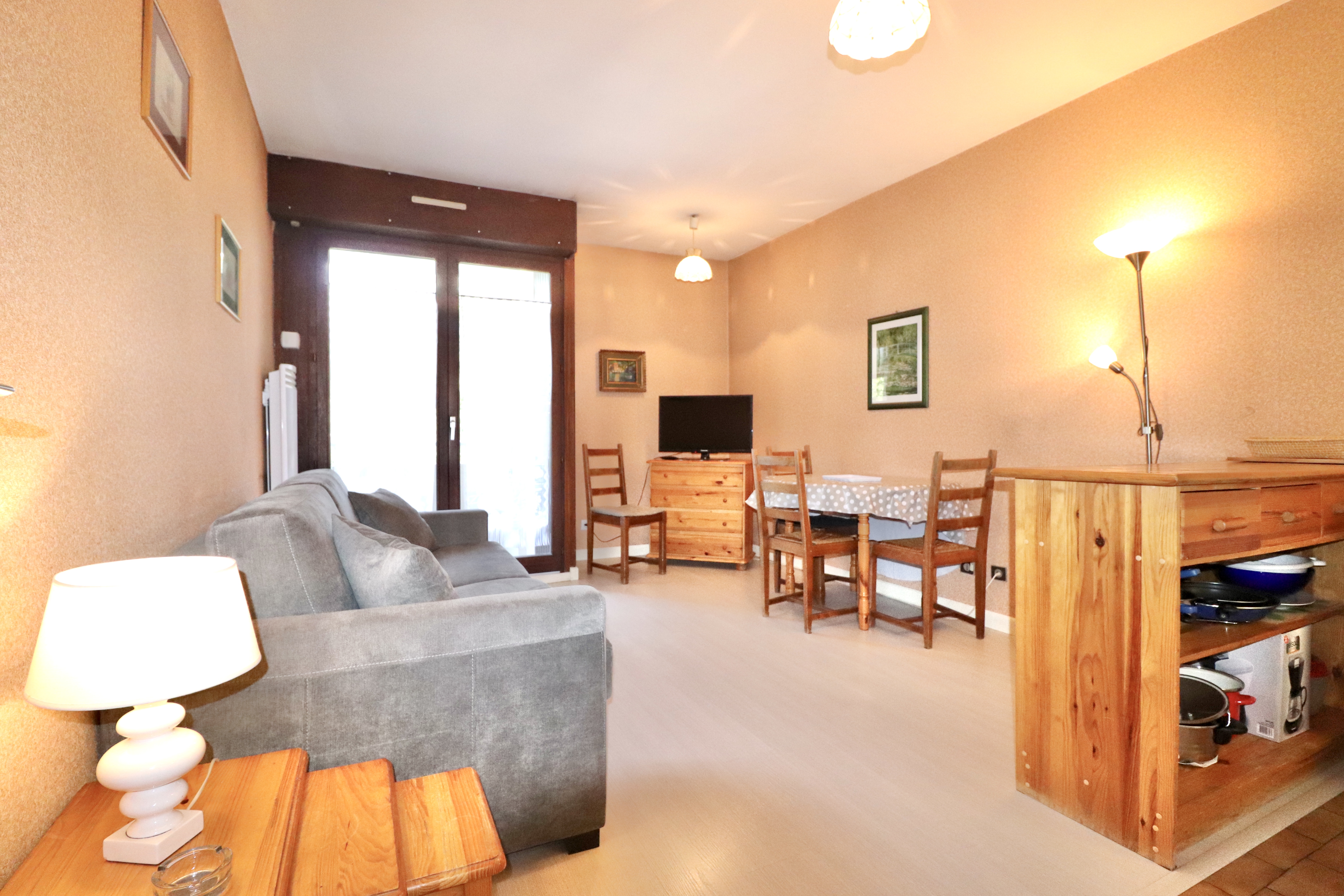 L'appartement se compose d’un séjour avec canapé convertible, offrant un couchage confortable pour 2 personnes, un coin kitchenette fonctionnel, séparé par un passe-plat, une salle de bain avec lavabo, douche et toilette