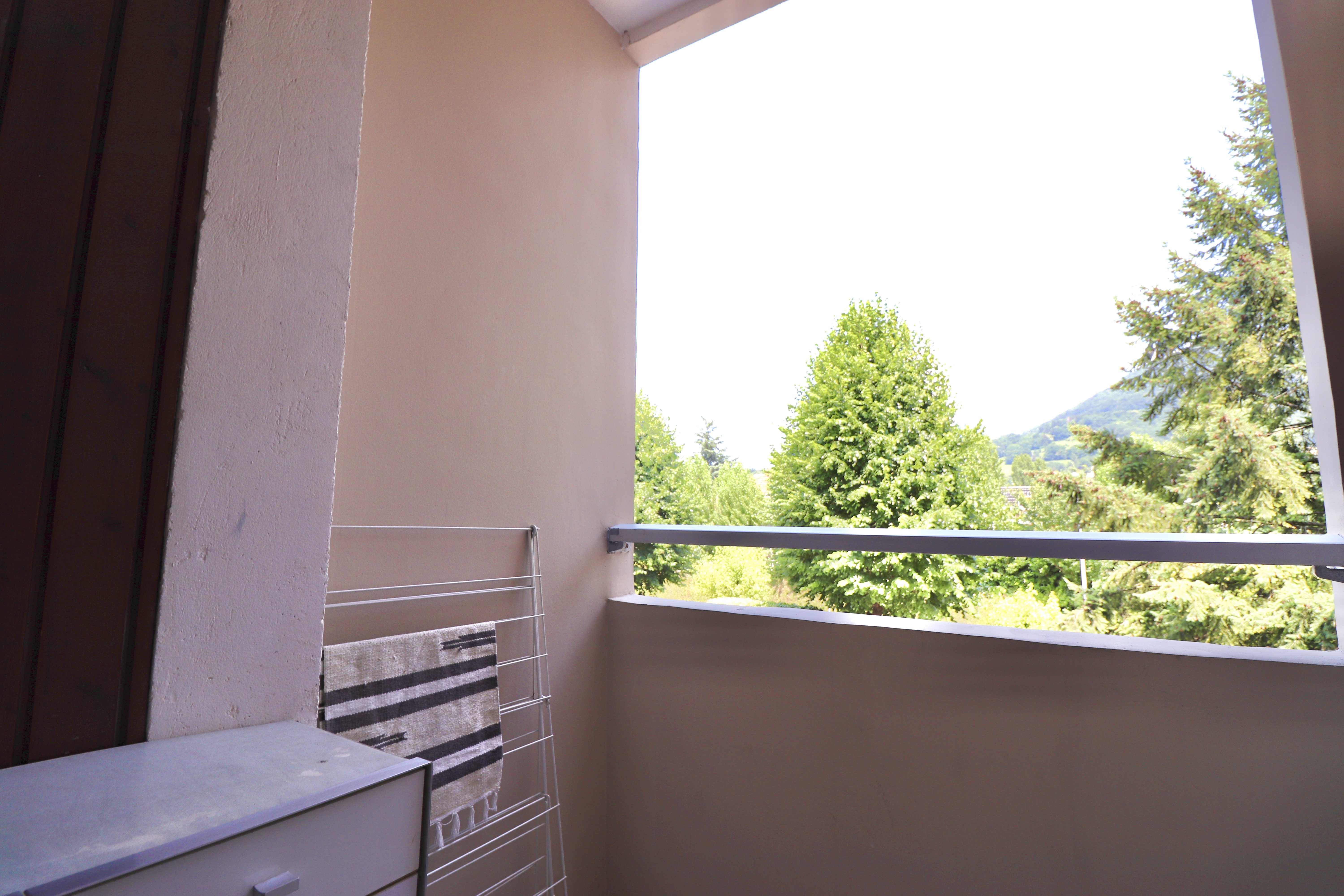 La pièce principale dispose d’un véritable espace repas. La porte-fenêtre offre une luminosité à l’appartement et s’ouvre sur un petit balcon couvert. Vous pouvez ranger vos affaire personnelles dans le placard du couloir.