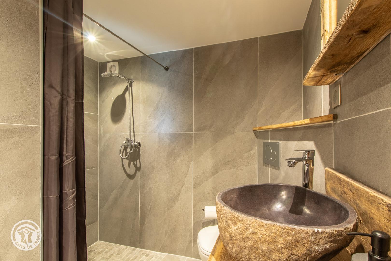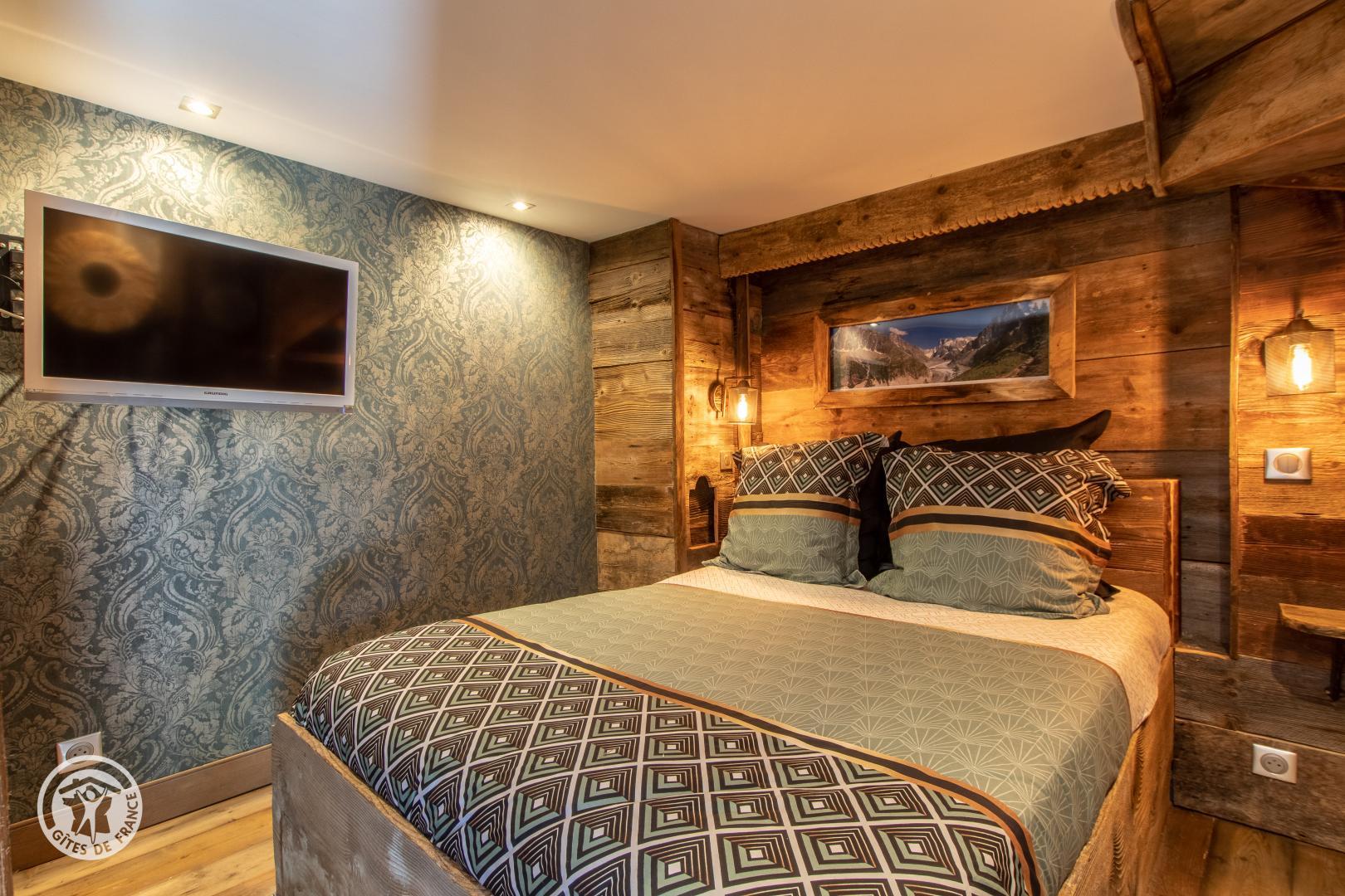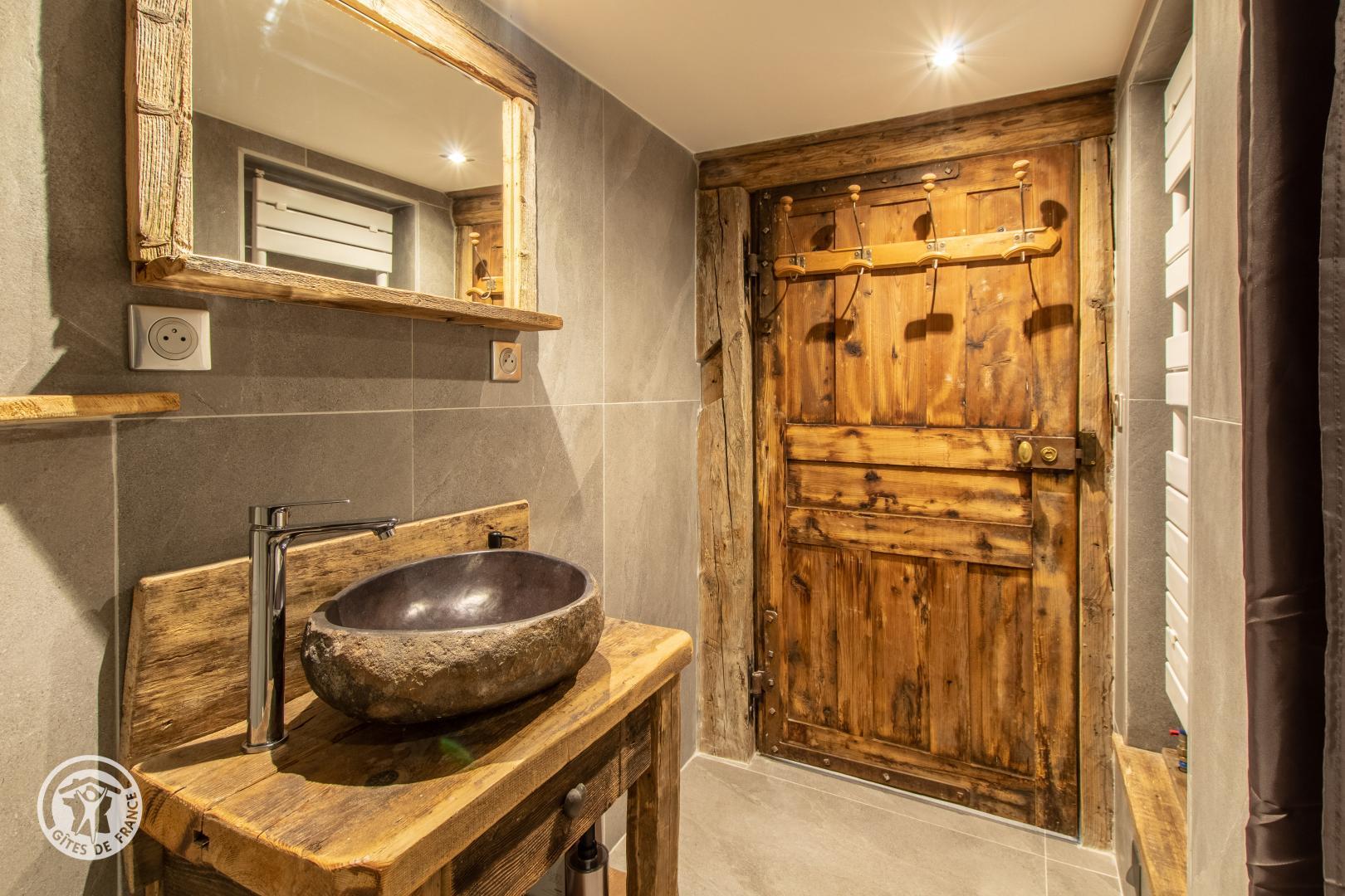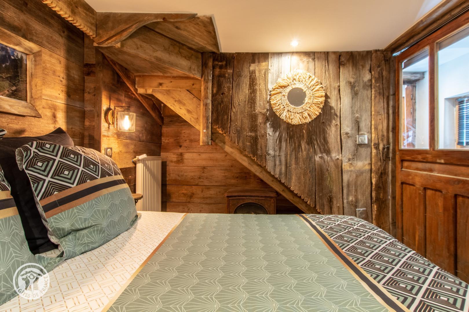 Au rez de chaussée, couloir donnant accès à la chambre (lit de 140x190cm, TV murale et cheminée électrique) et une salle de bains (douche, vasque sur meuble et sèche serviettes).