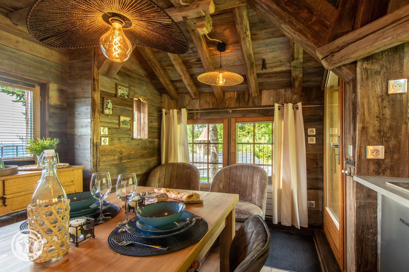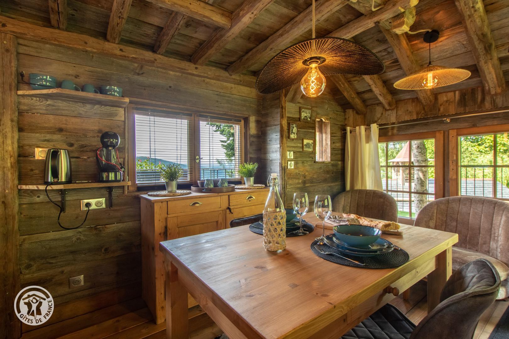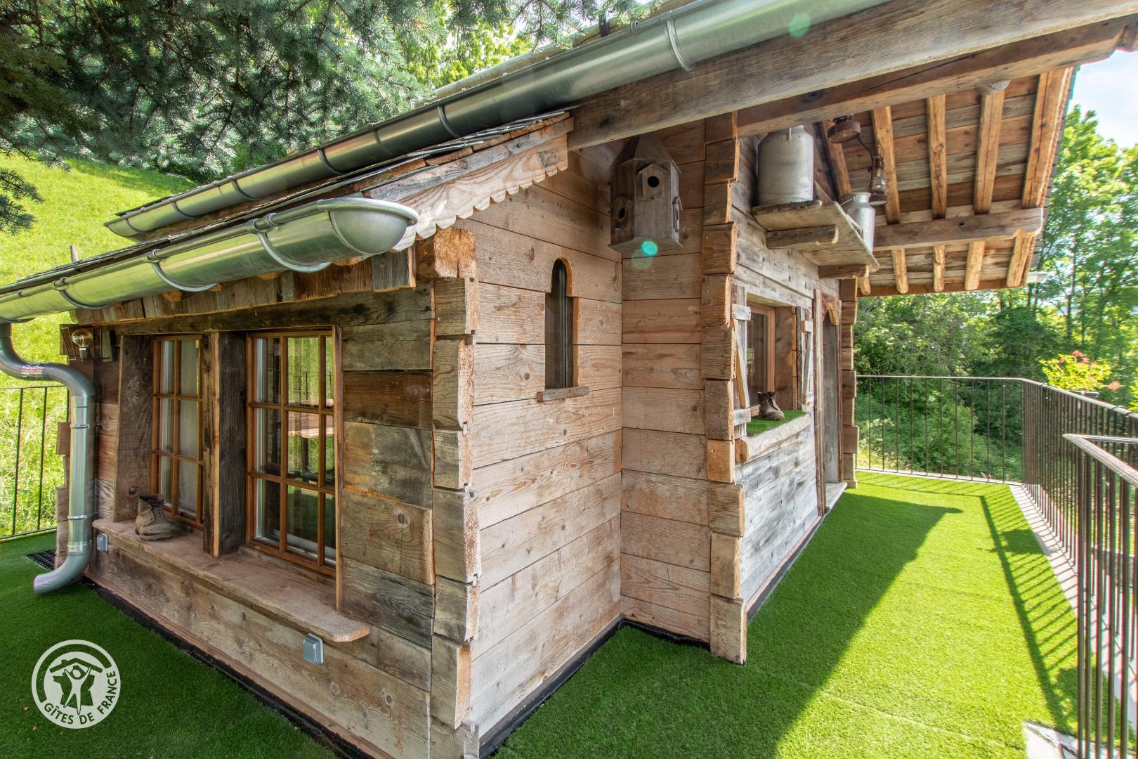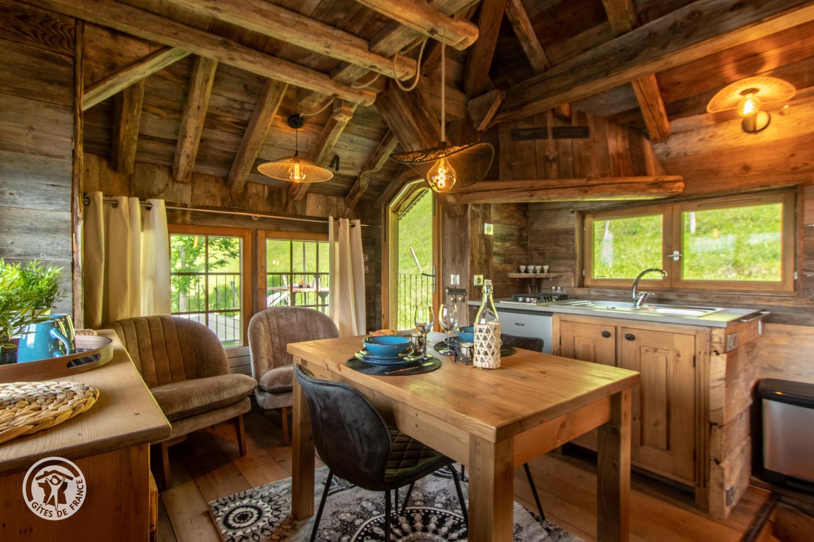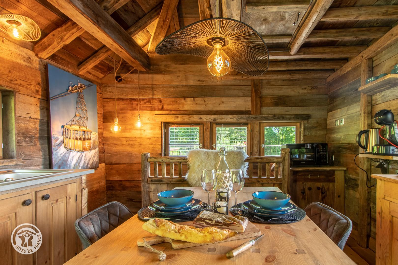 Ce mazot en vieux bois a été conçu autour d'un sapin pour vous offrir une ambiance chaleureuse et authentique. Il est situé entre une petite chapelle et une télécabine, une véritable ambiance de petit village savoyard.