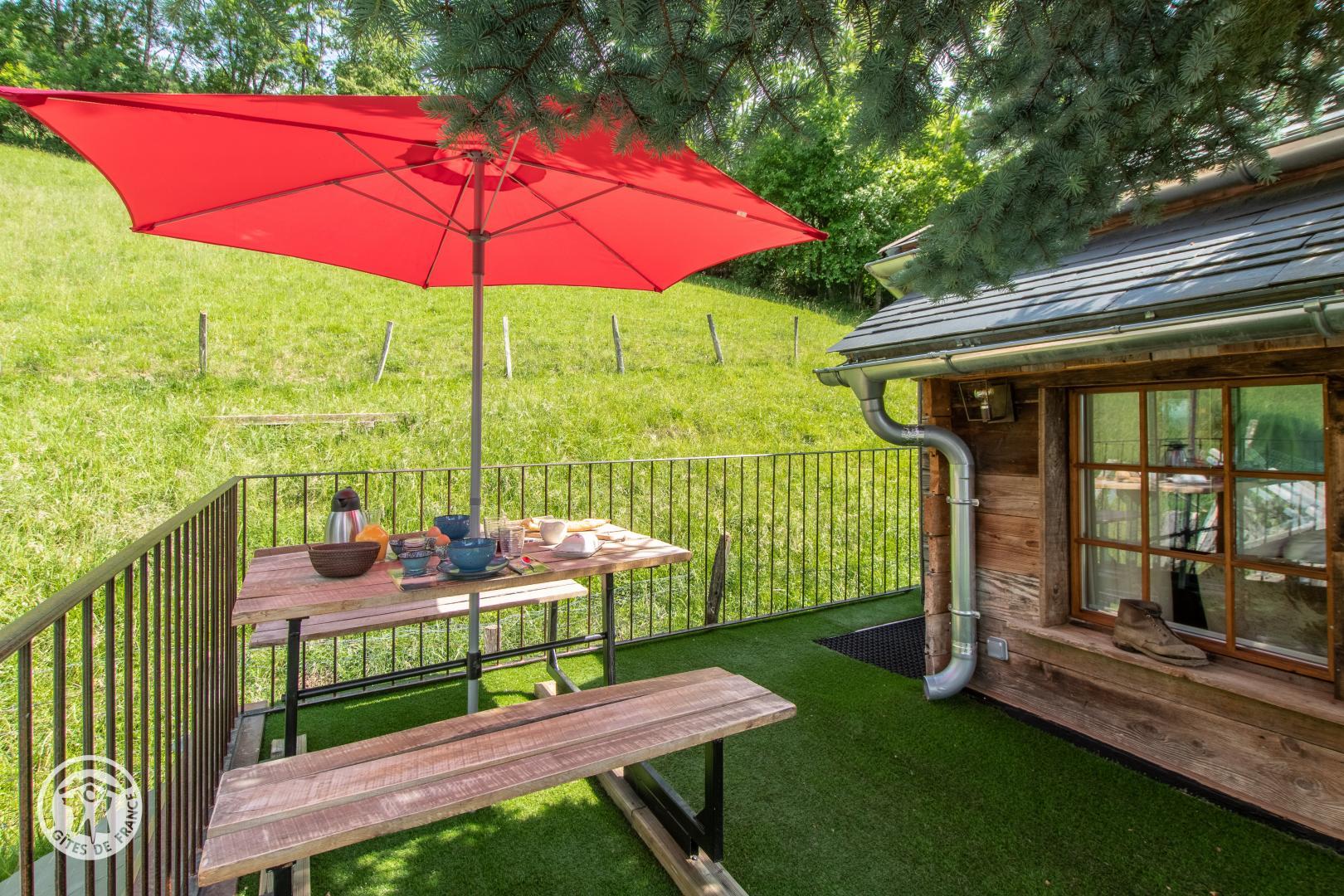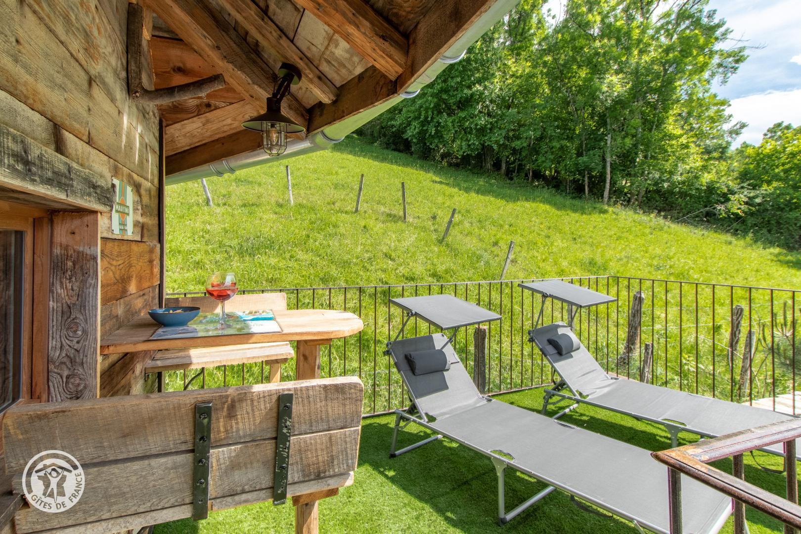A l'étage, pièce de vie composée d'une cuisine/séjour (cuisine équipée, table de repas et 2 fauteuils de lecture) donnant accès à l'espace extérieur privatif composé de deux espaces, terrasse avec table en bois avec une petite vue lac et un solarium.