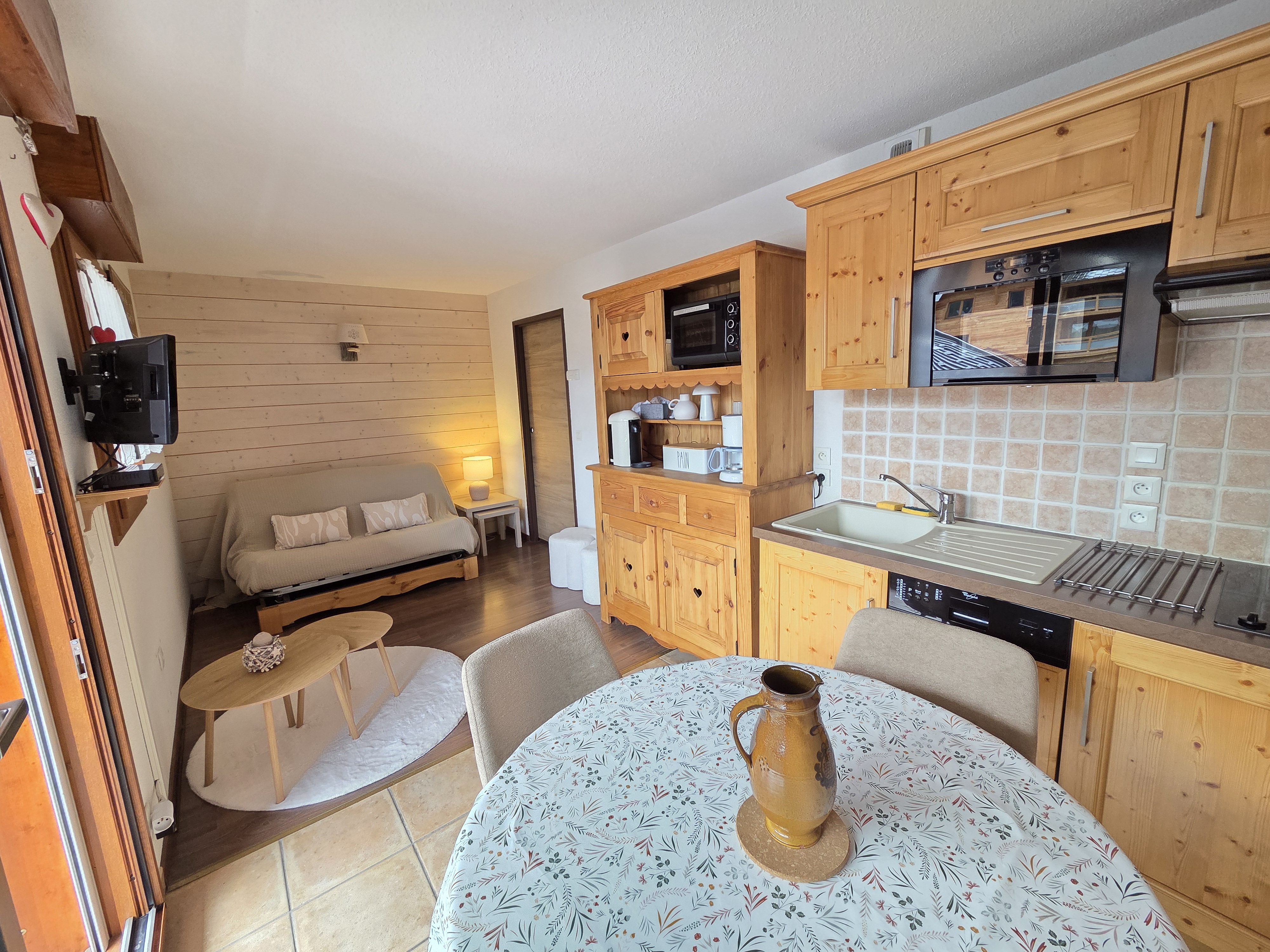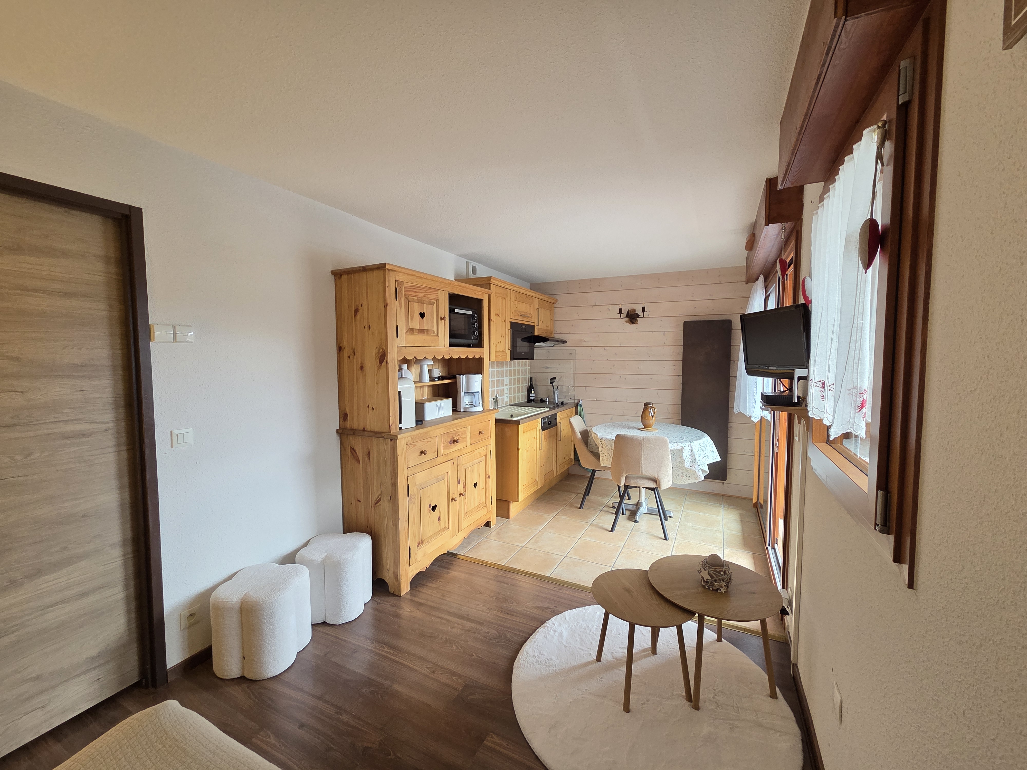 Appartement classé 2 étoiles NN pour 6 personnes (possibilité de 2 couchages supplémentaires pour des enfants), décoré avec beaucoup de soin situé au rez de chaussée d'un chalet en vieux bois avec un accès direct sur les pistes.