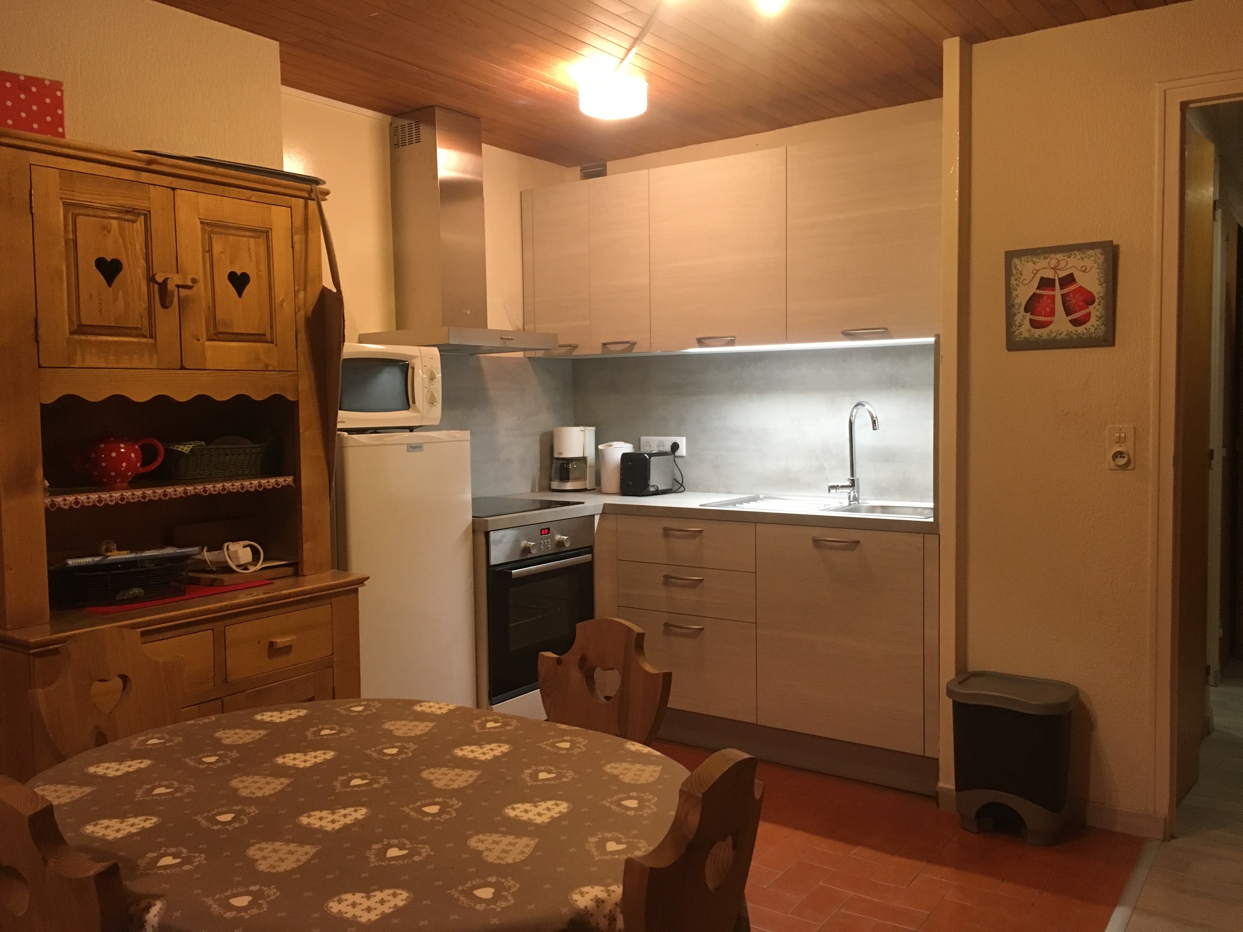 Il se compose d’une entrée avec 2 grands placards, d’une pièce principale avec coin cuisine équipée (grand frigo, four électrique, plaque cuisson vitrocéramique, hotte aspirante, micro-onde, cocotte minute, grille pain, cafetière électrique….) et couchages, et d’une salle de bains (baignoire, lavabo, WC.)