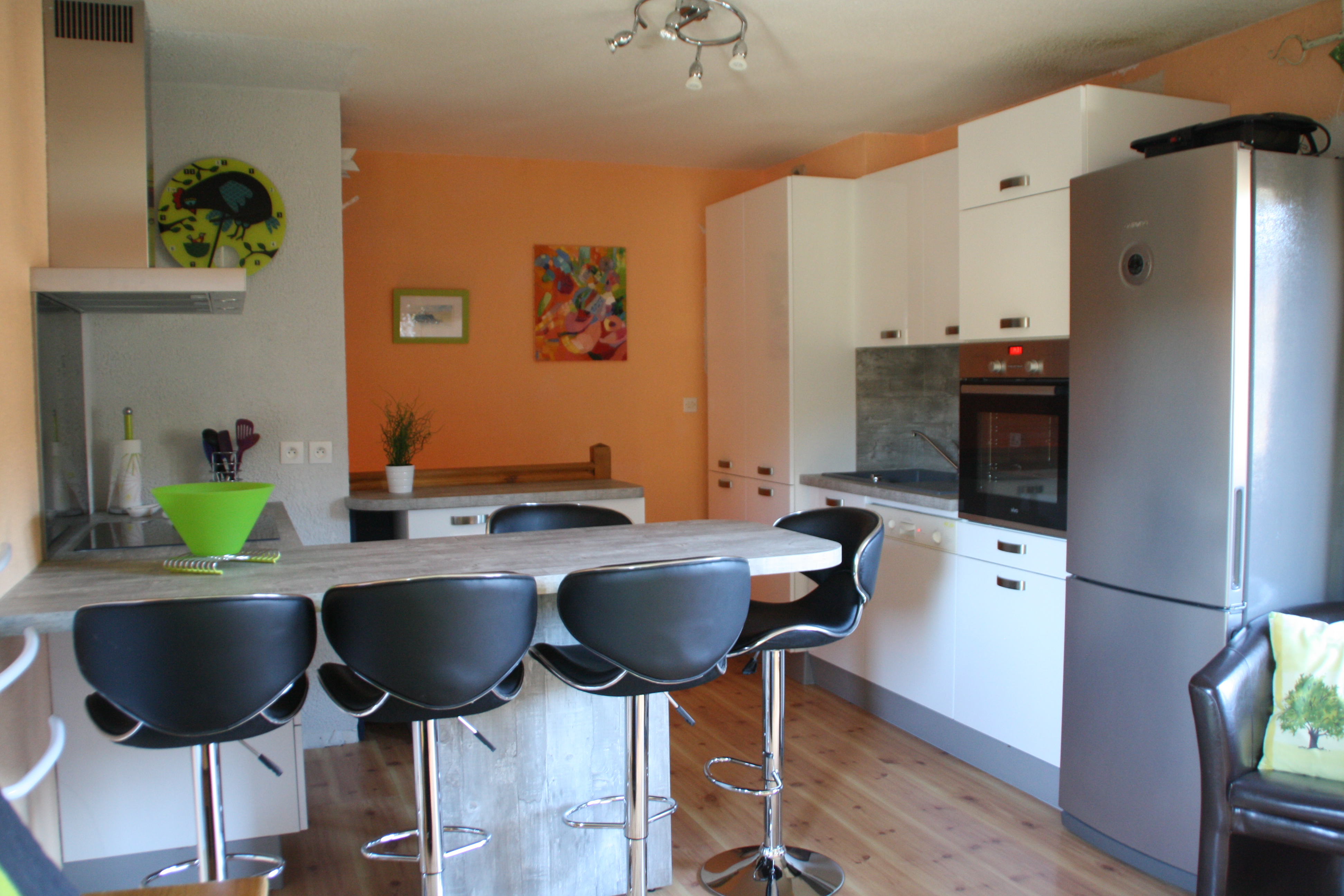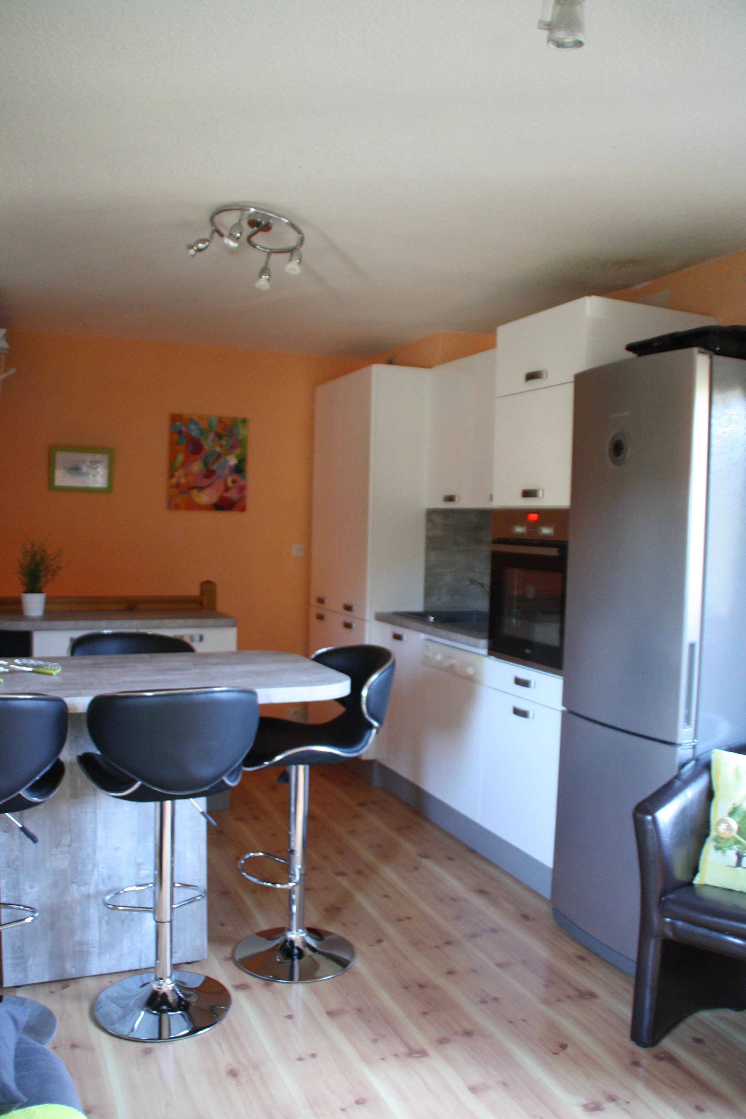 Coin cuisine dans le séjour. Plaque à induction 3 feux et hotte électrique. Four pyrolyse et four micro-ondes. 1 combiné frigo, congélateur.