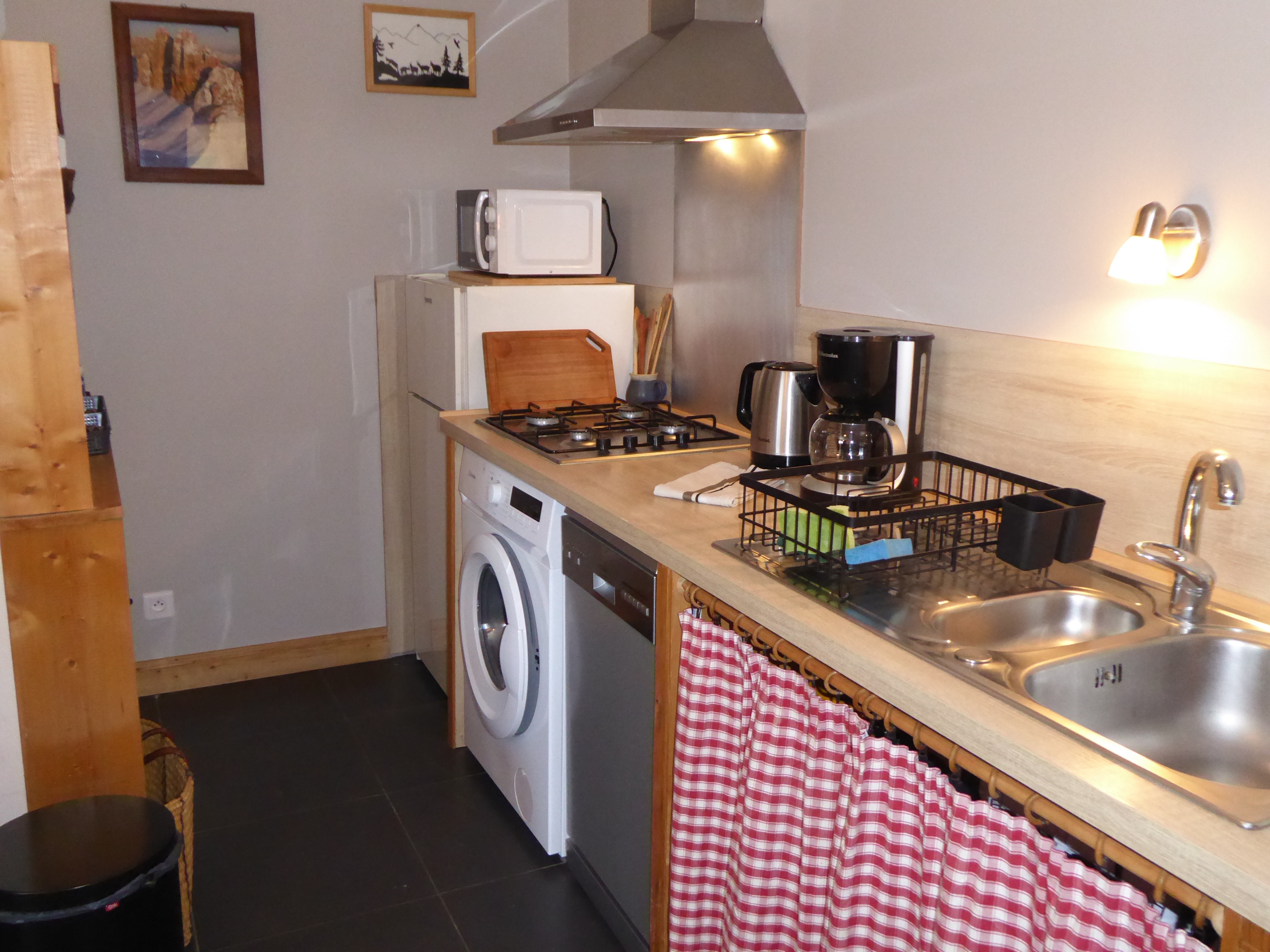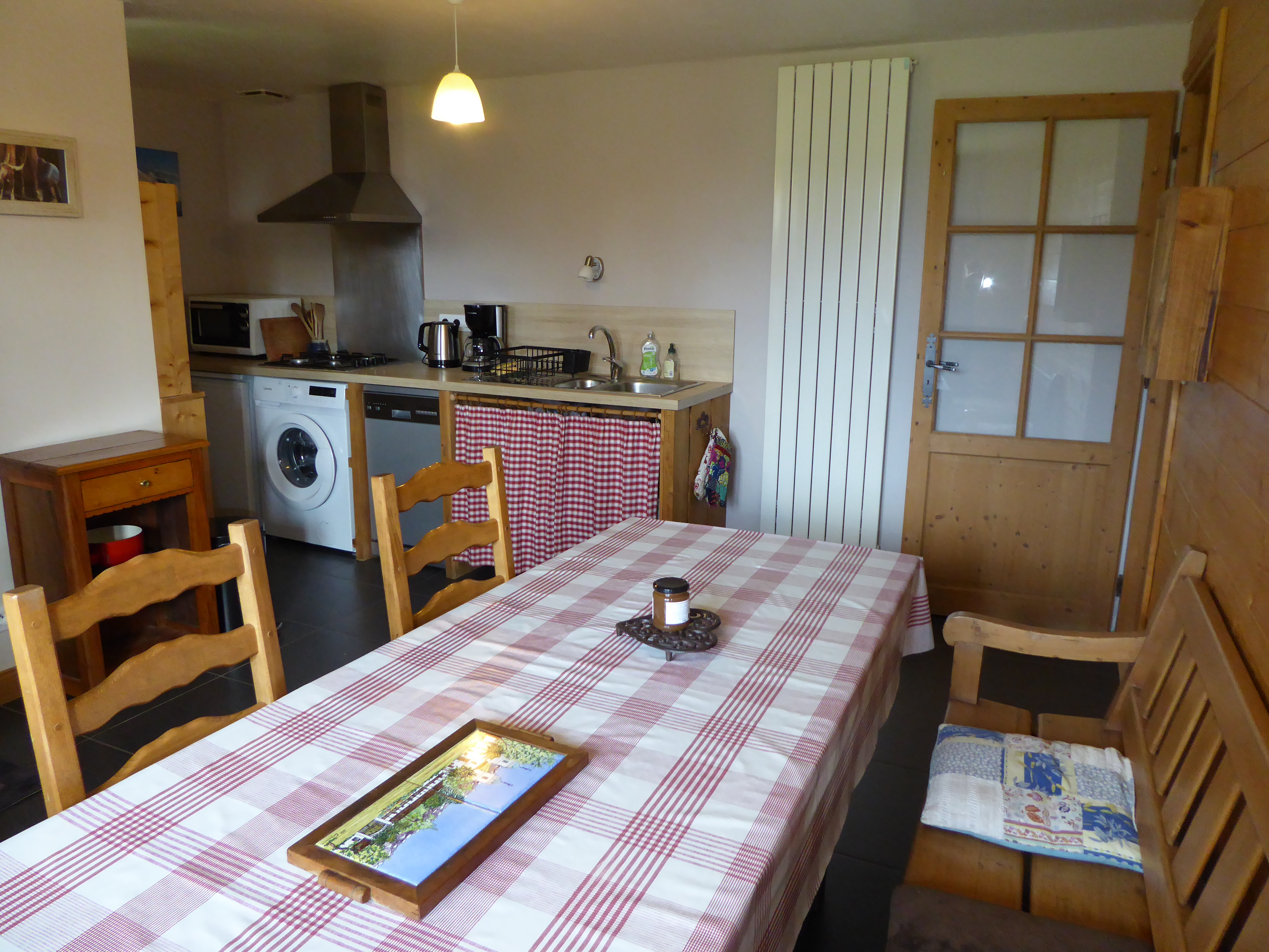 4 feux gaz, 1 mini four, lave vaisselle, réfrigérateur avec compartiment congélation, micro-ondes, lave linge, bouilloire et cafetière électriques, appareil à raclette, poëlon à fondue, mini-crêpes party, vaisselle courante.