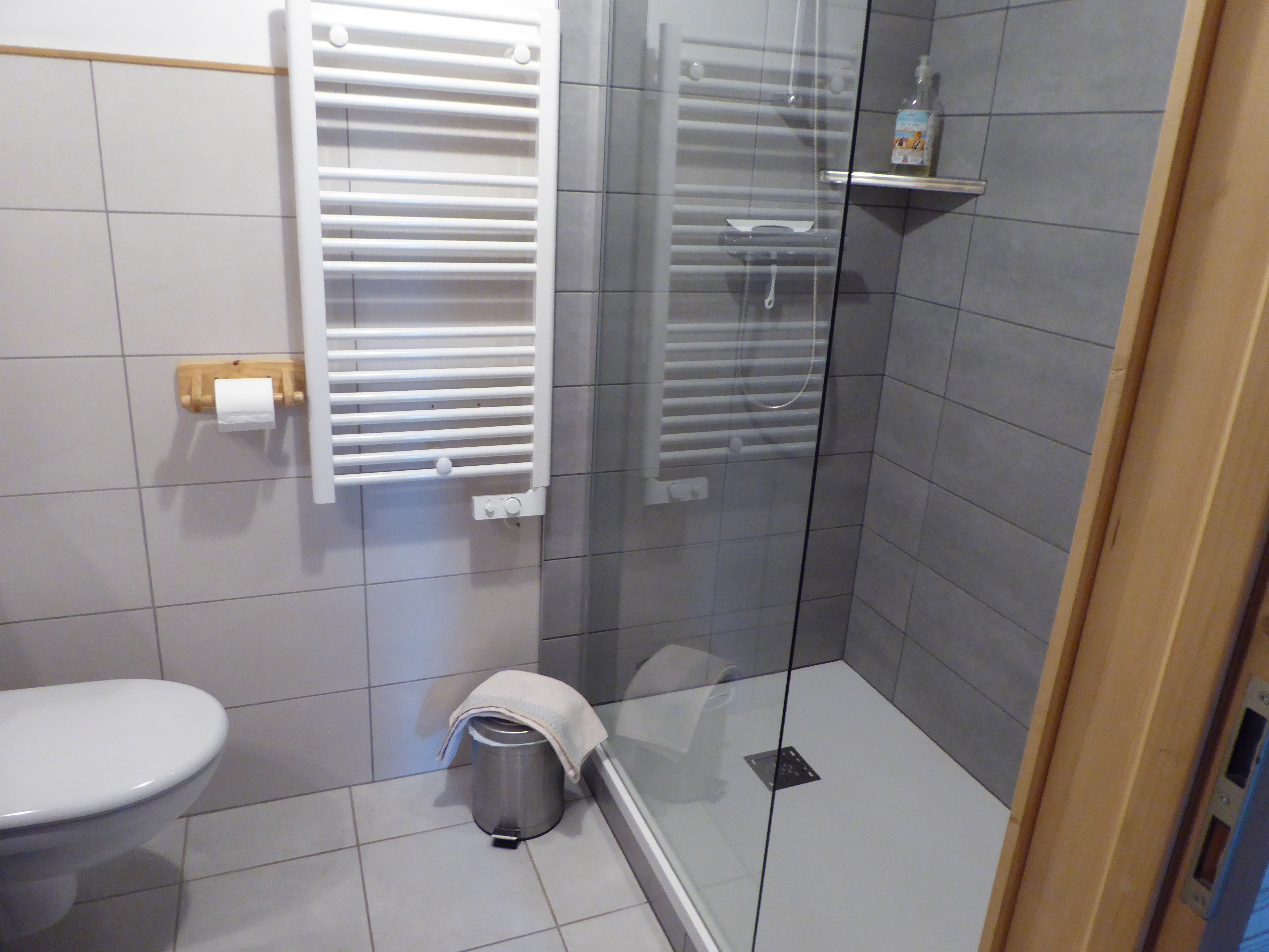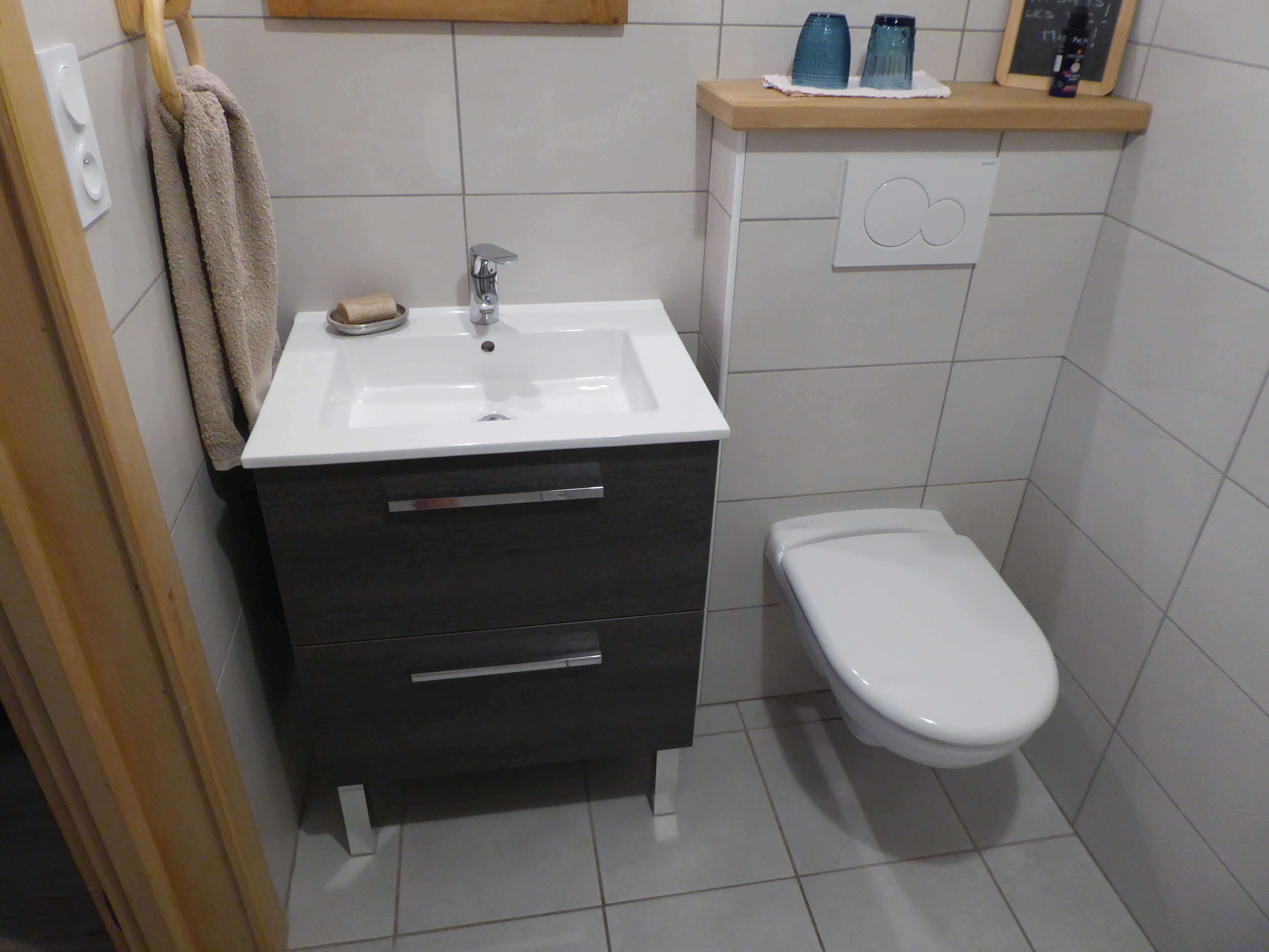 Lavabo, rangement, douche italienne, WC, sèche cheveux, sèche serviettes électrique.