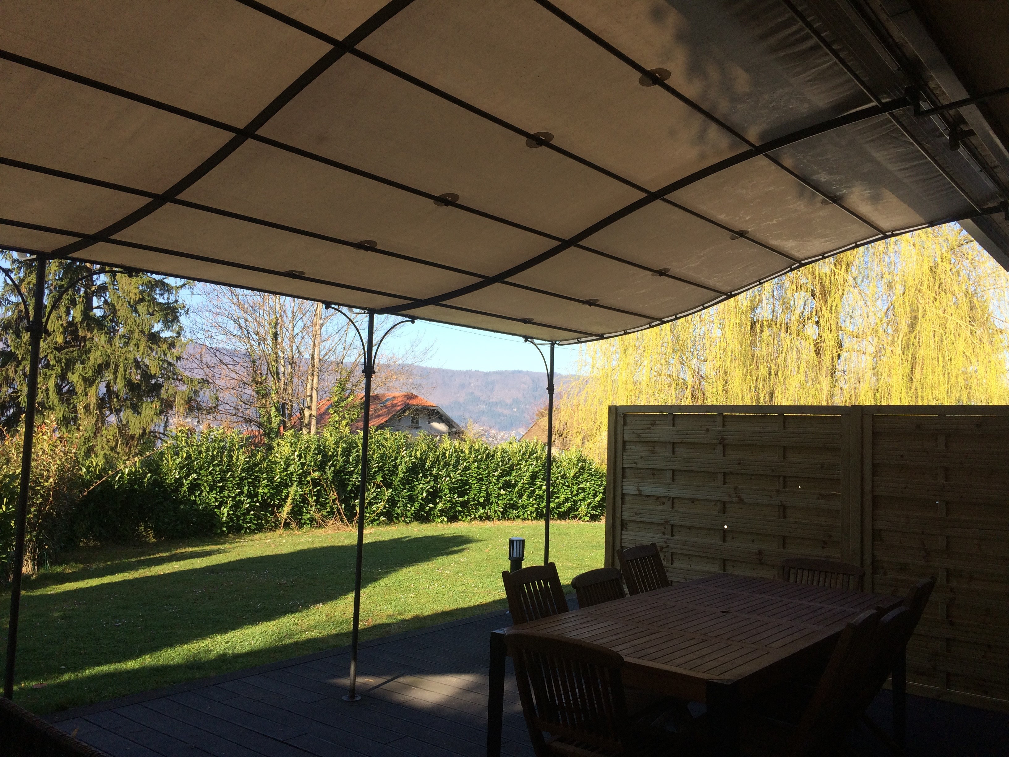 Chalet savoyard en bois sur 2 niveaux, situé sur une route secondaire. Tout confort, moderne, chauffage électrique, lit 160x200. Terrasse ombragée avec meubles de jardin. Exposition Sud et Ouest. Vue lac et montagnes.