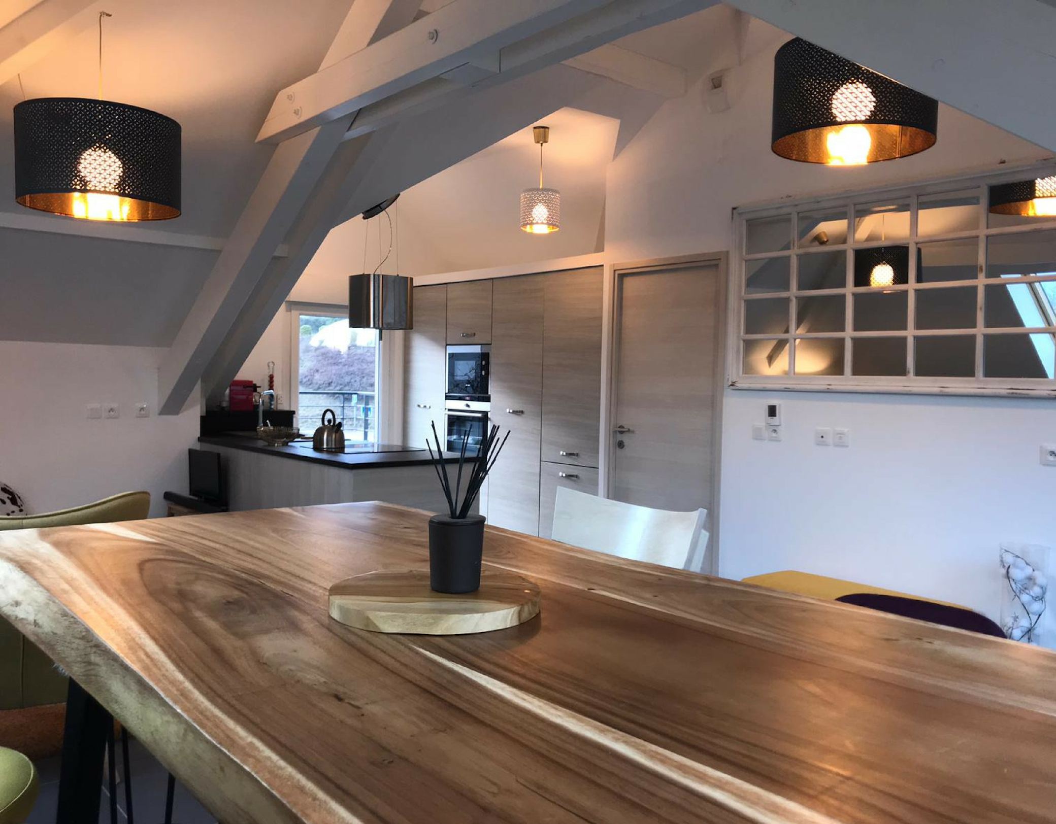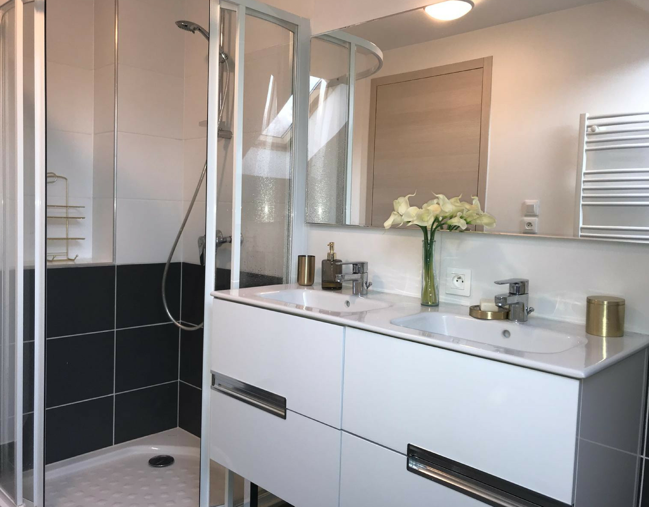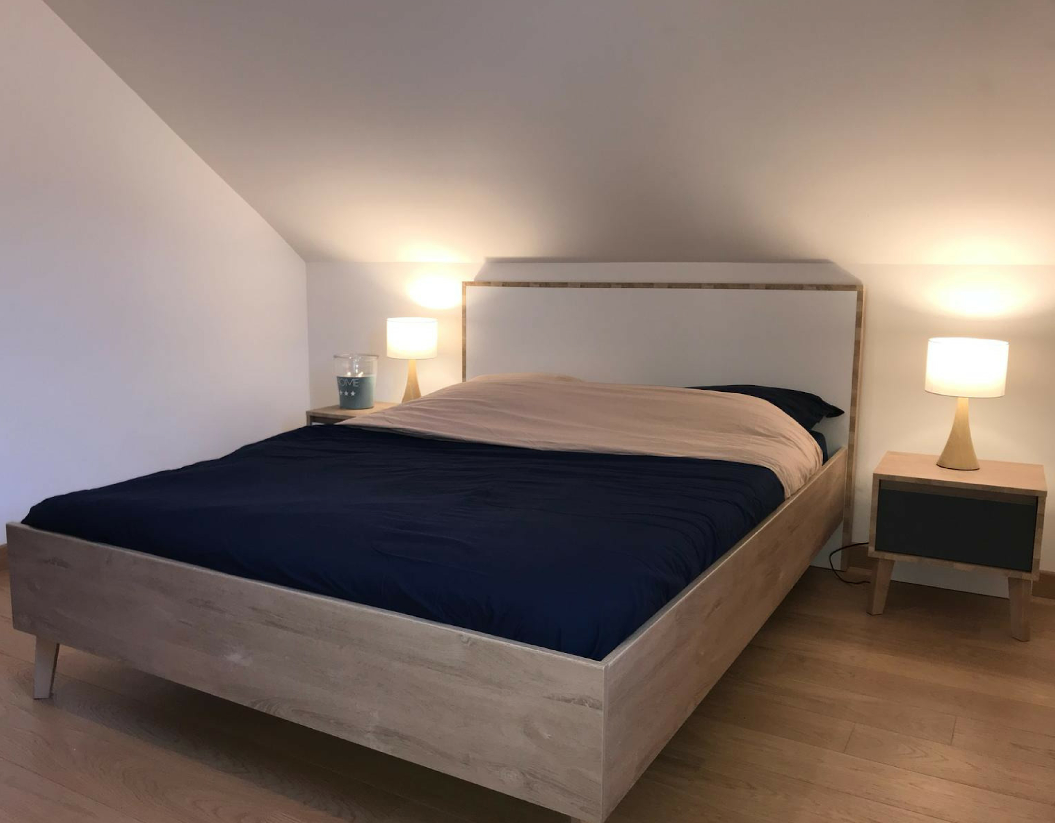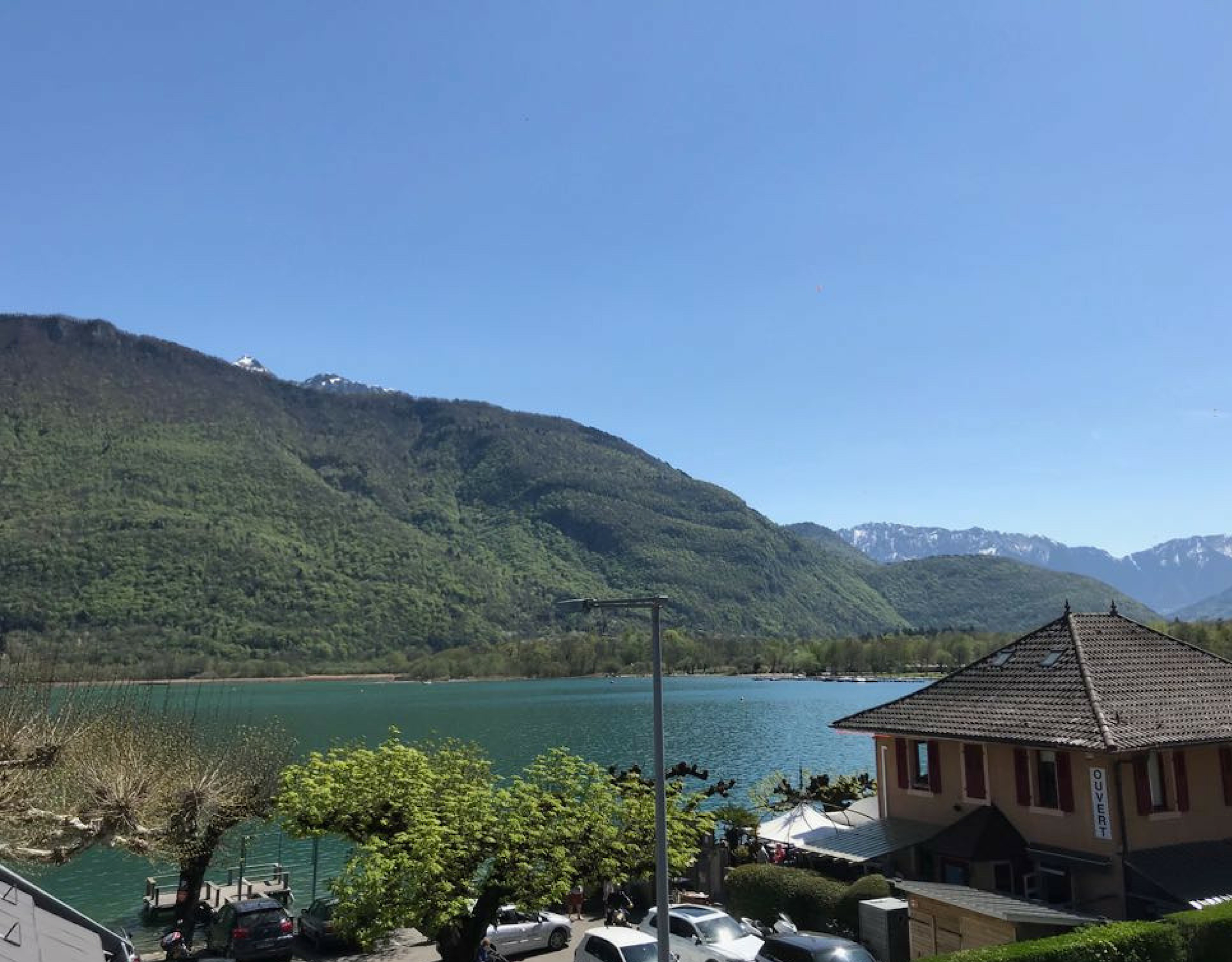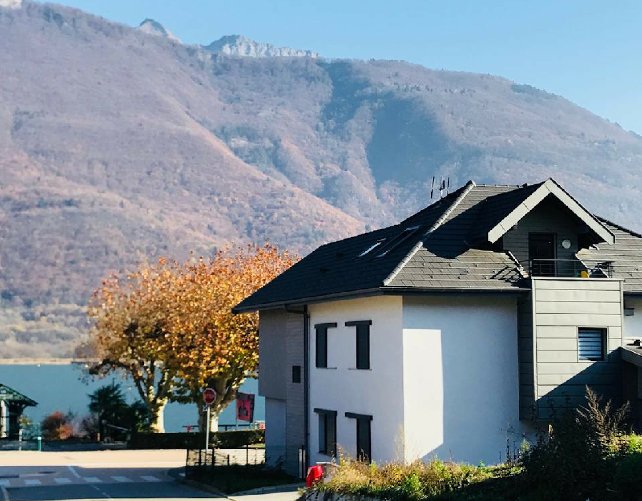 Appartement de 3 chambres à Doussard aux Sources du lac d'Annecy avec vue sur le lac et décoration contemporaine. Le lac est à moins de 30m, la plage est à une centaine de mètres. Le Duplex Lac Noisettes est idéal pour un weekend ou pour des vacances.