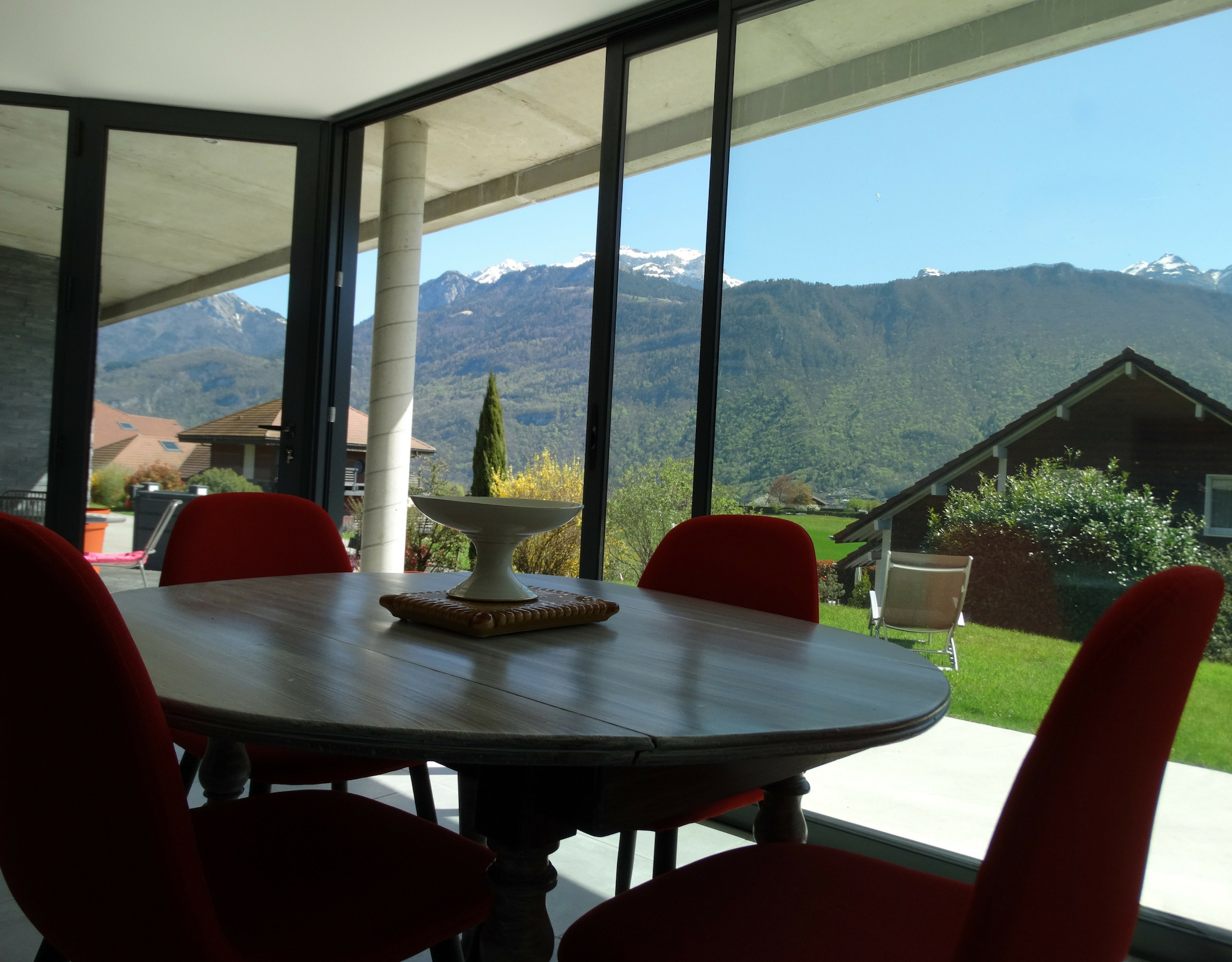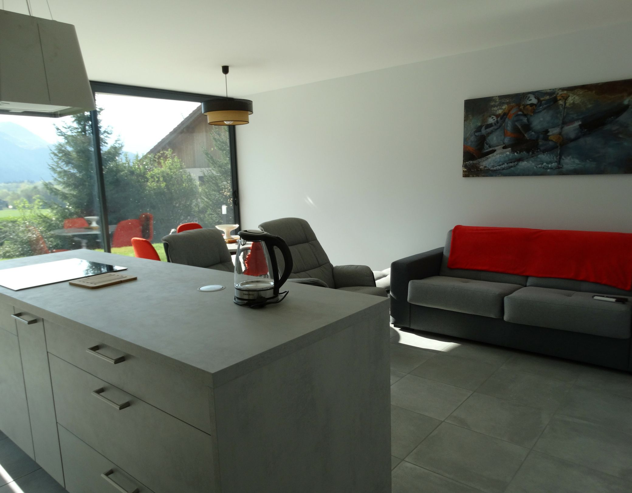 - Lathuile Bout du lac d'Annecy location de vacances Joëlle Thévenin salon baie vitrée Crédit photo : Joëlle Thévenin