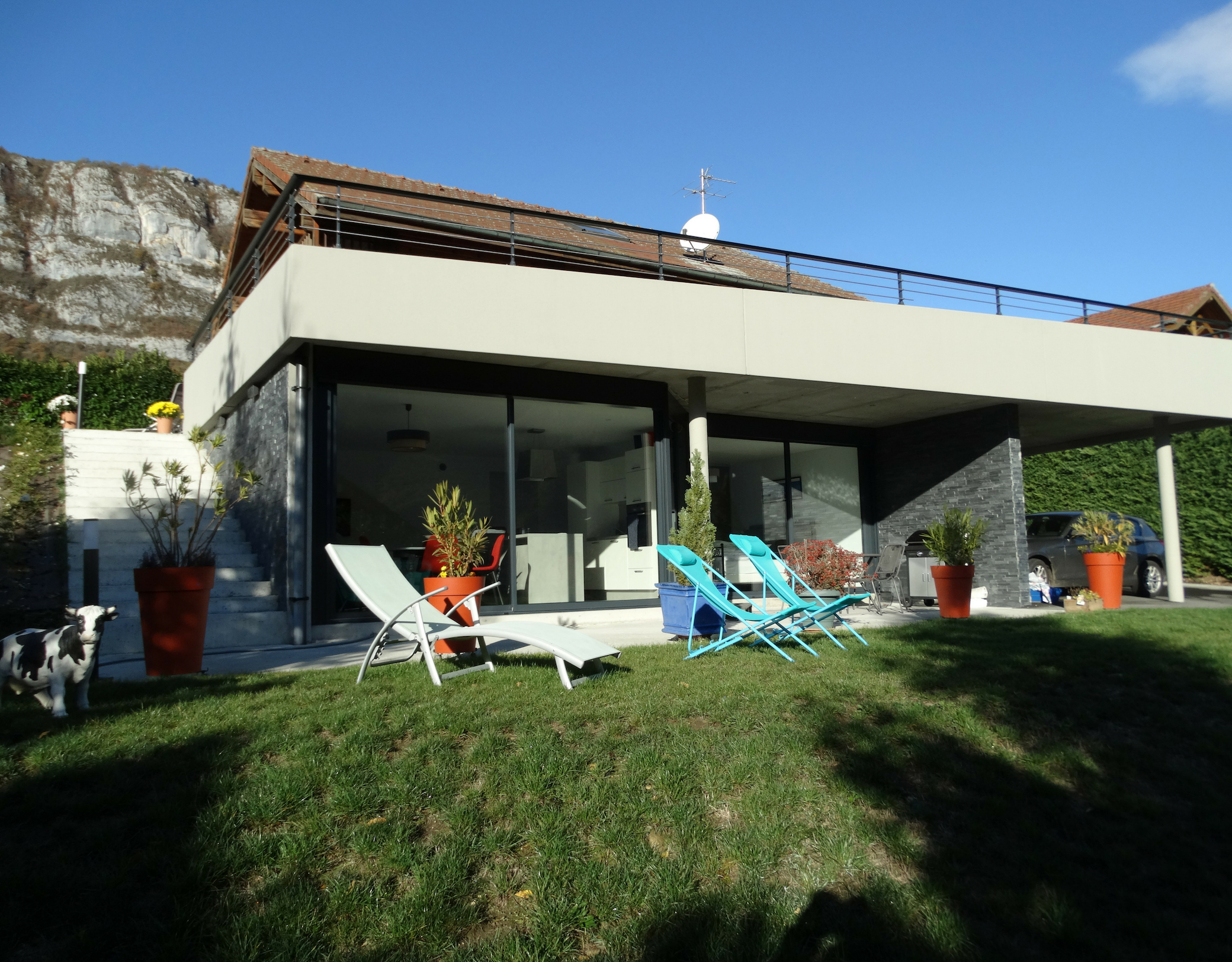 - Lathuile Bout du lac d'Annecy location de vacances Joëlle Thévenin jardin chaises longues Crédit photo : Joëlle Thévenin