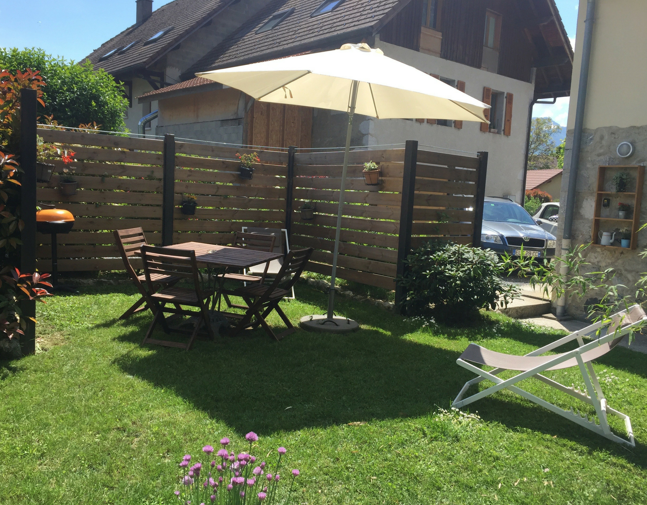 - Location de vacances Le Studio Lathuile terrasse avec parasol et table Crédit photo : SCI La Pelouse