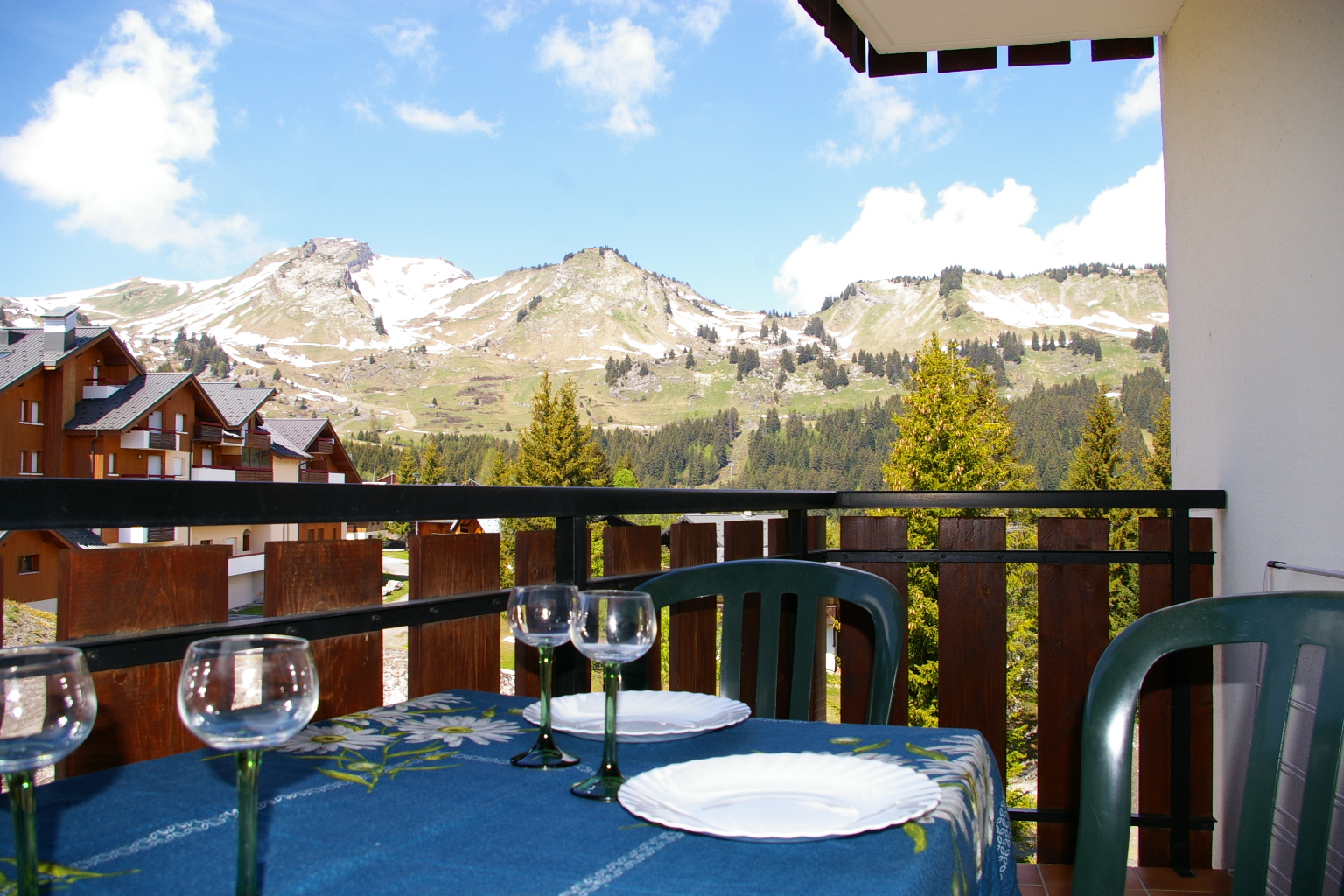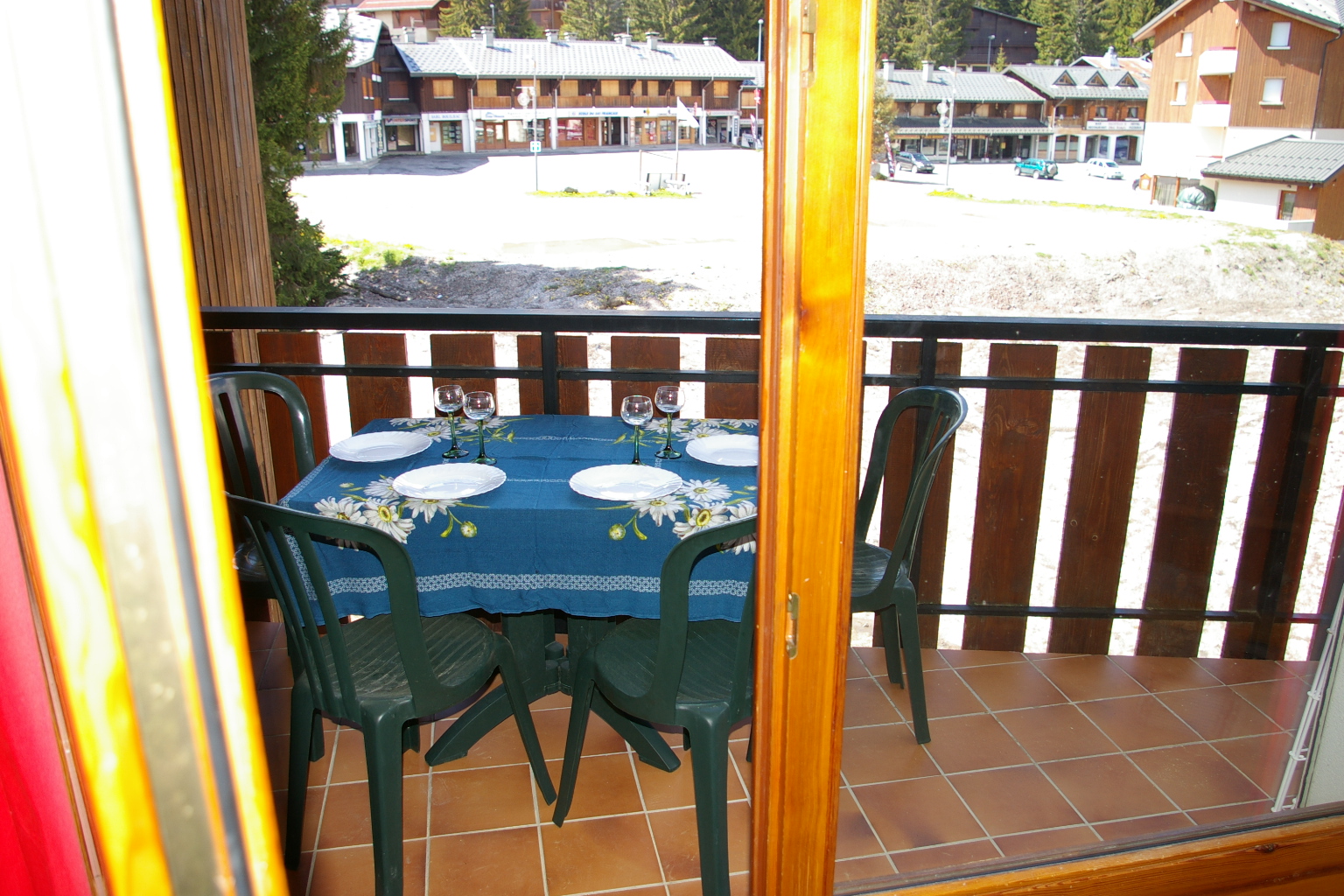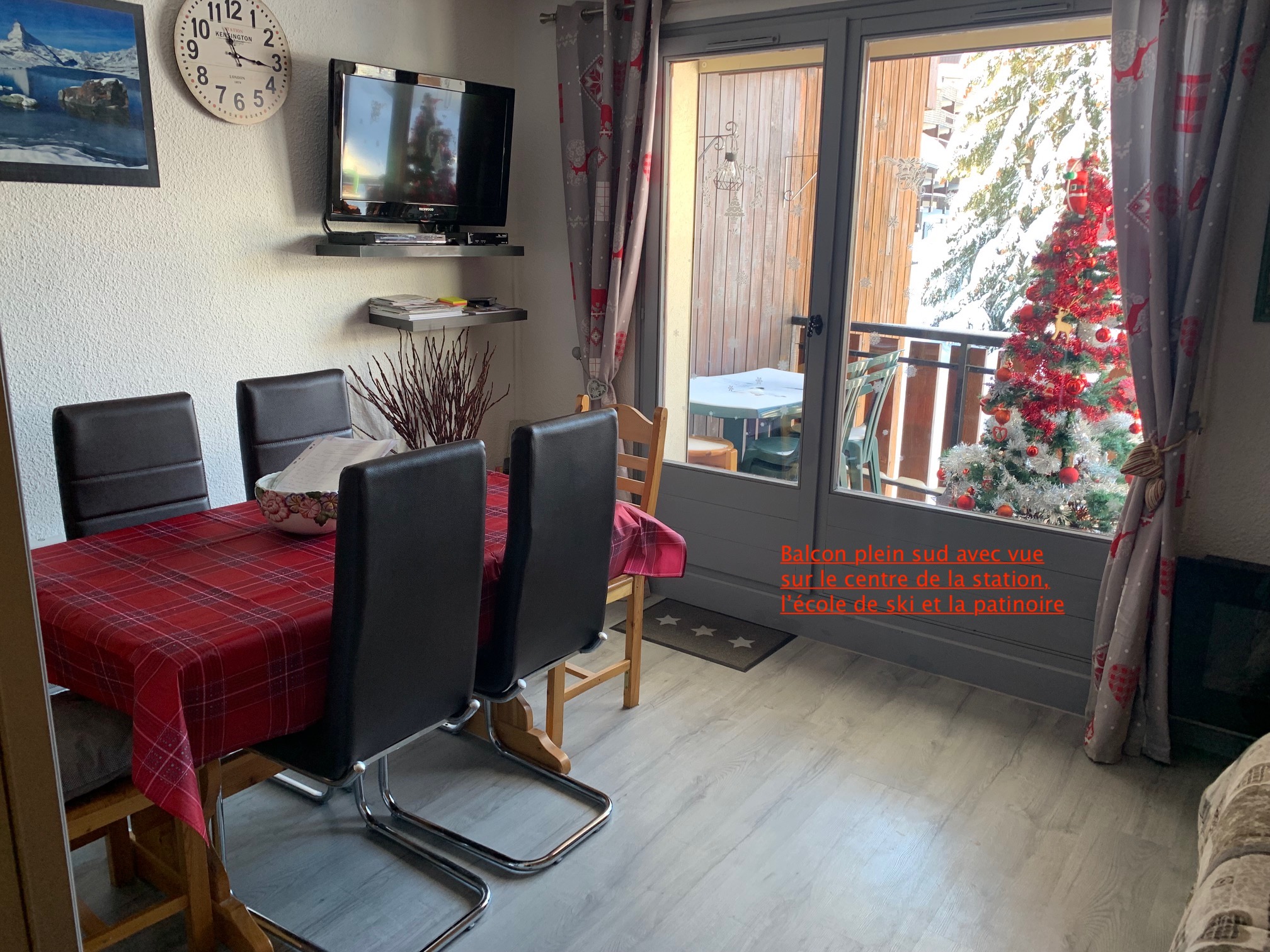 Le séjour s'ouvre vers le balcon pouvant accueillir 6 personnes pour manger avec sa table, son parasol et ses chaises, la vue sur la station et le domaine skiable et au sud, dégagée et sans vis à vis.