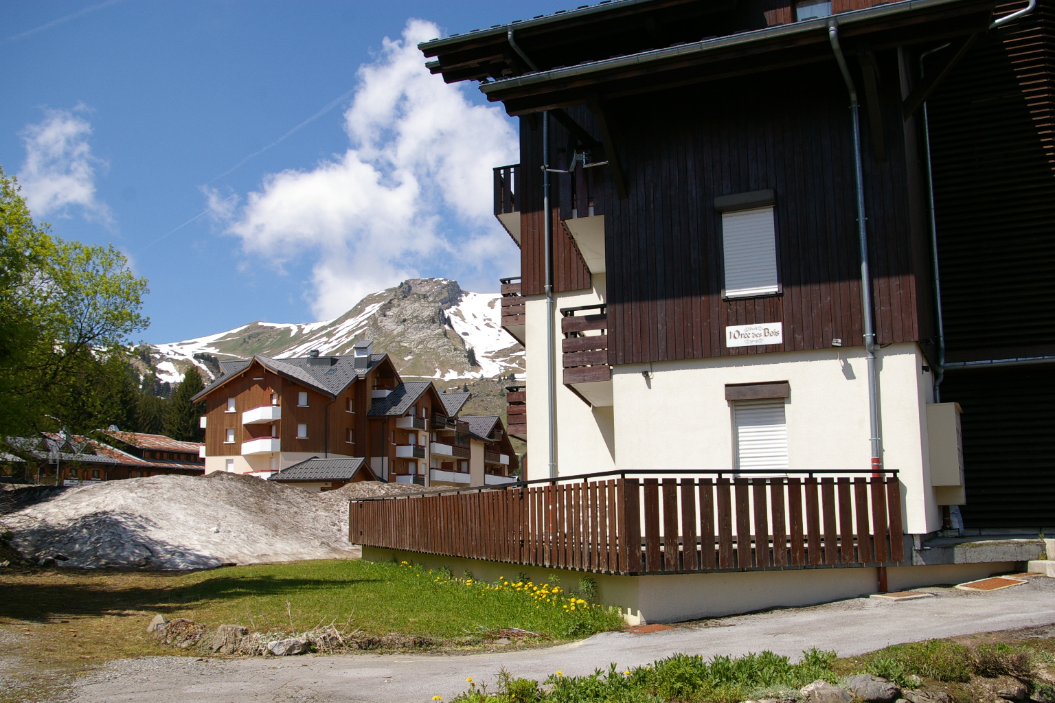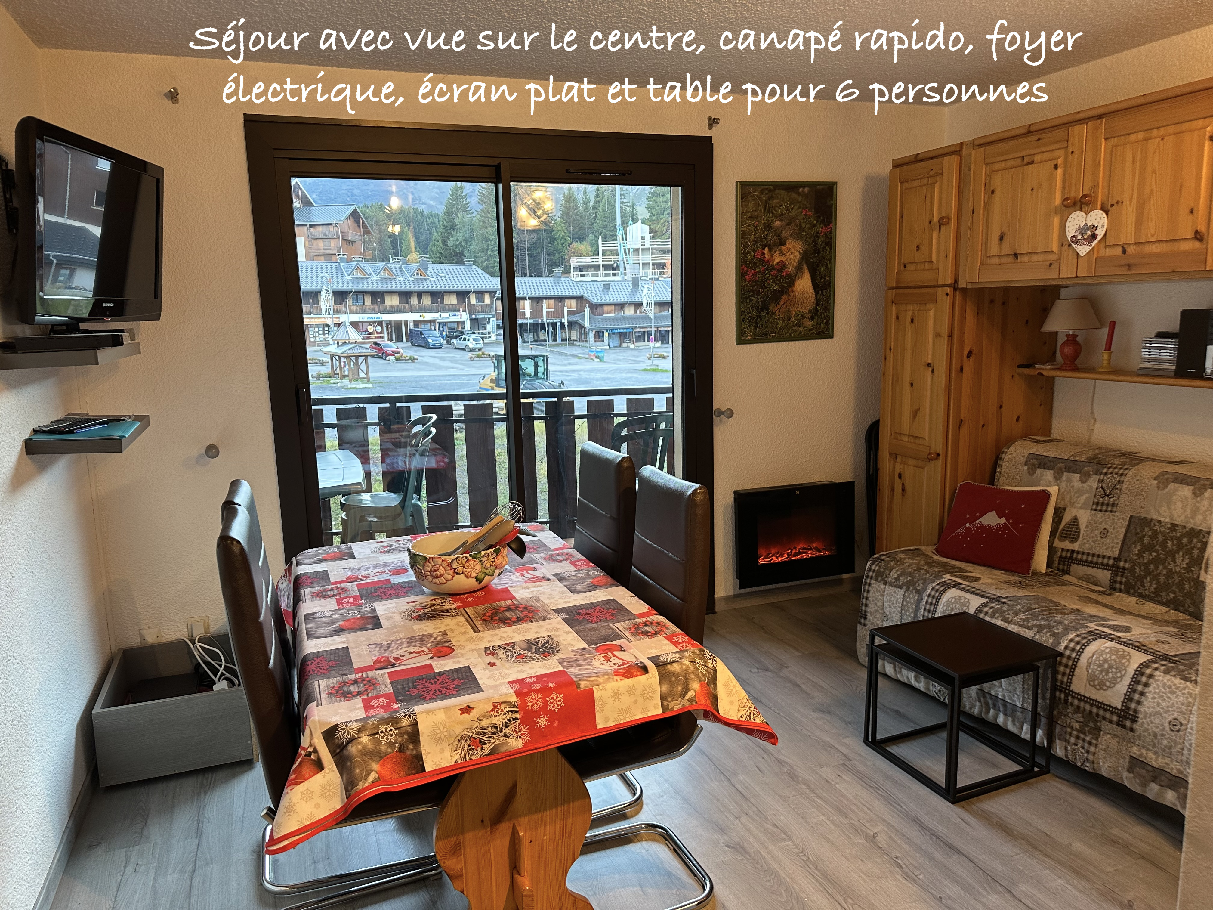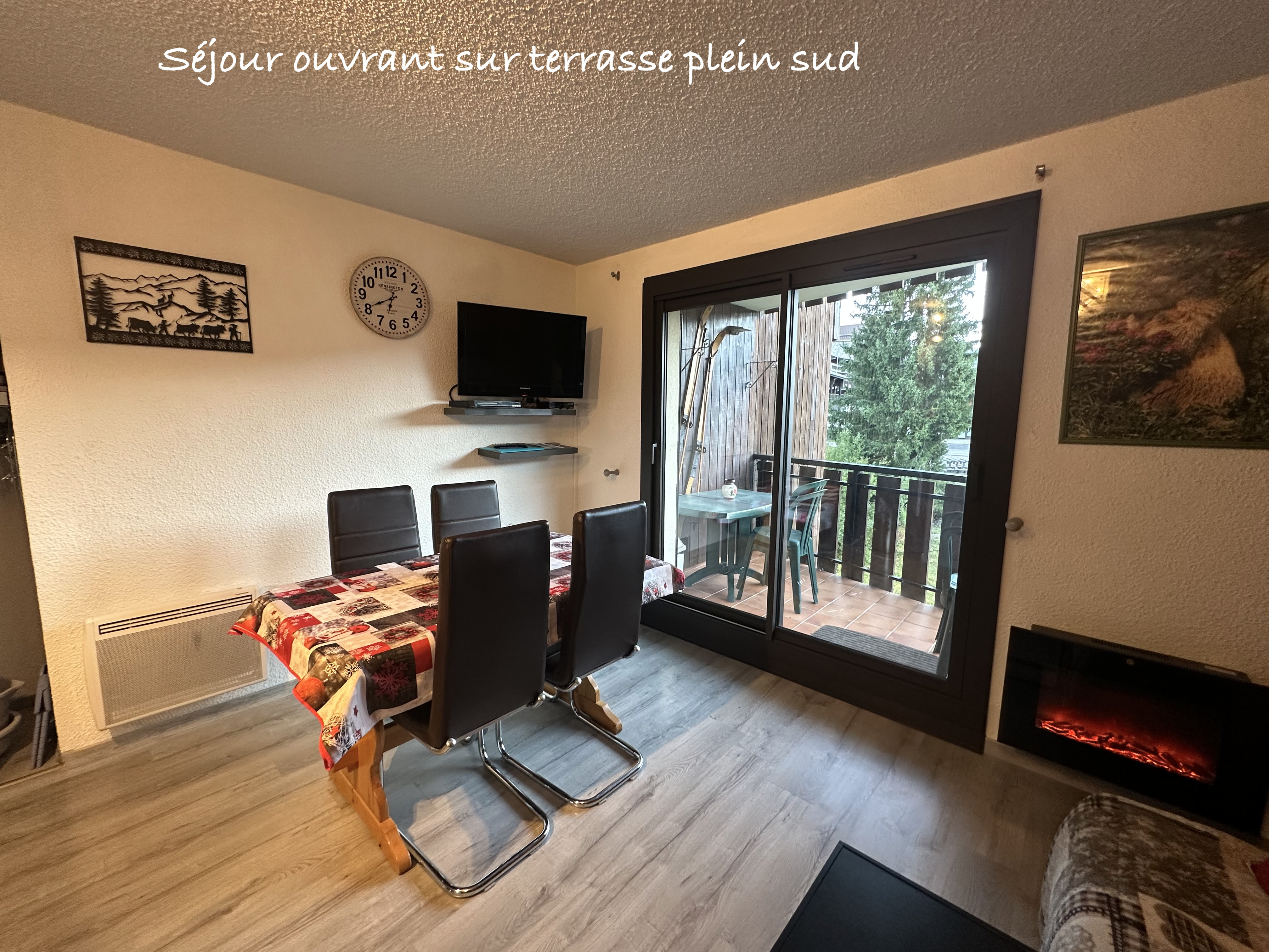 Le séjour s'ouvre vers le balcon pouvant accueillir 6 personnes pour manger avec sa table, son parasol et ses chaises, la vue sur la station et le domaine skiable et au sud, dégagée et sans vis à vis.