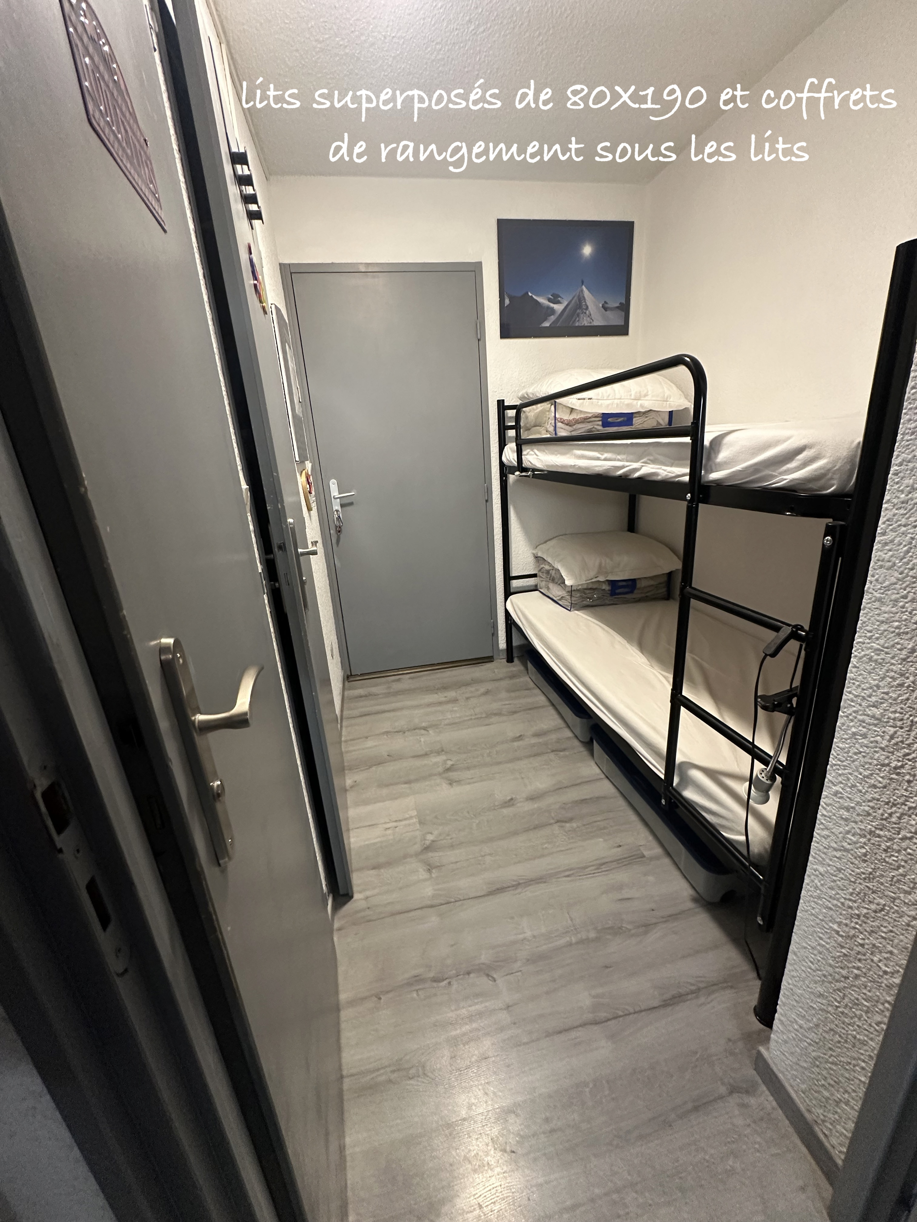 Deux lits superposés de 80 x 190 avec alèses, couvertures et oreiller de 60 x 60.