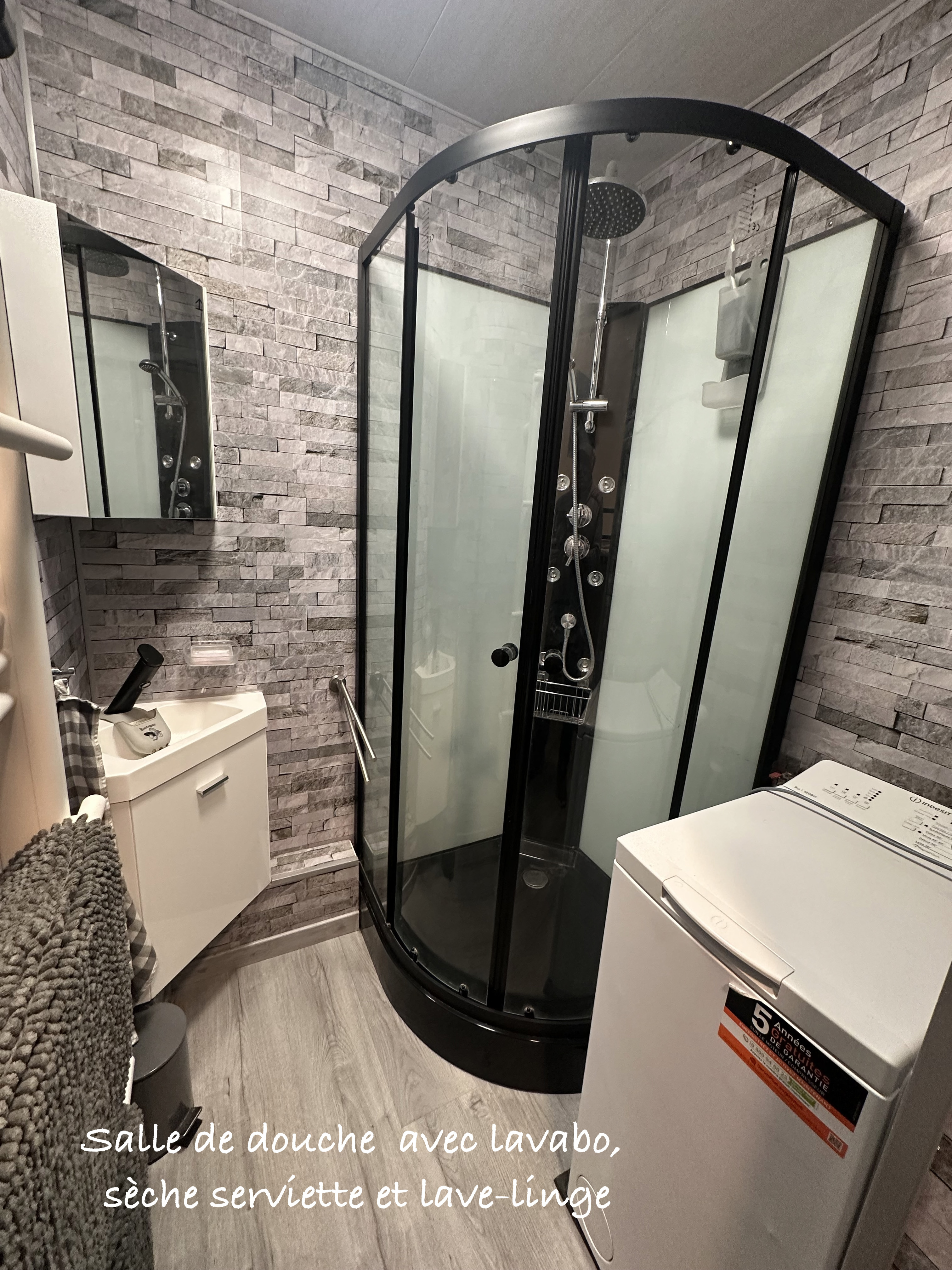 Une porte ouvre sur le coin cuisine avec four et micro-ondes, un petit lave-vaisselle, un frigo avec compartiment congélateur, une cafetière, une bouilloire, un grille-pain, 2 plaques électriques ainsi que la vaisselle et casserole pour 6 personnes.