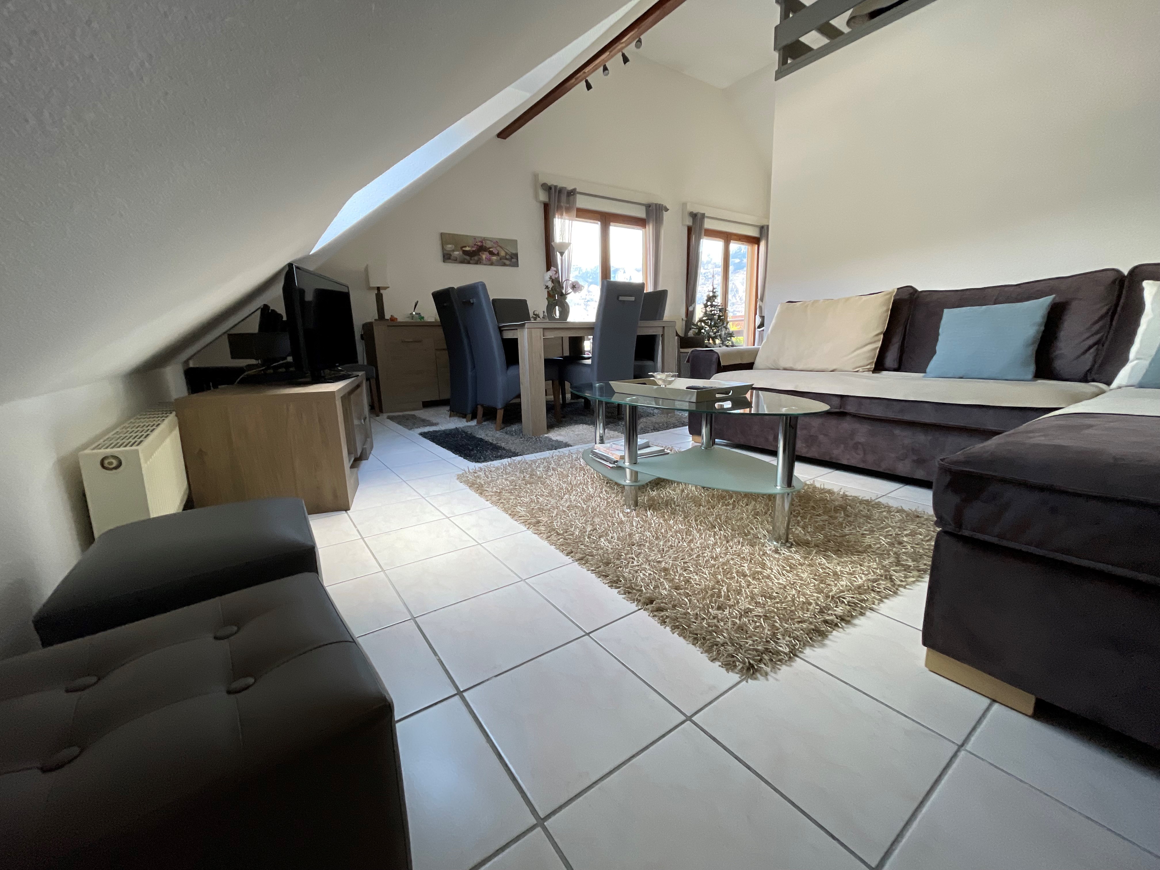 Séjour et coin salon chaleureux. Parking à proximité, garage, local vélos.