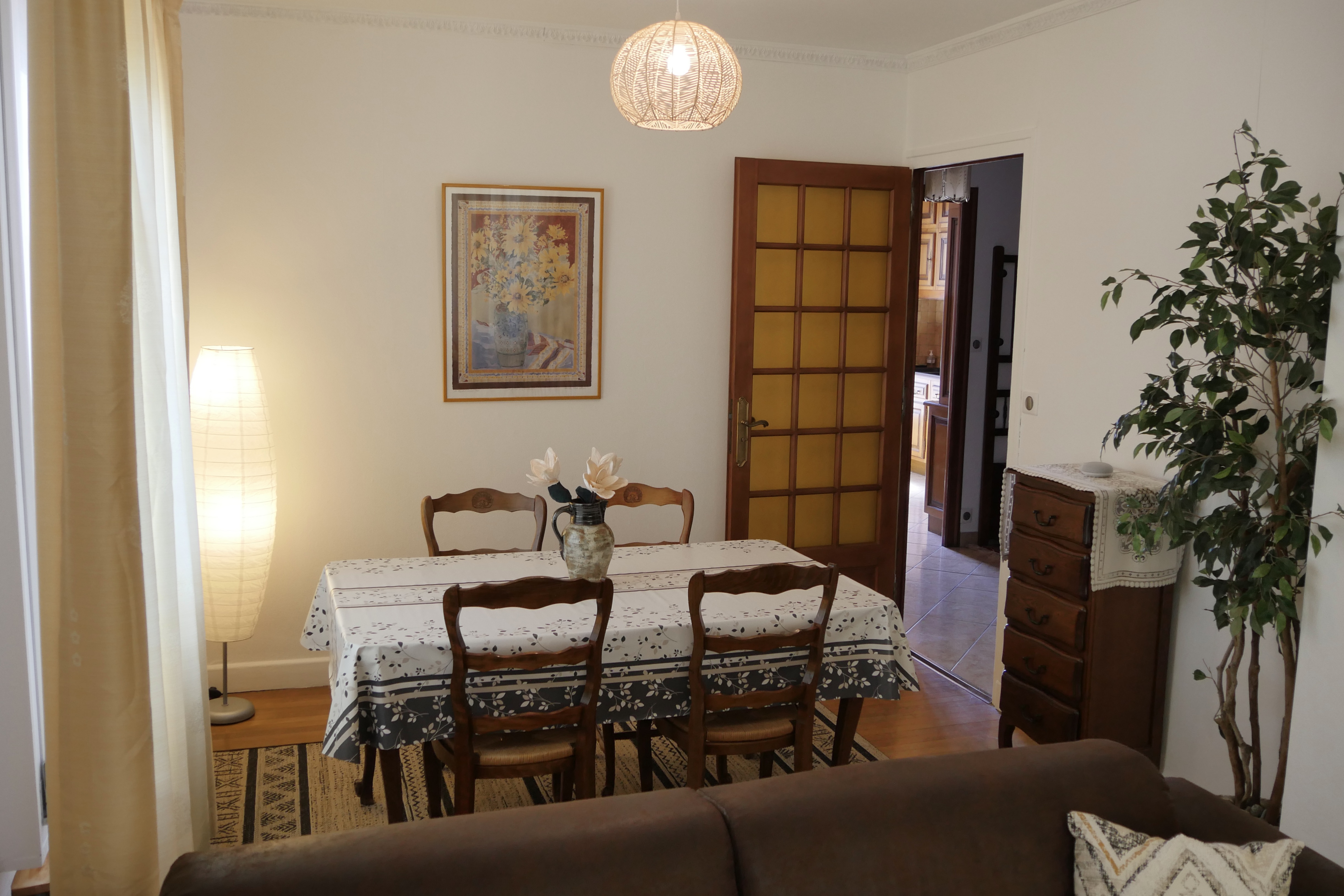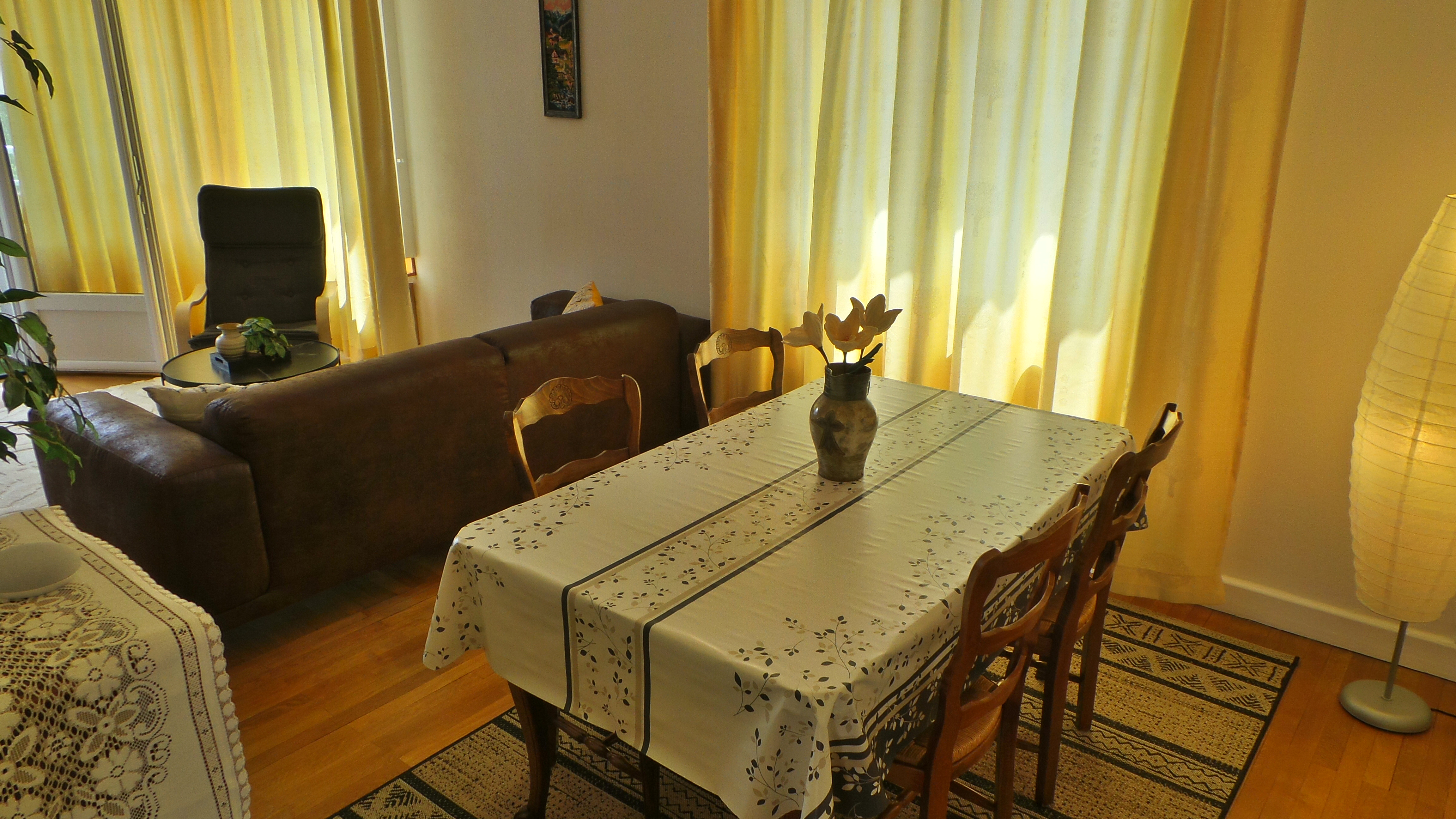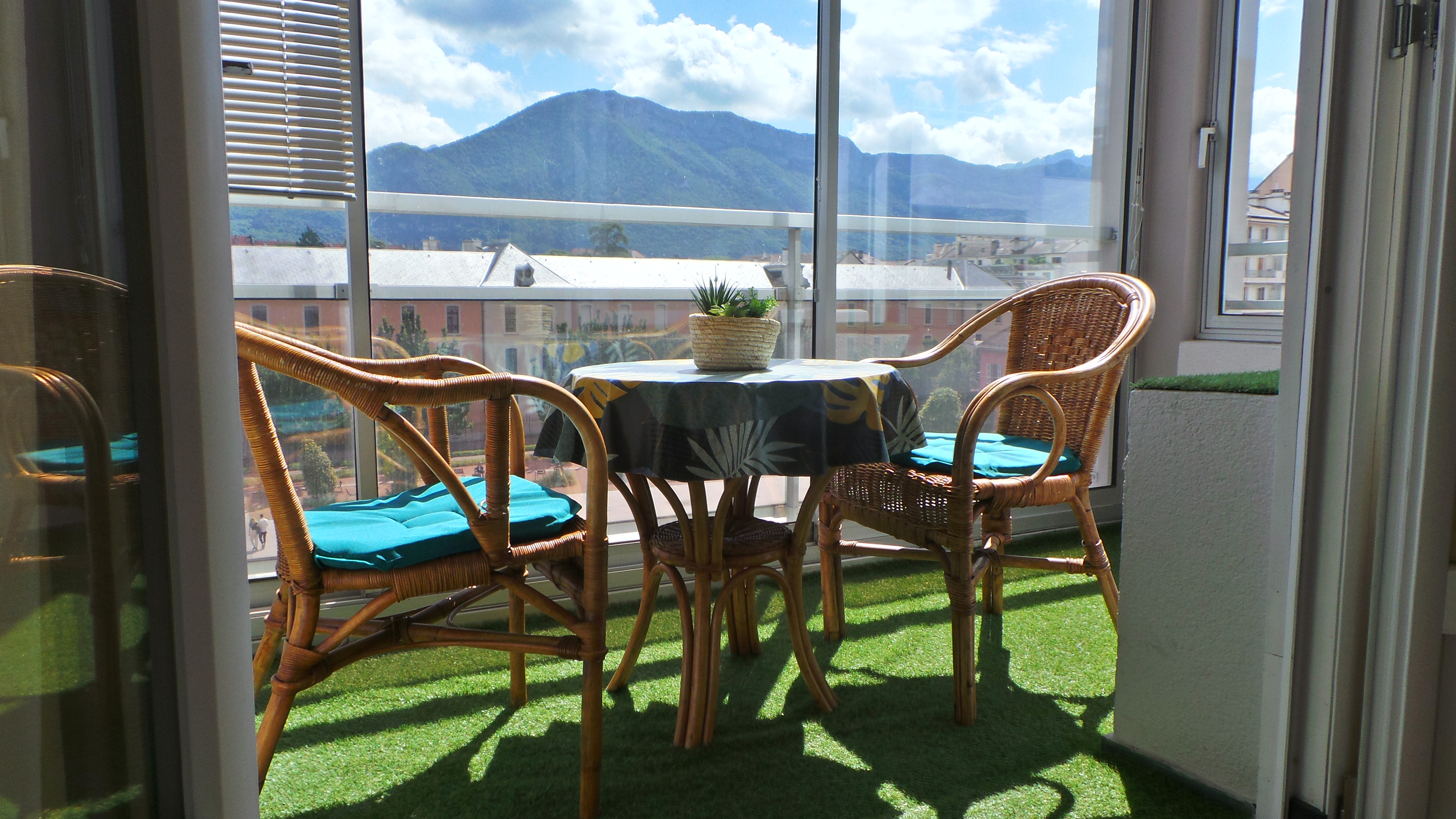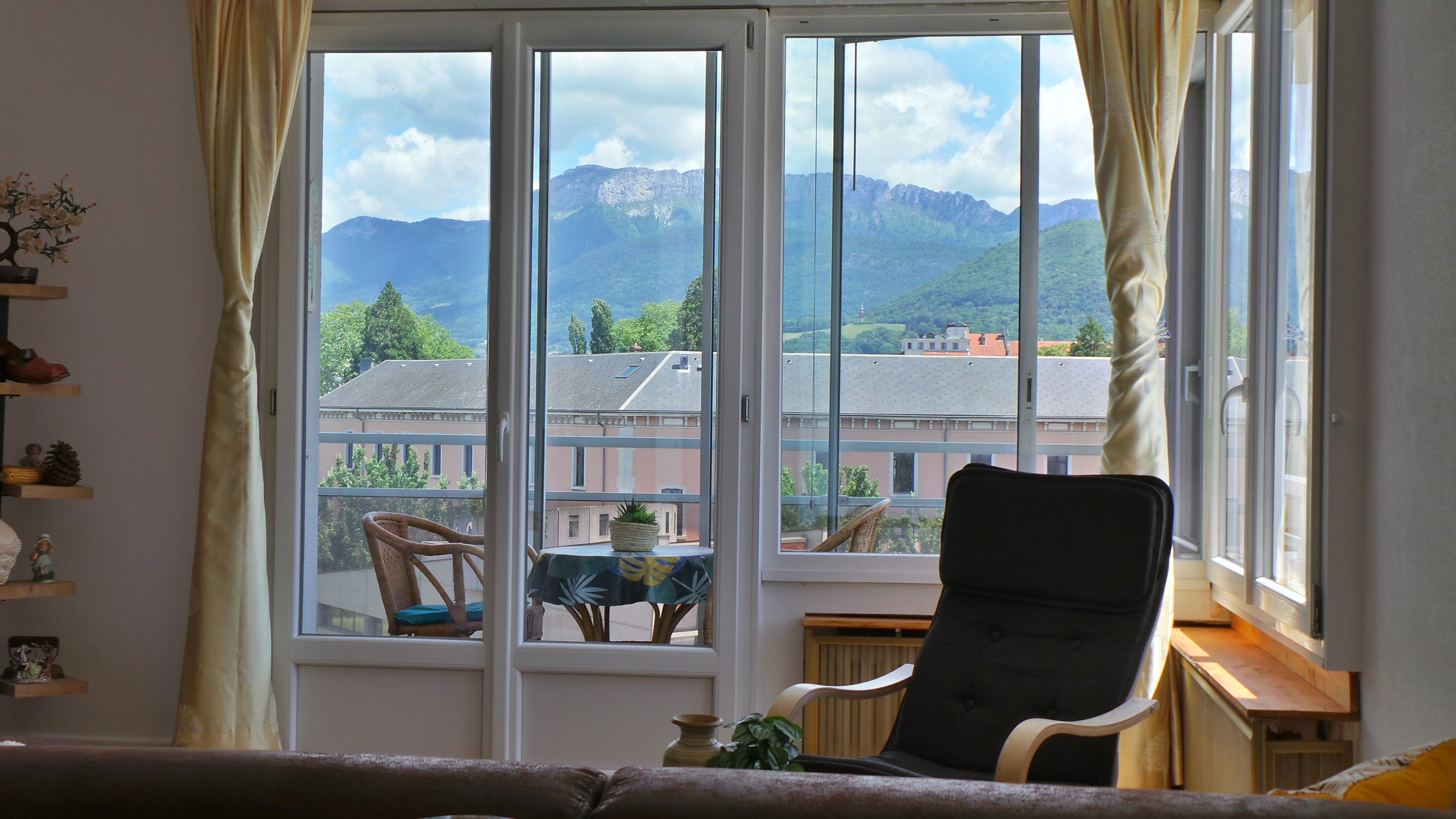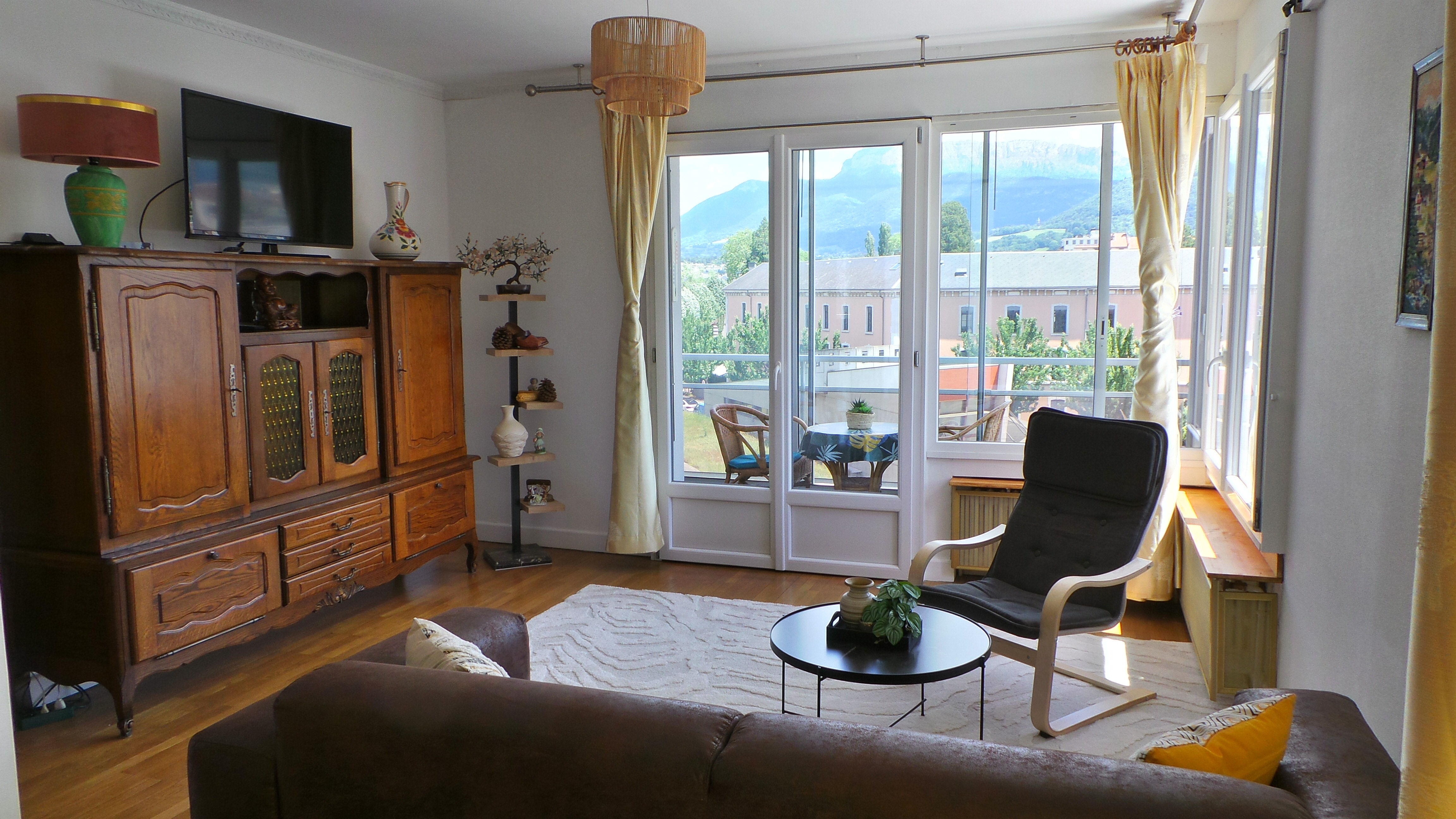 - séjour-salon (23 m2), table, 4 chaises, canapé, fauteuil, table basse, TV connectée 102 cm, internet fibre wifi, vaisselier, ouvert sur loggia orientée soleil levant-montagnes, table ronde, fauteuils en rotin